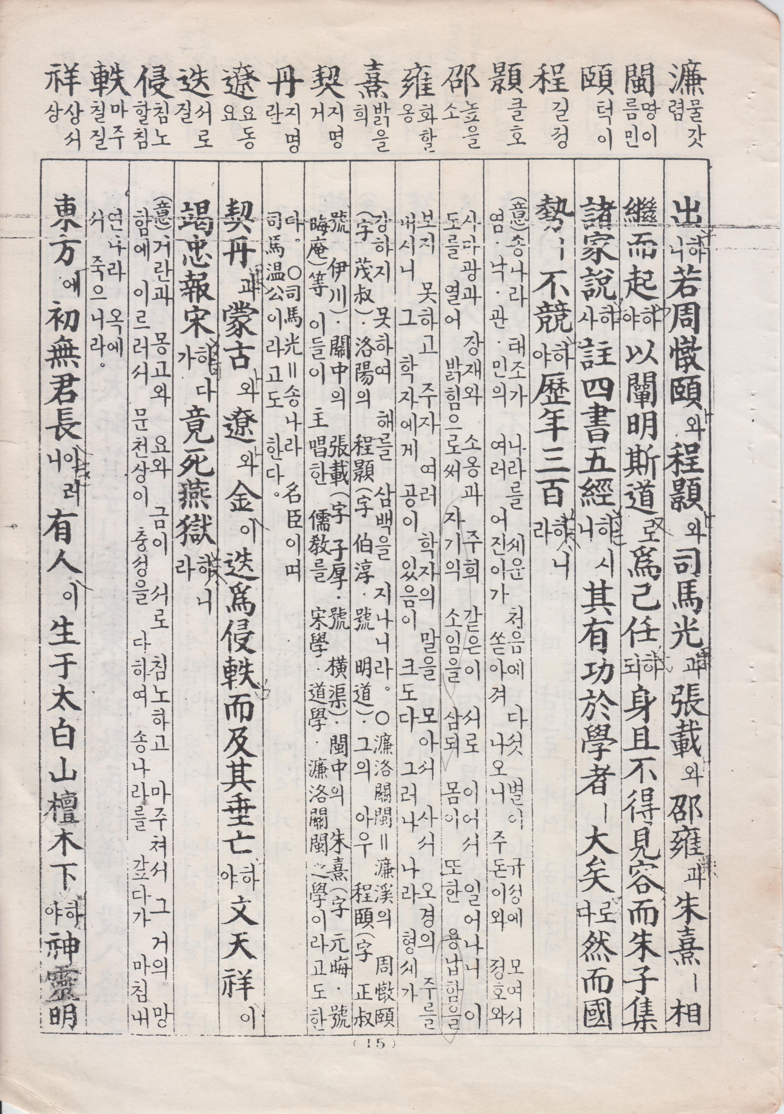 宋太祖立國之初 五星 聚奎 濂洛關閩 諸賢 輩出 若周敦頥 程顥 程頥 司馬光 張載 邵雍 朱熹 相繼而起 以闡明斯道 爲己任 身且不得見容 而朱子集諸家說 註四書五經 其有功於學者 大矣