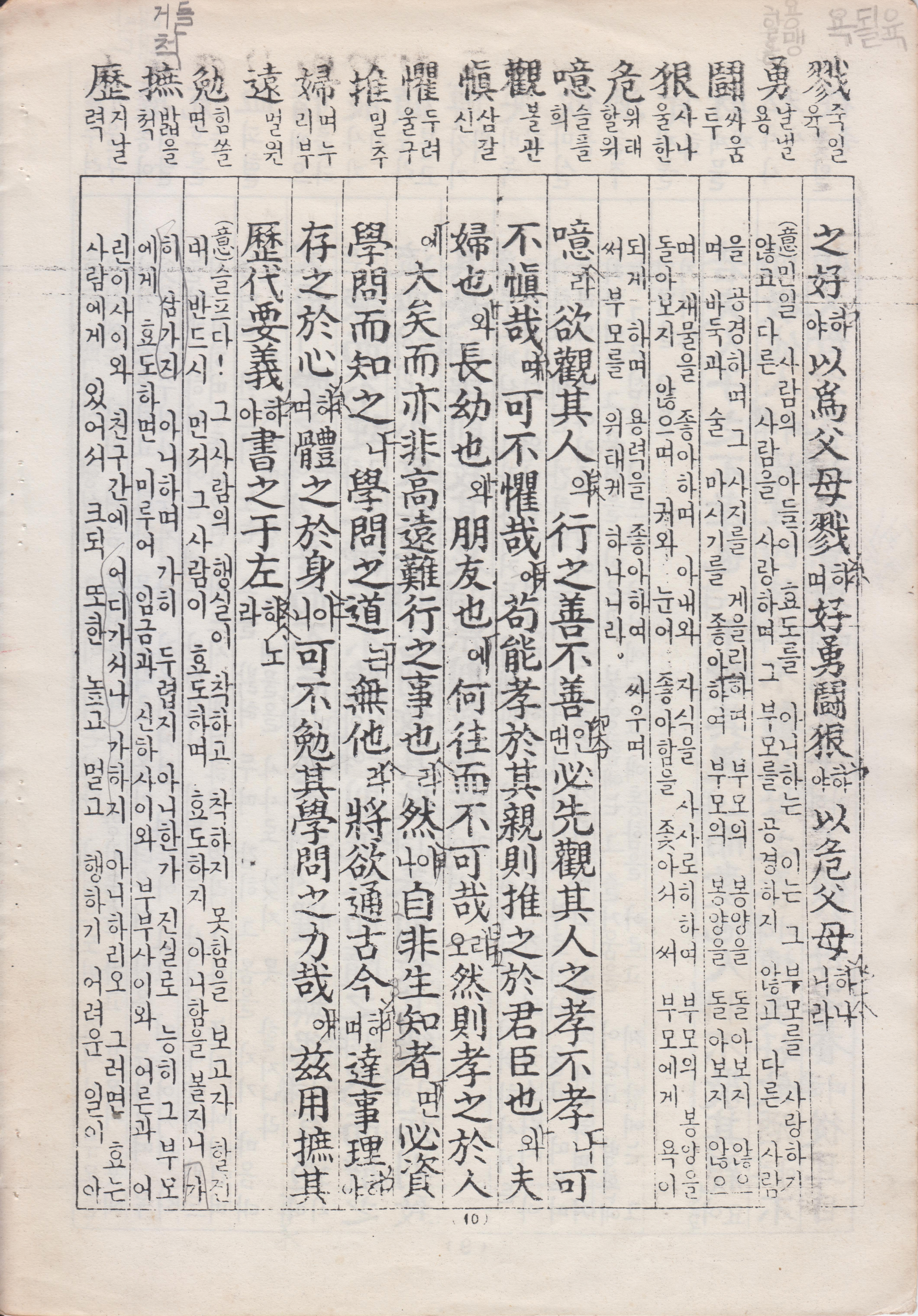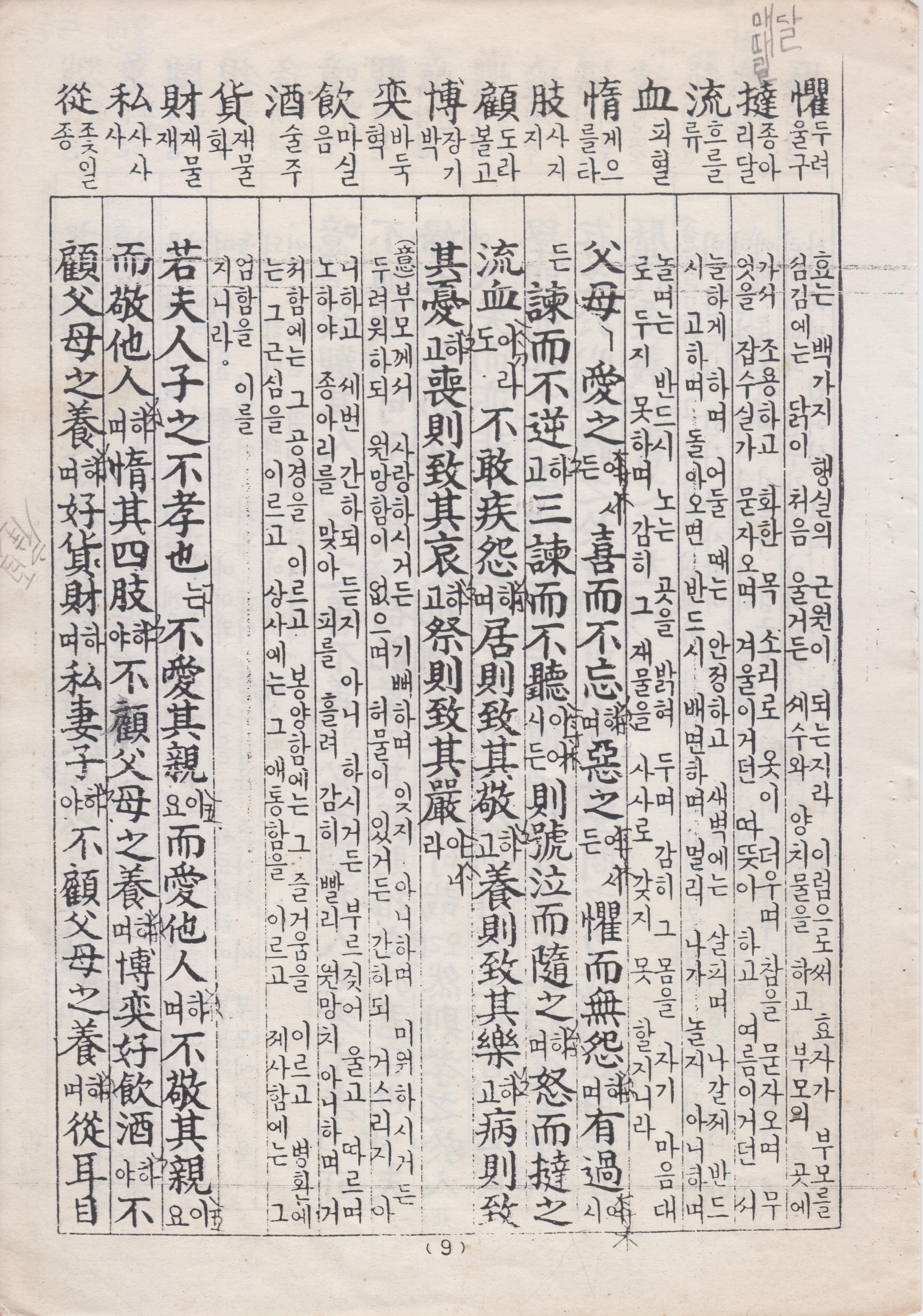 若夫人子之不孝也 不愛其親 而愛他人 不敬其親 而敬他人 惰其四肢 不顧父母之養 博奕好飮酒 不顧父母之養 好貨財 私妻子 不顧父母之養 從耳目之好 以爲父母戮 好勇鬪狠 以危父母