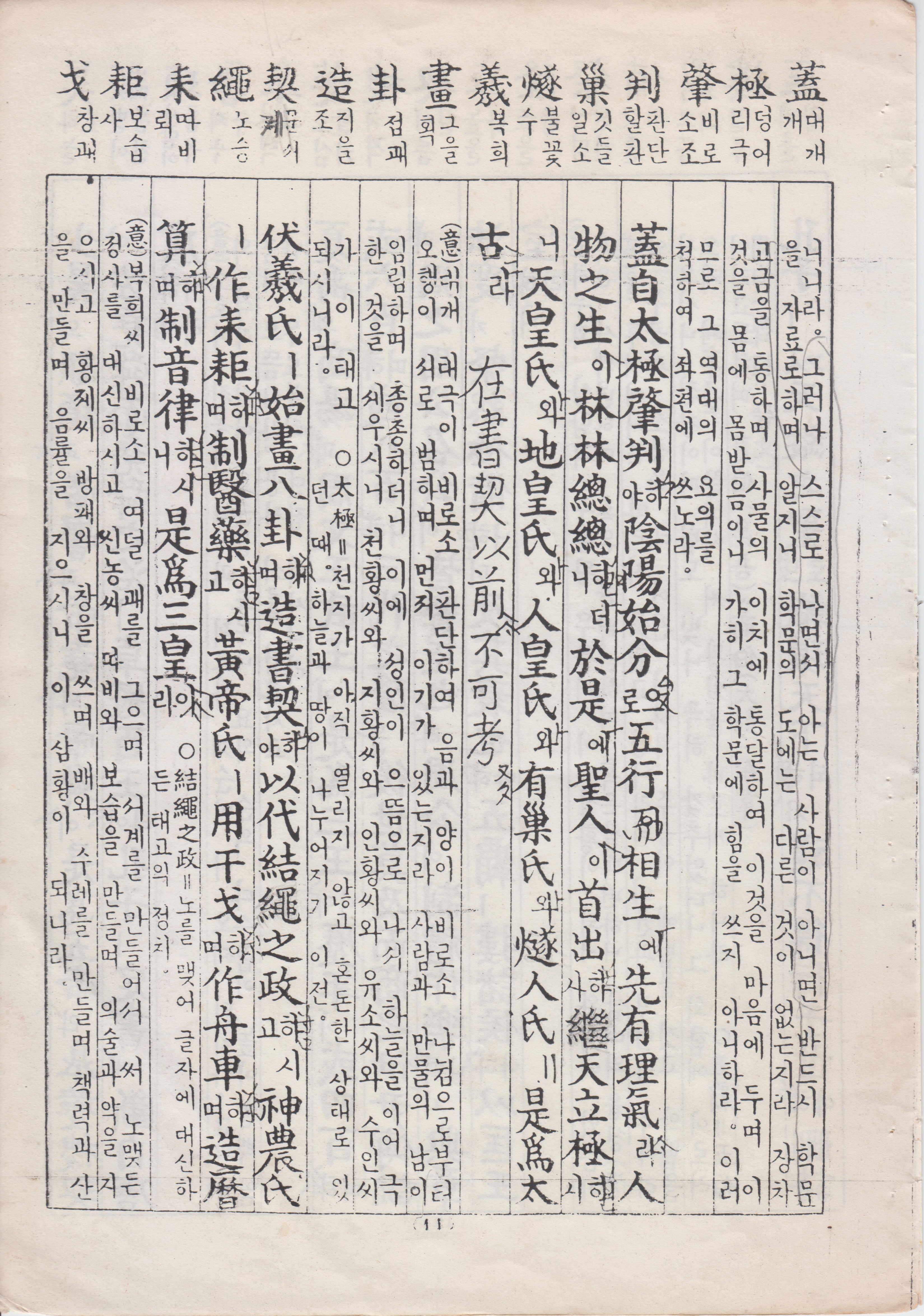蓋自太極肇判 陰陽始分 五行 相生 先有理氣 人物之生 林林總總 於是 聖人 首出 繼天立極 天皇氏 地皇氏 人皇氏 有巢氏 燧人氏 是爲太古 在書契以前 不可考