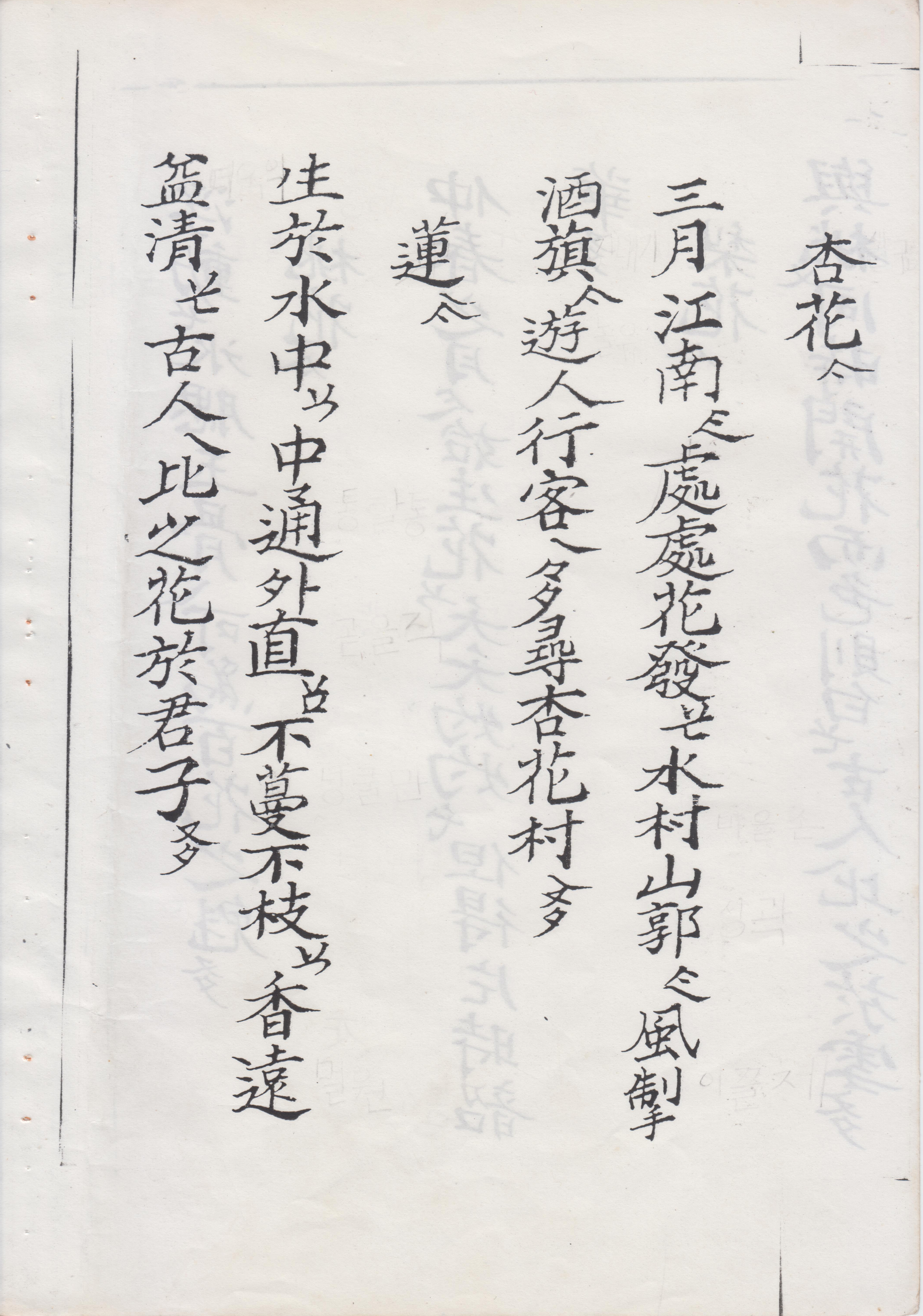 杏花라. 三月江南에 處處花發하고 水村山郭에 風掣酒旗하고 日煖(暖)風和하니 遊人行客이 多尋杏花村이로다.