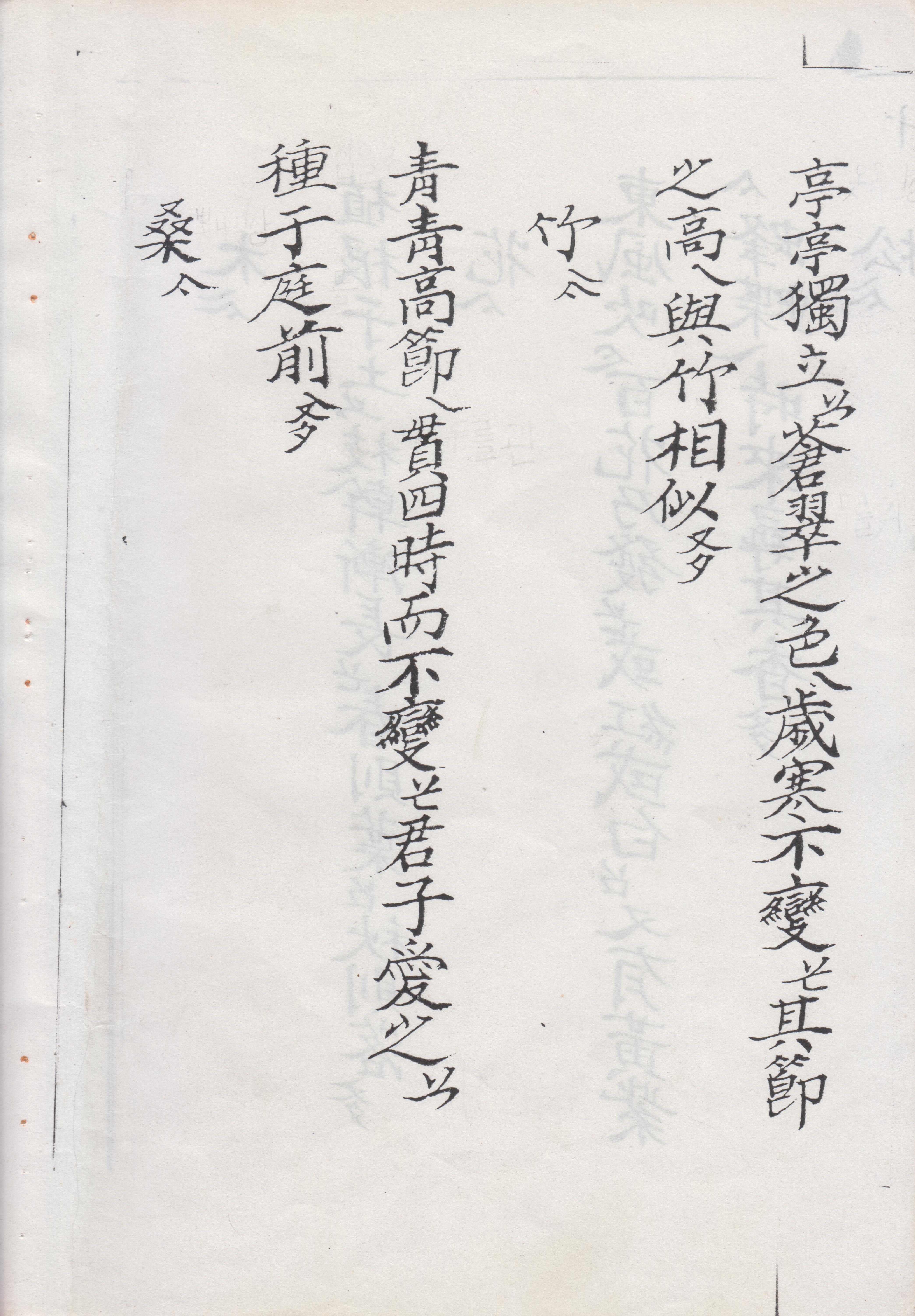 竹이라. 靑靑高節이 貫四時而不變하고 君子愛之하여 種于園圃로다.