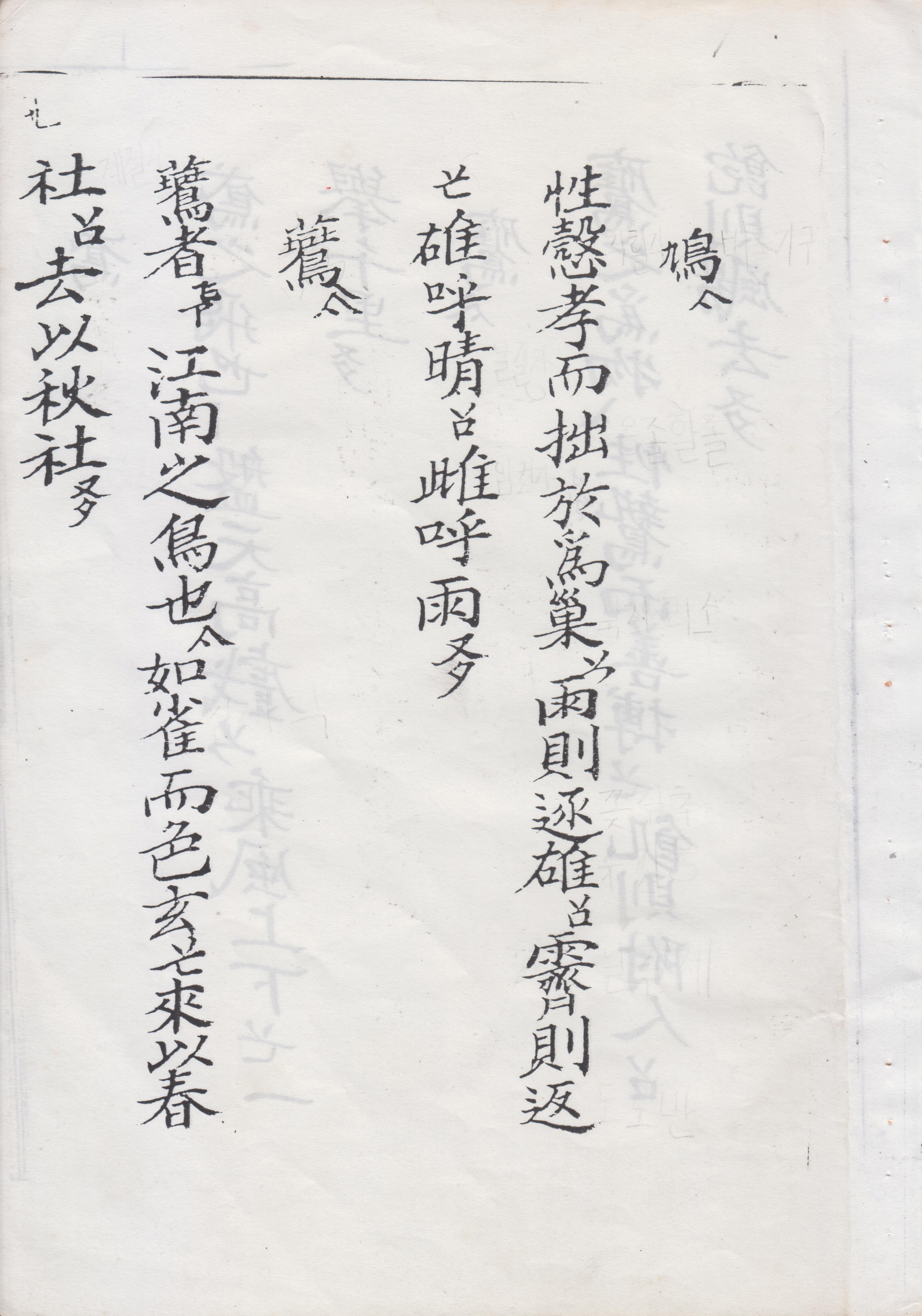 燕이라. 燕者는 江南之鳥也라. 雌雄于飛하여 字母有別하고 含泥爲巢하며 含蟲哺子하고 其音喃喃하며 呴呴相樂하고 其尾涎涎하니 春社則來하고 秋社則去로다.