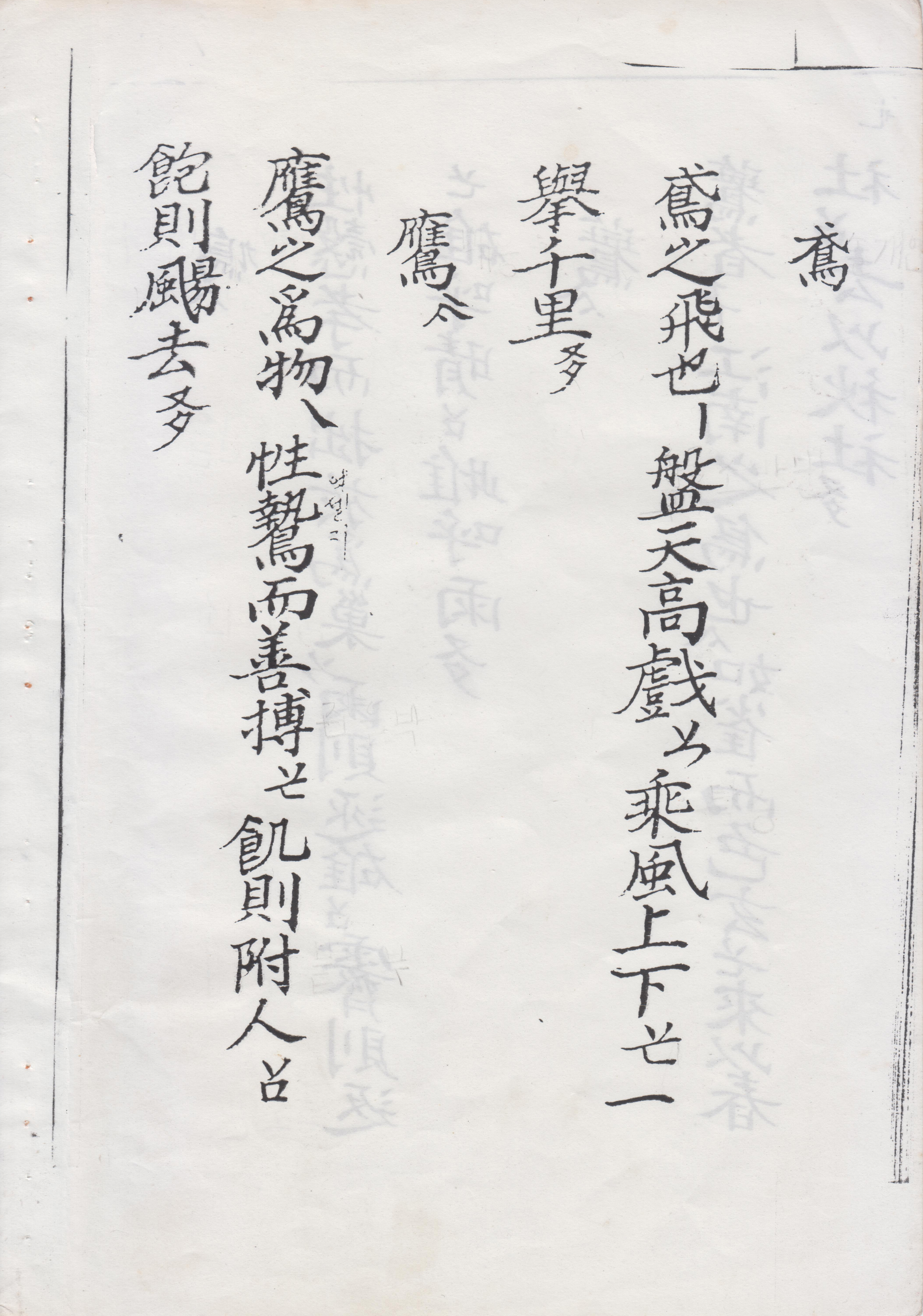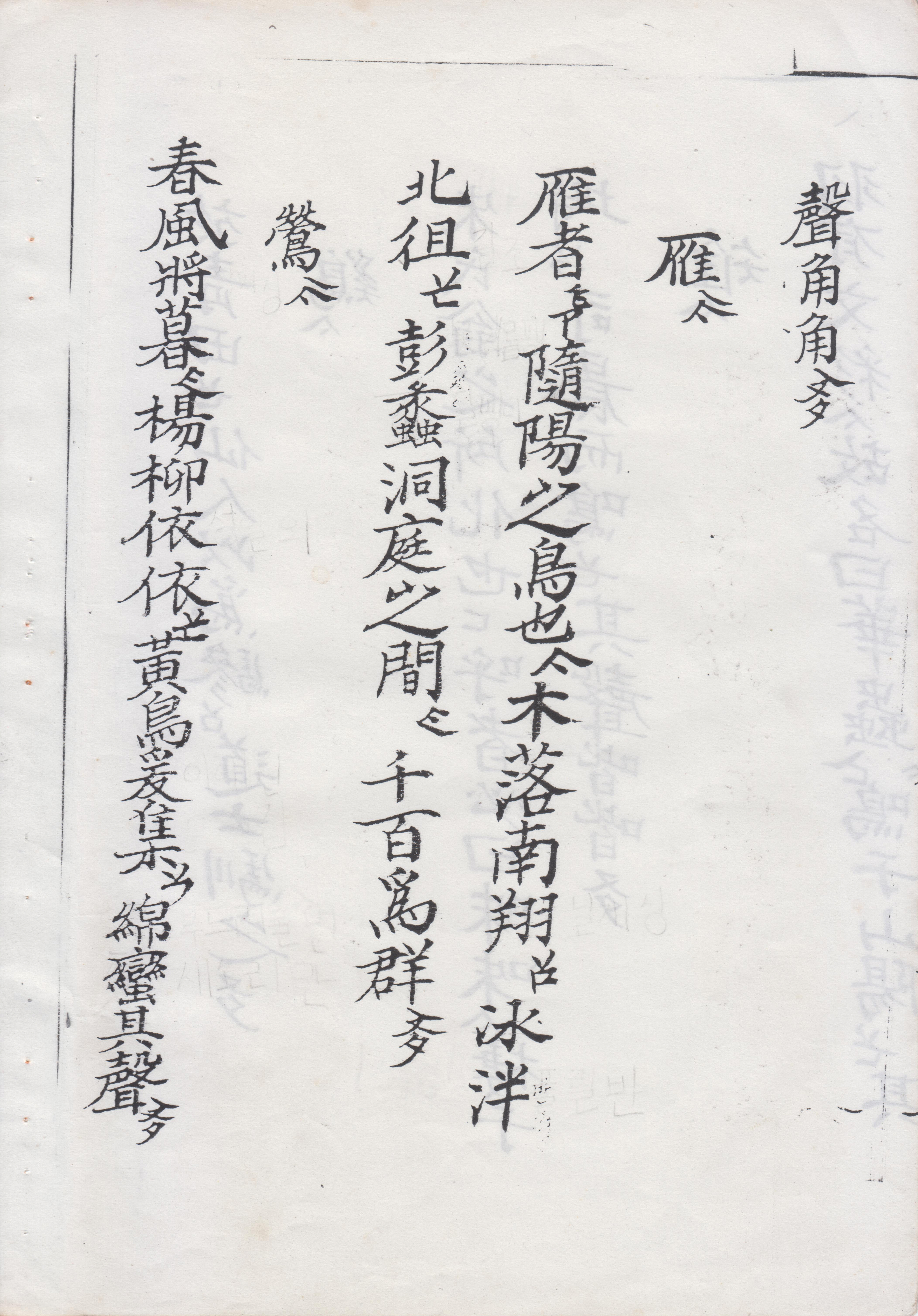 雁이라. 雁者隨陽之鳥也라. 木落南翔하고 氷解北徂하니 彭蠡洞庭之間에 千萬其群이로다.