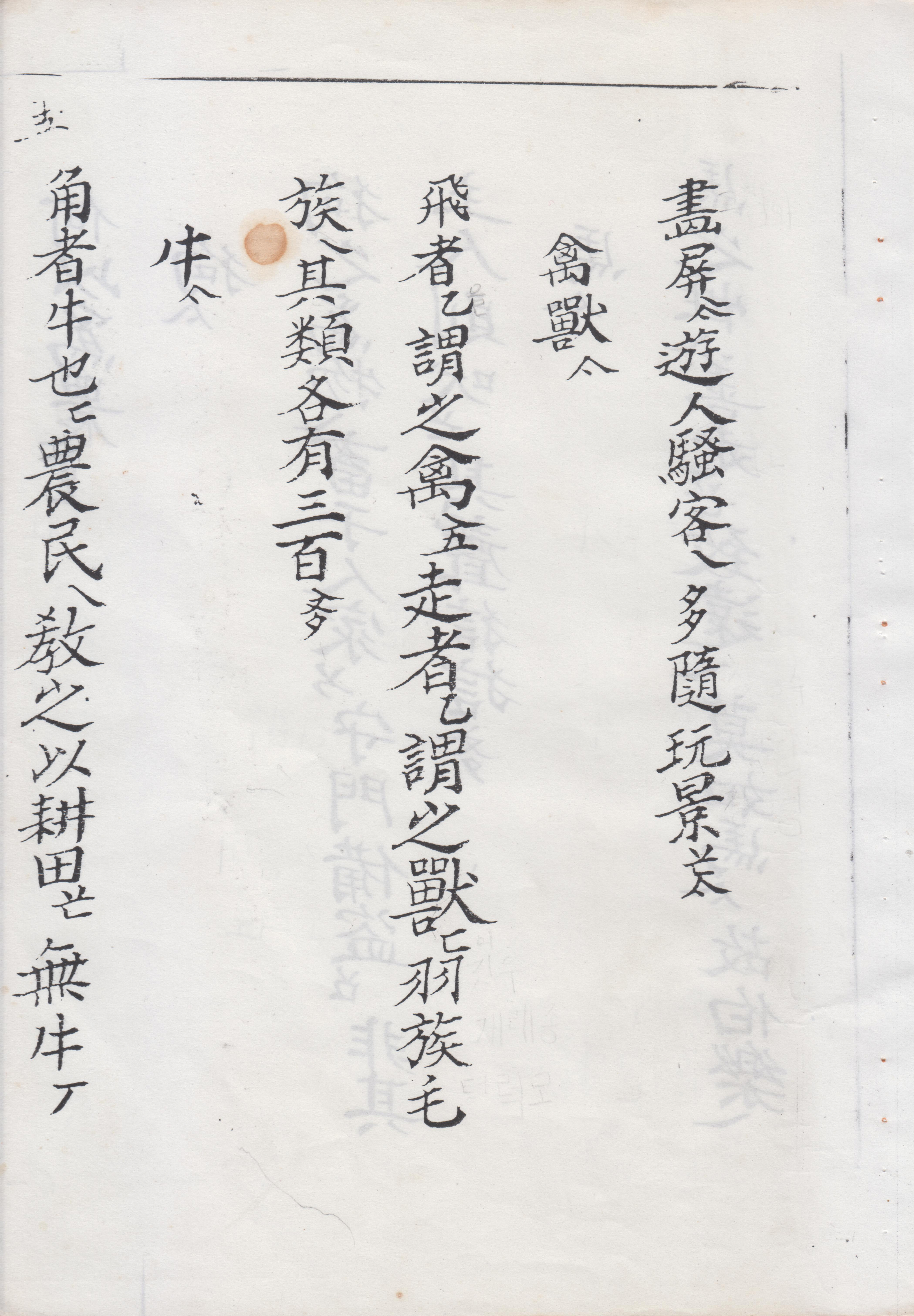 禽獸魚蟲이라. 有羽翼飛者를 謂之禽이오 有蹄角走者를 謂之獸이요 有鱗介游者를 謂之魚이니 羽族毛族鱗族이 其類各有三百이로다.