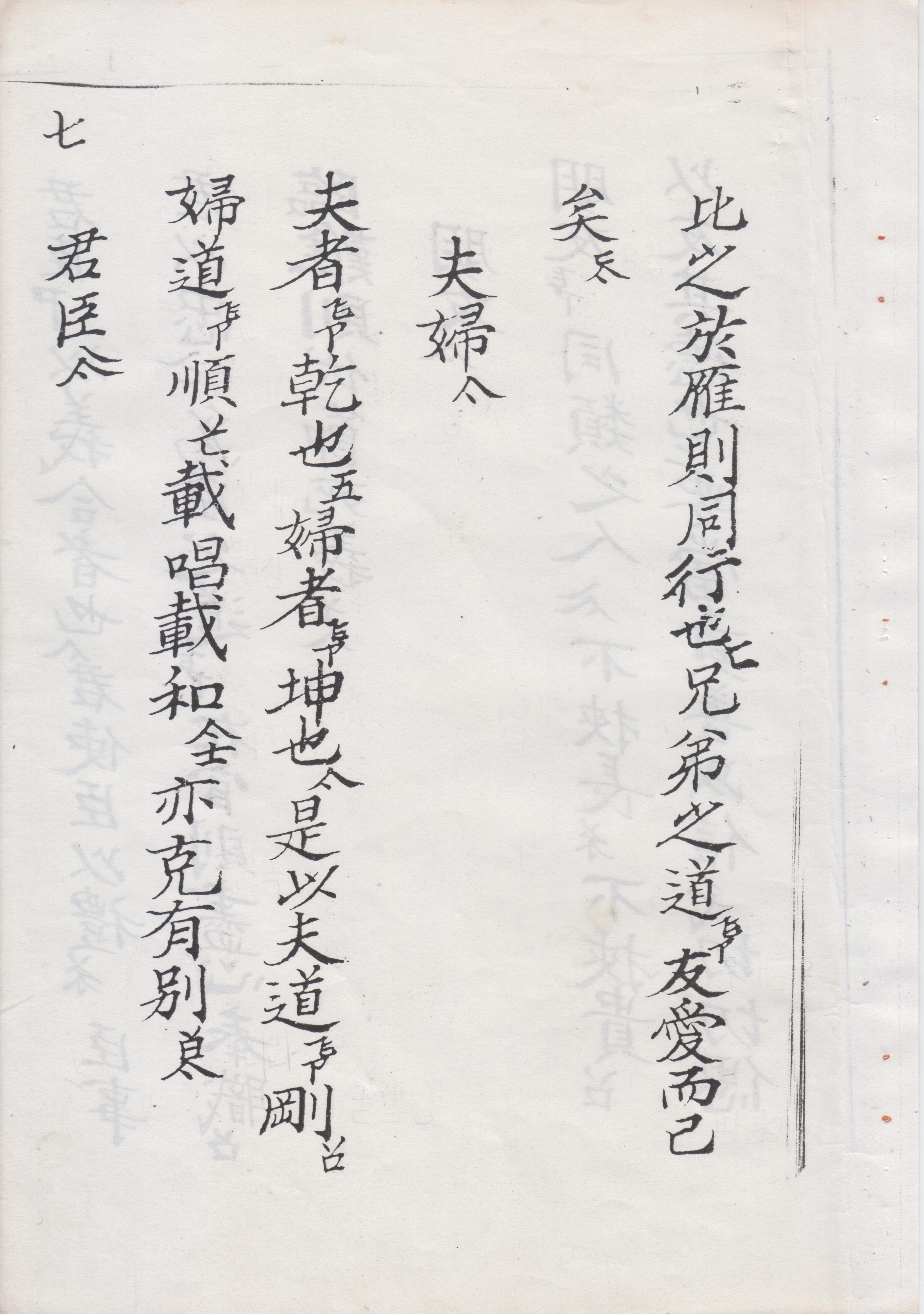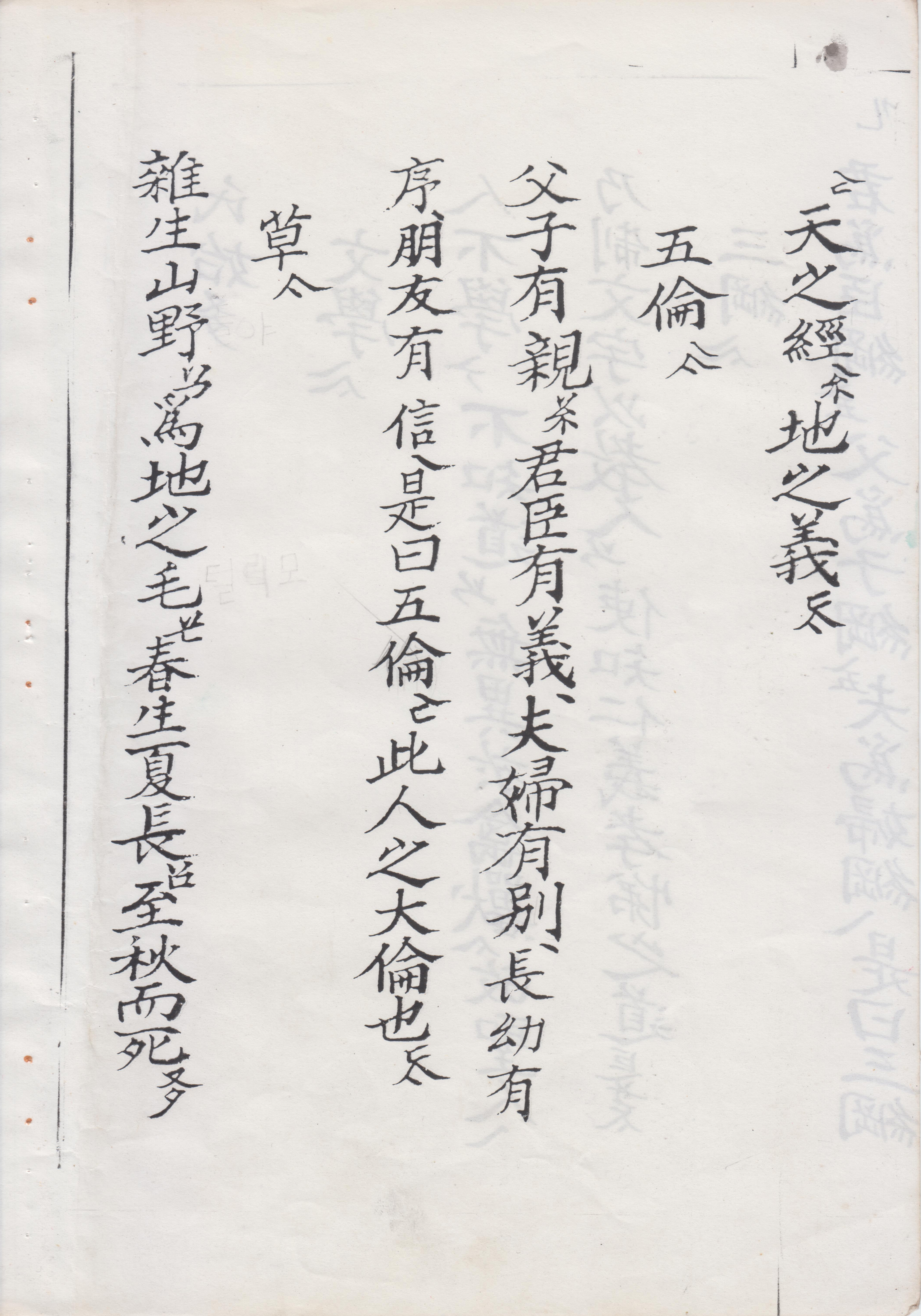 五倫이라. 天生萬民에 命厥五倫하니 曰, 父子有親하며 君臣有義하며 夫婦有別하며 長幼有序하며 朋友有信이니라.