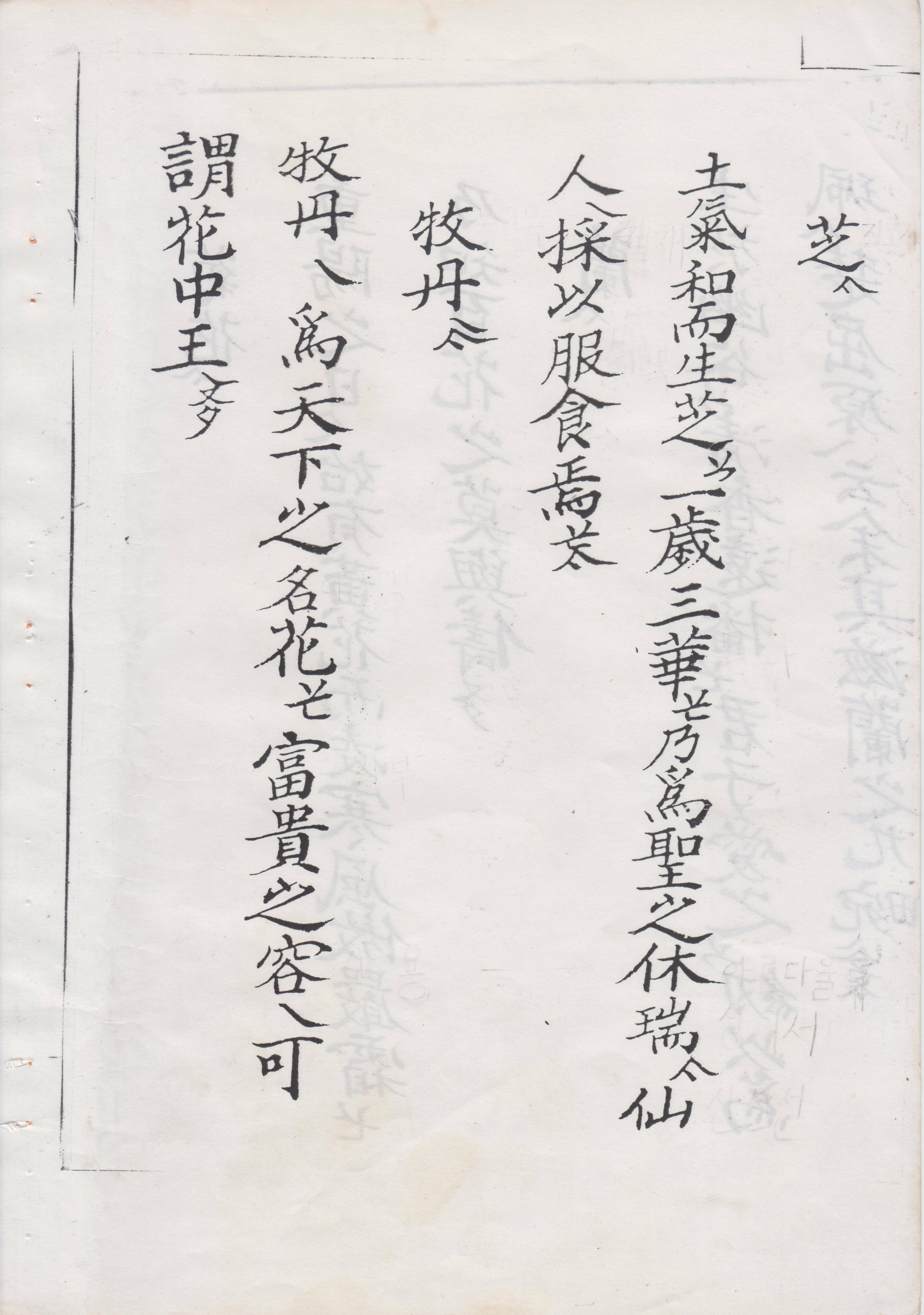 牧丹花라. 東風吹에 牧丹盛開하며 其色丹하고 其姿美하야 號曰, 花之富貴者요 無雙第一國香하니 其是花中王이라하고 用於藥材로다.
