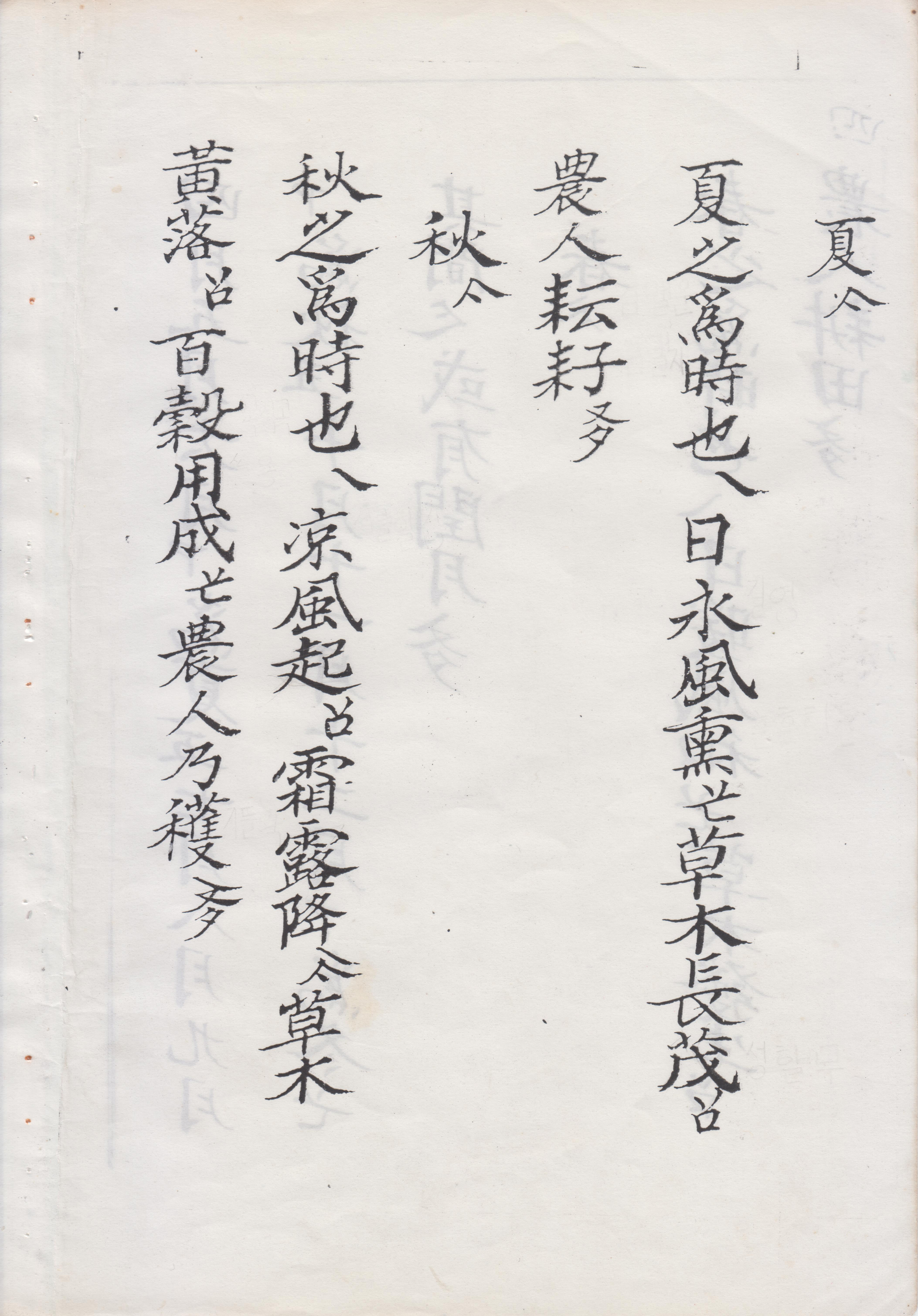 夏라. 四月五月六月이 爲夏니 是時에 南風이 薰薰하여 草木이 茂盛하니 其神曰赤帝로다. 夏之爲時也日永風薰하여 草木長茂하고 鳥獸希革이로다.