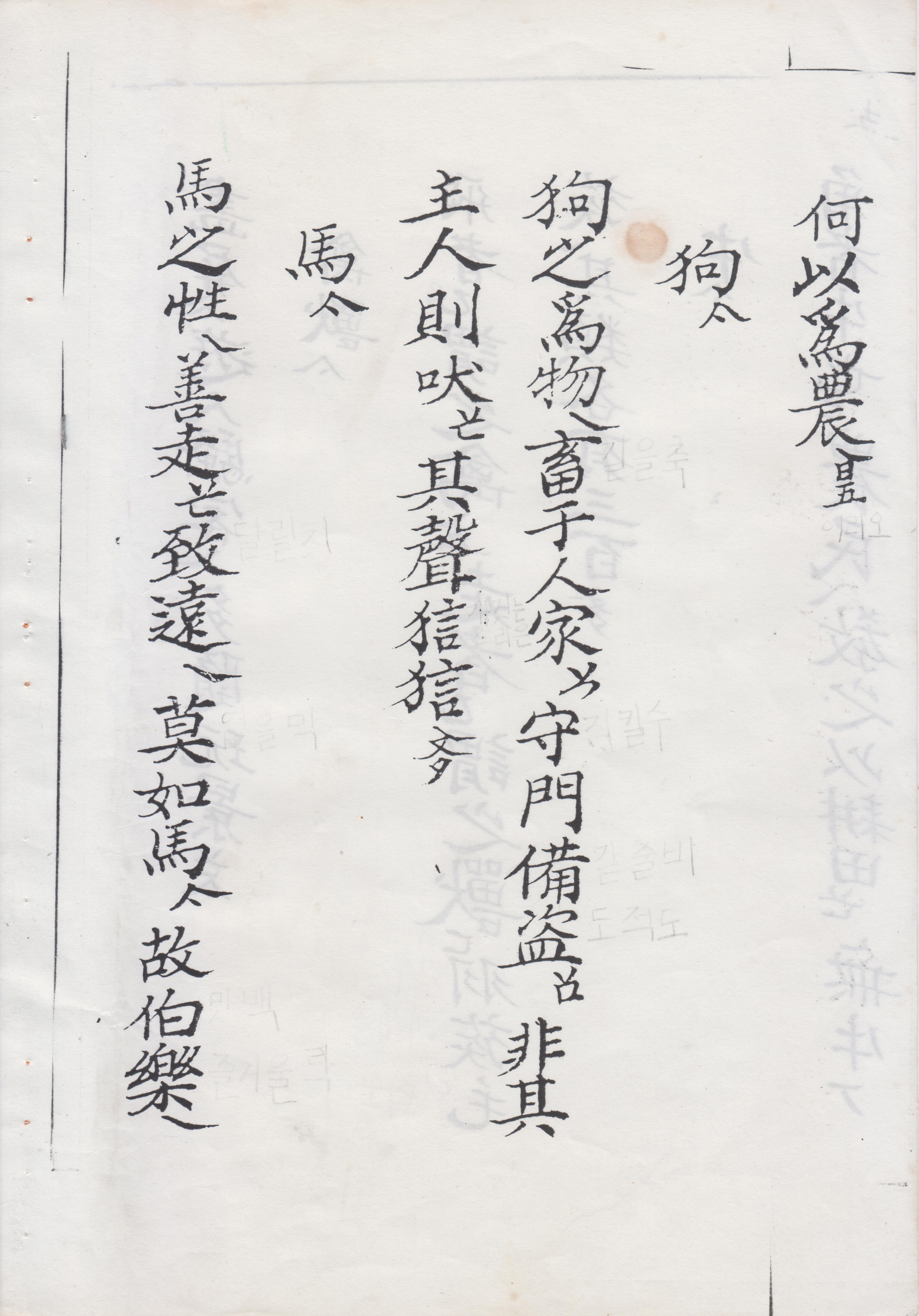 狗라. 狗之爲物이 畜于人家하여 守門備盜하고 見人狺狺하니 非主人則吠之로다.