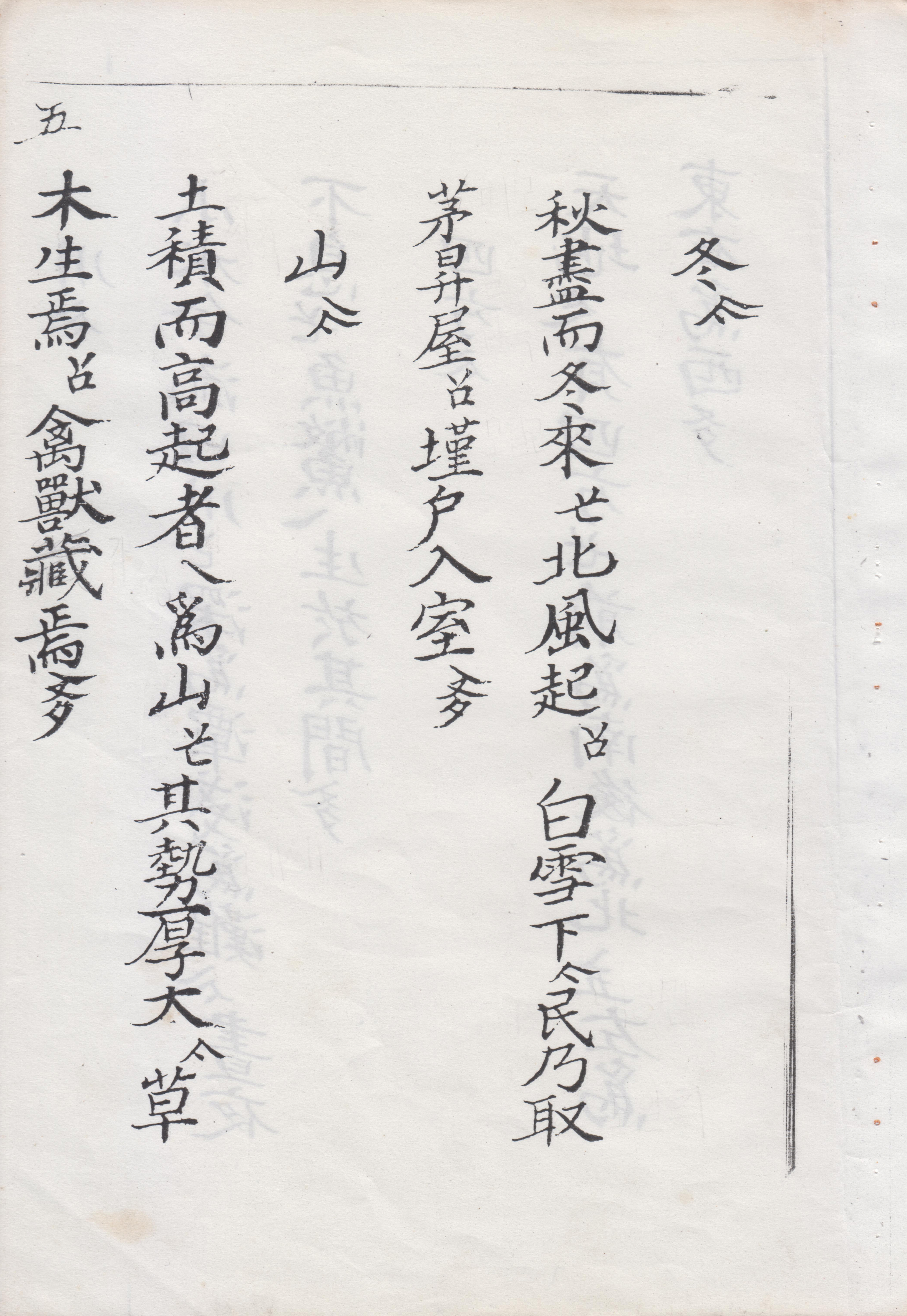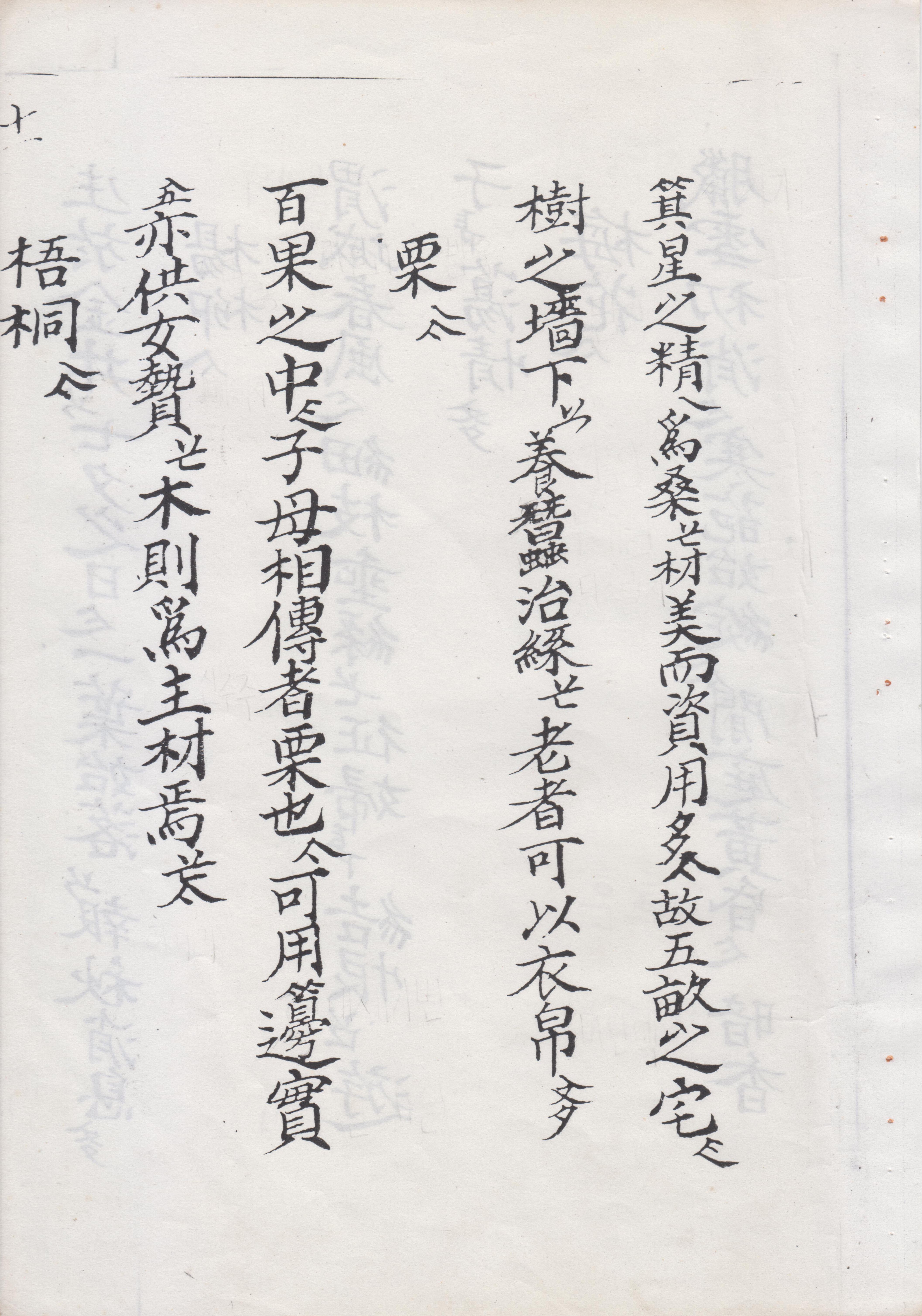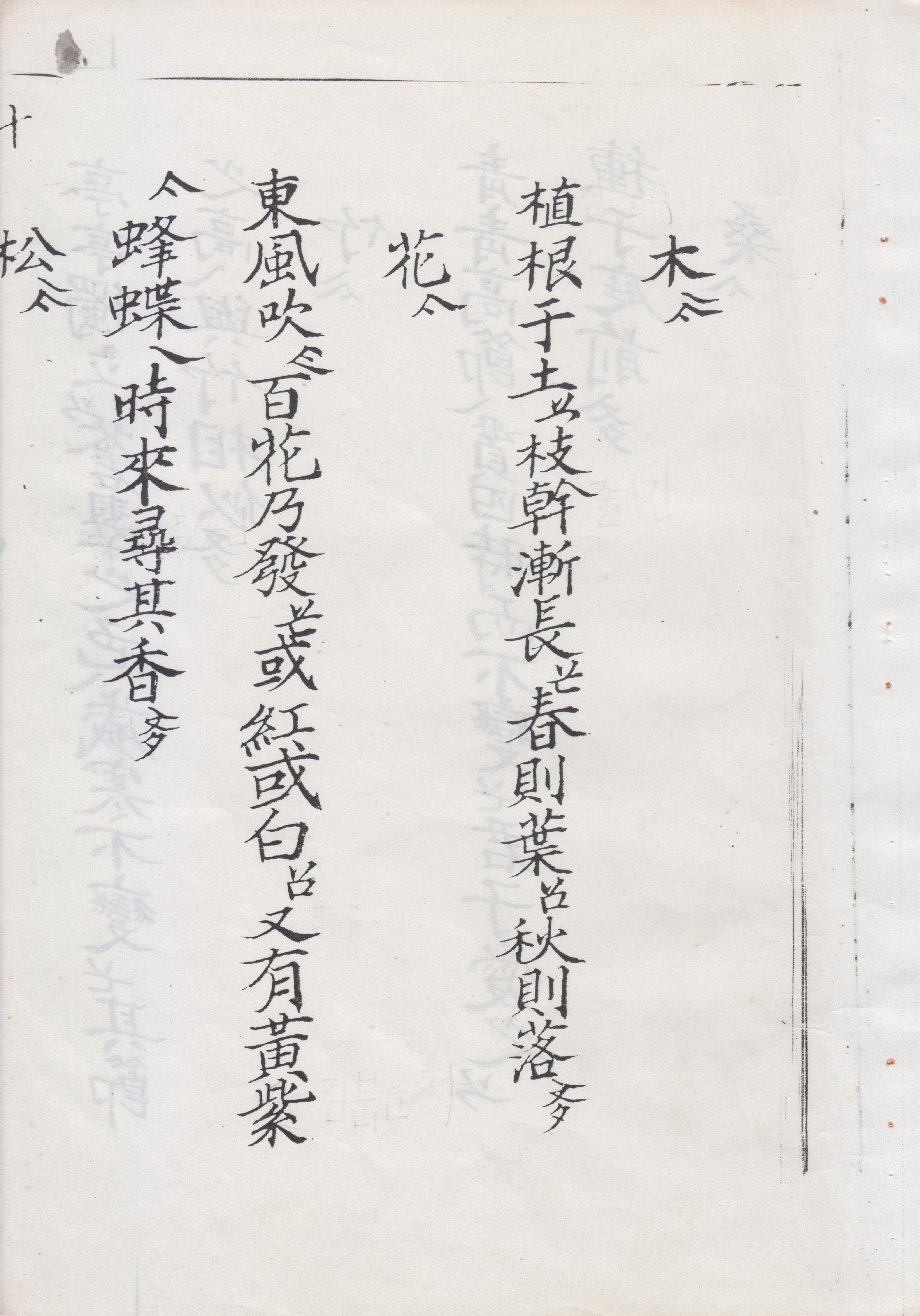 木이라. 有枝葉者를 謂之木이니 植根于土하여 枝幹漸長하니 春則葉하고 夏則陰하며 秋則落이로다.