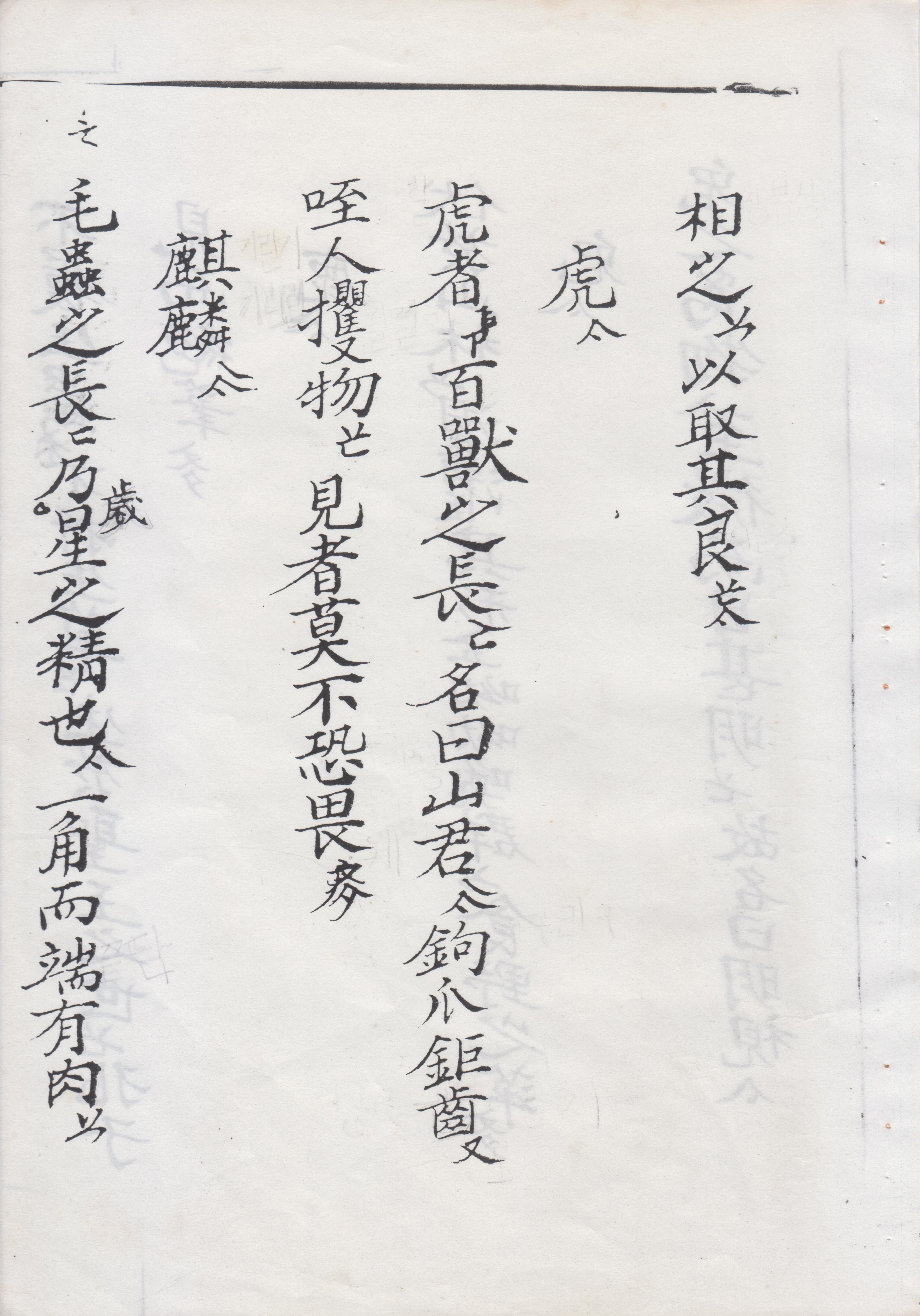虎라. 百獸之長也라. 號曰山君이니 鉤爪鉅牙로 咥人攫物하니 見之者莫不恐畏니이다.