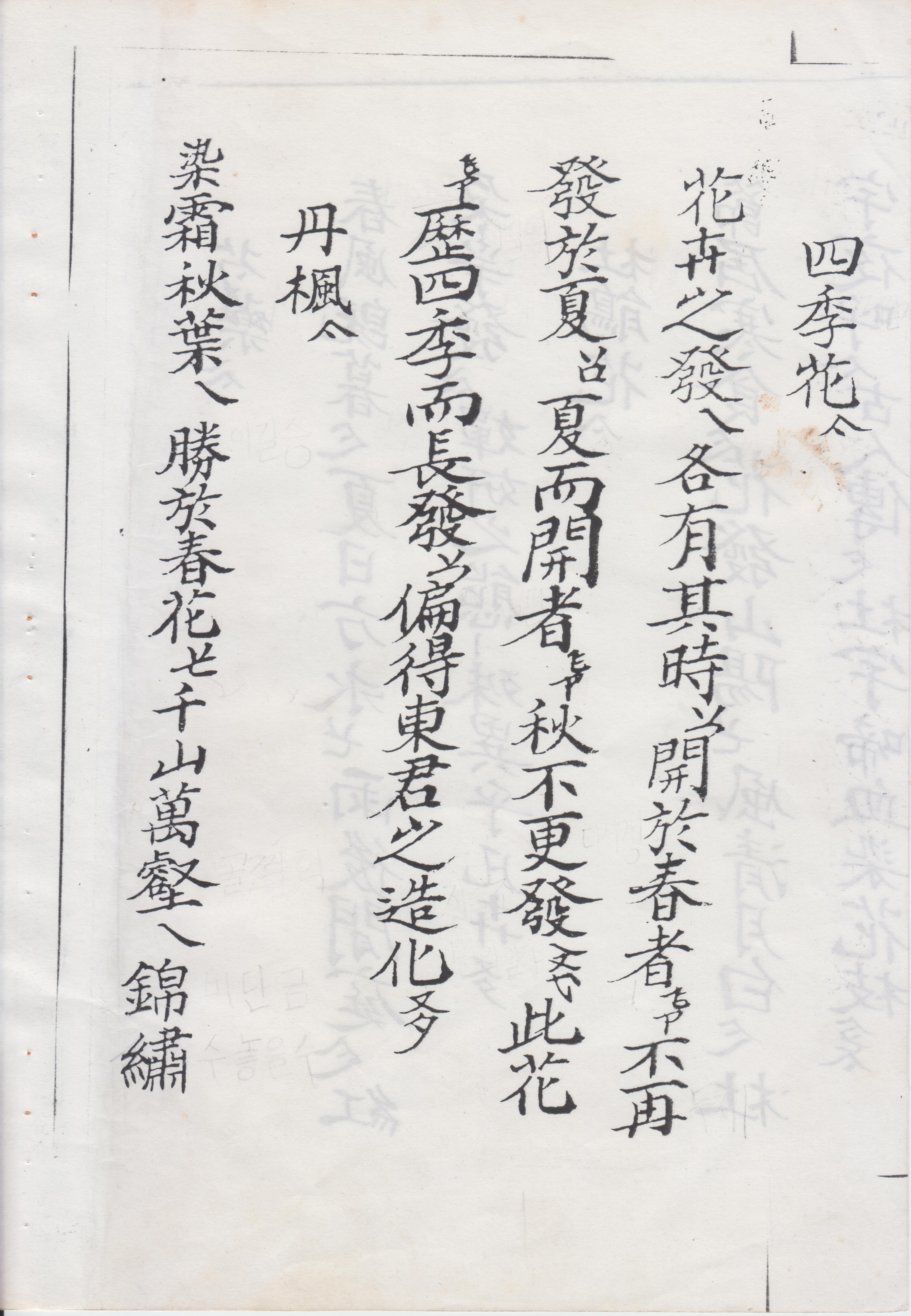 四季花라. 花卉之發이 各有其時하되 開於春者는 不再發於夏하고 夏而開者는 秋不更發하되 此花는 歷四季而長開하니 便得東君之造化로다.