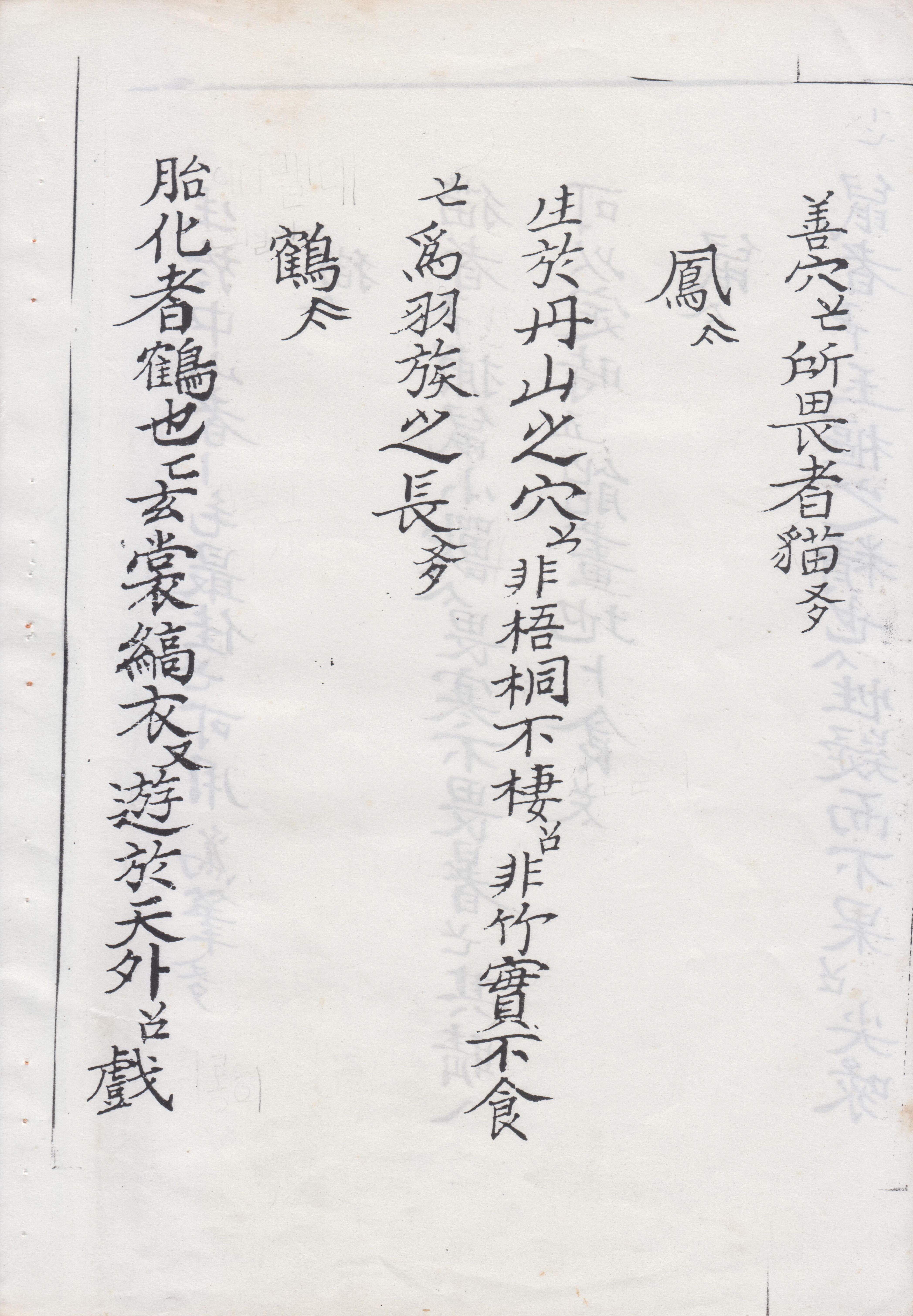 鳳凰이라. 丹山之上有鳥하니 名曰鳳凰이라. 非醴泉이면 不飮하고 非竹實이면 不食하고 非梧桐不棲하니 天下有道則來하고 無道則去하니 羽族之長이로다.