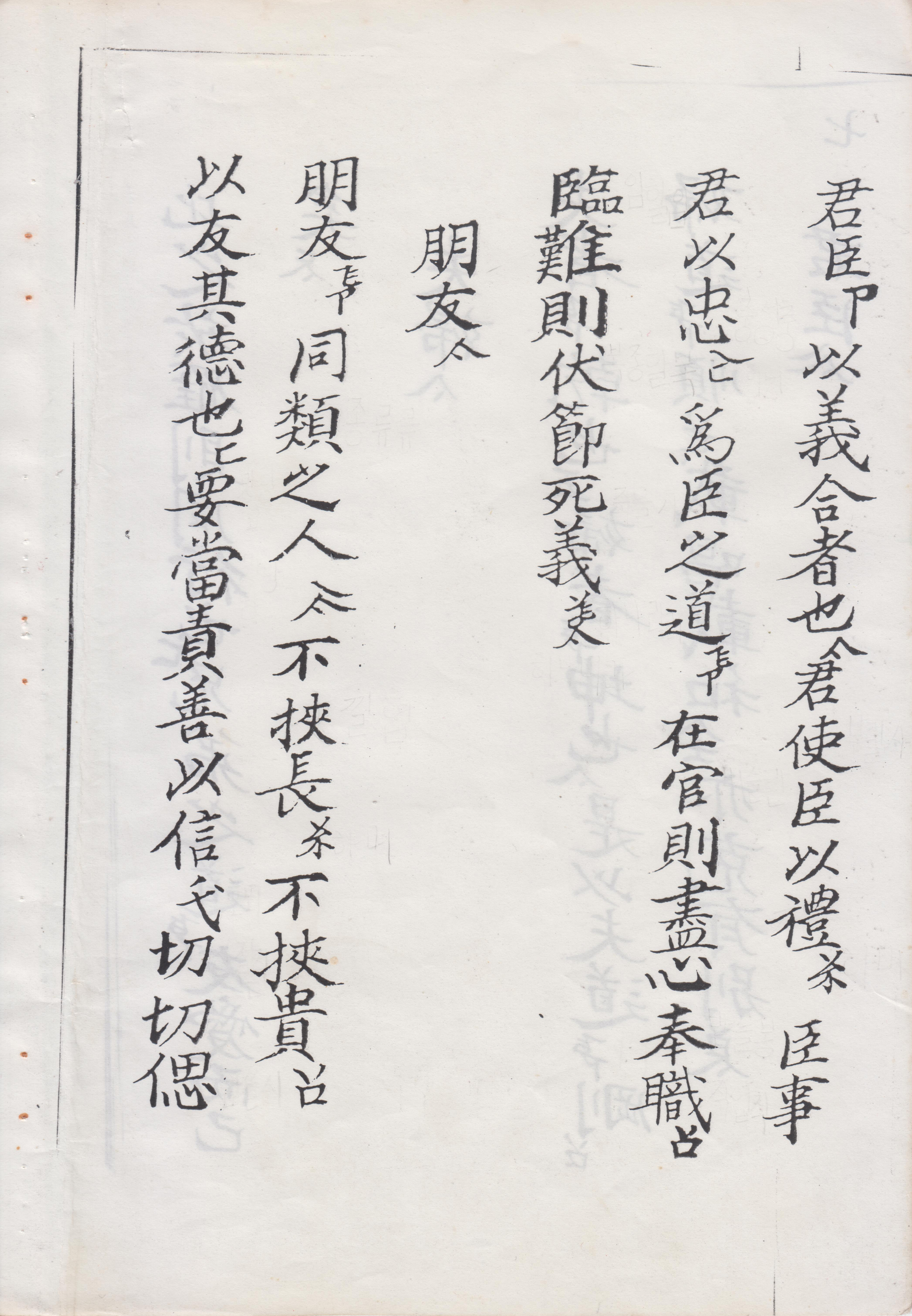 君臣이라. 君臣以義合者也니 君視臣如手足하고 臣視君如元首니 爲臣之道伏節死義而已니이다.