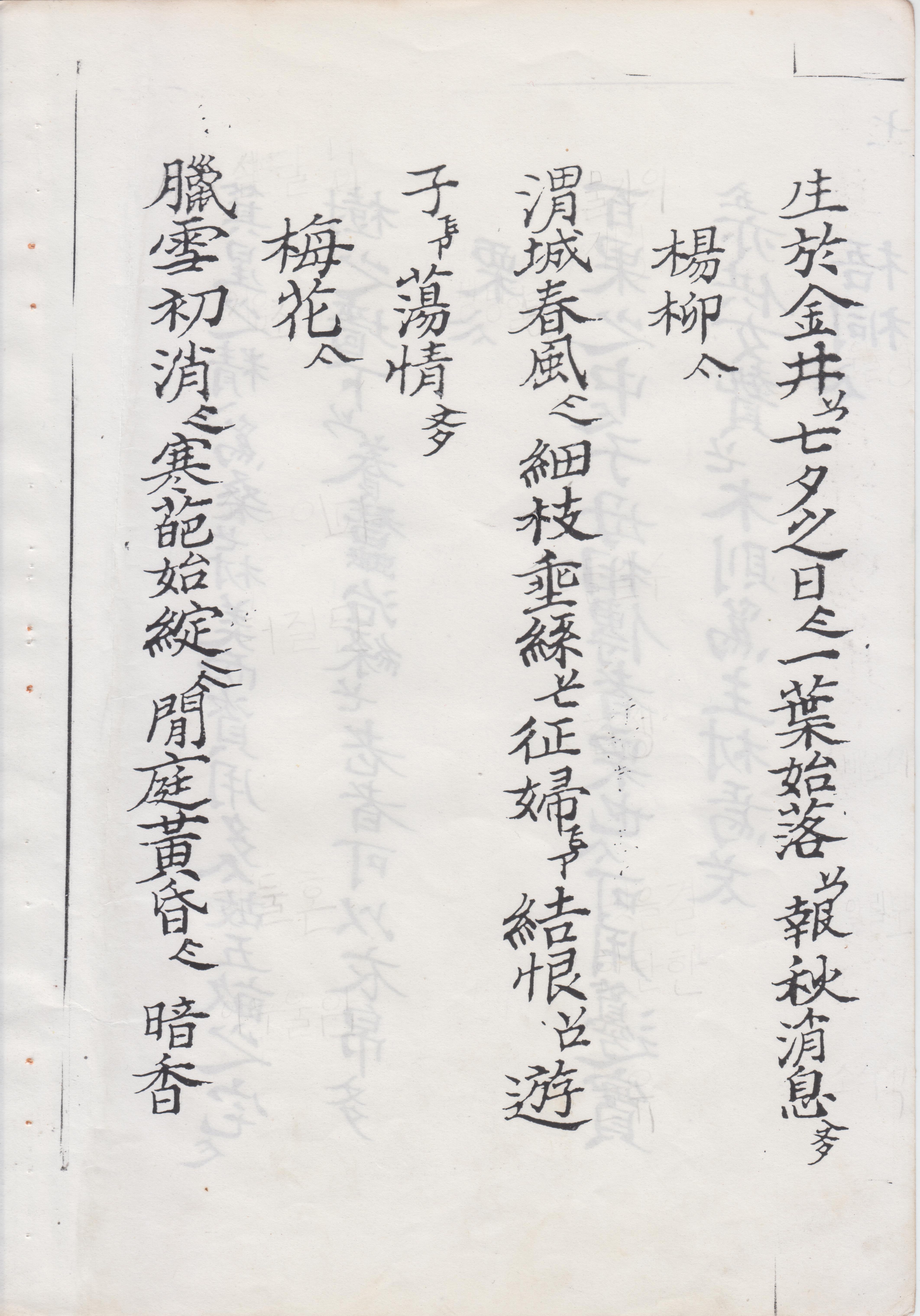 楊柳라. 春風이 將暮에 楊柳依倚하고 黃鳥爰集하니 征婦는 結恨하고 遊子는 蕩情이로다.