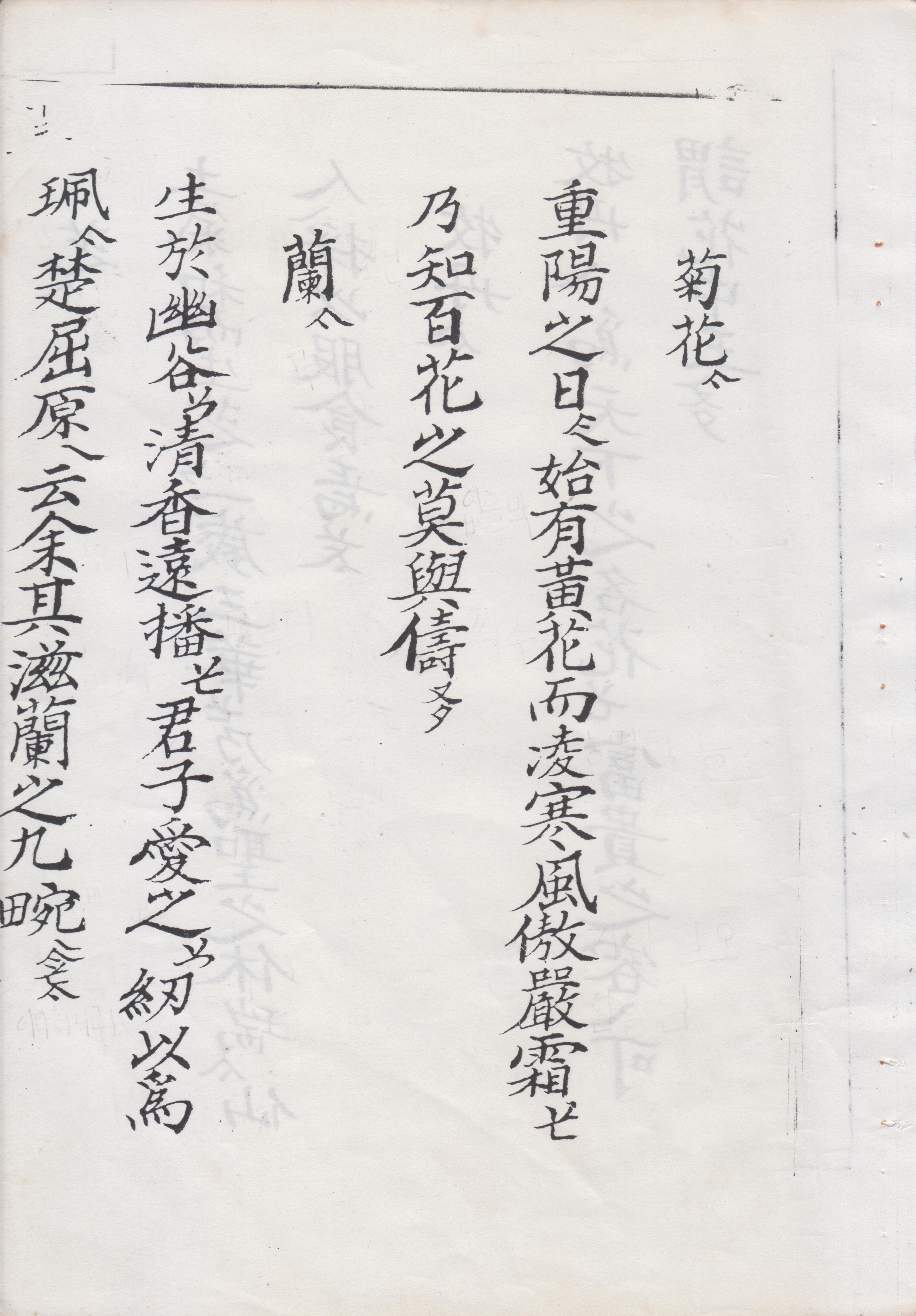 菊花라. 花不發春風하고 發於秋霜하니 凌寒高節은 花中隱士니 籬下階上에 片片黃金이로다.