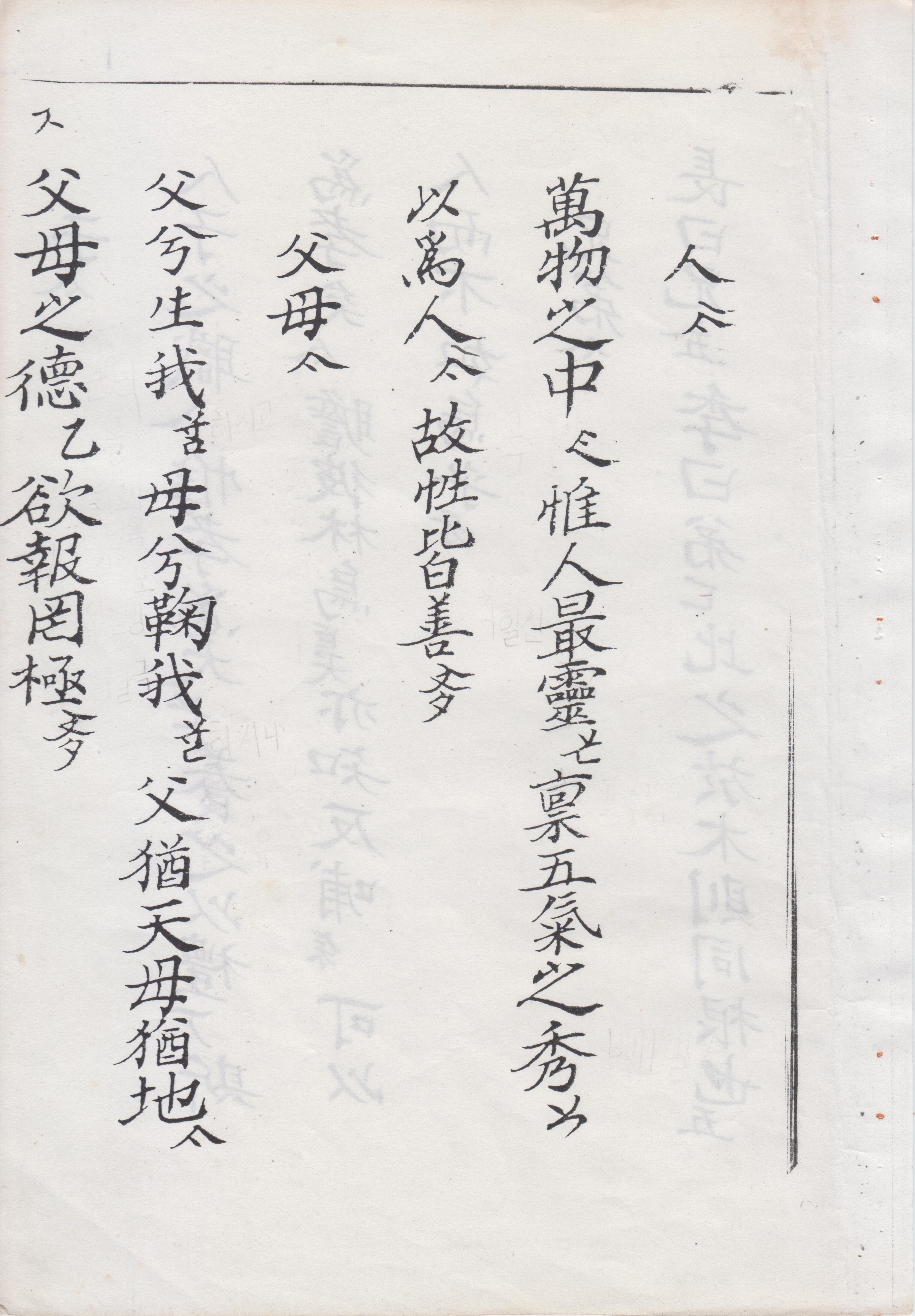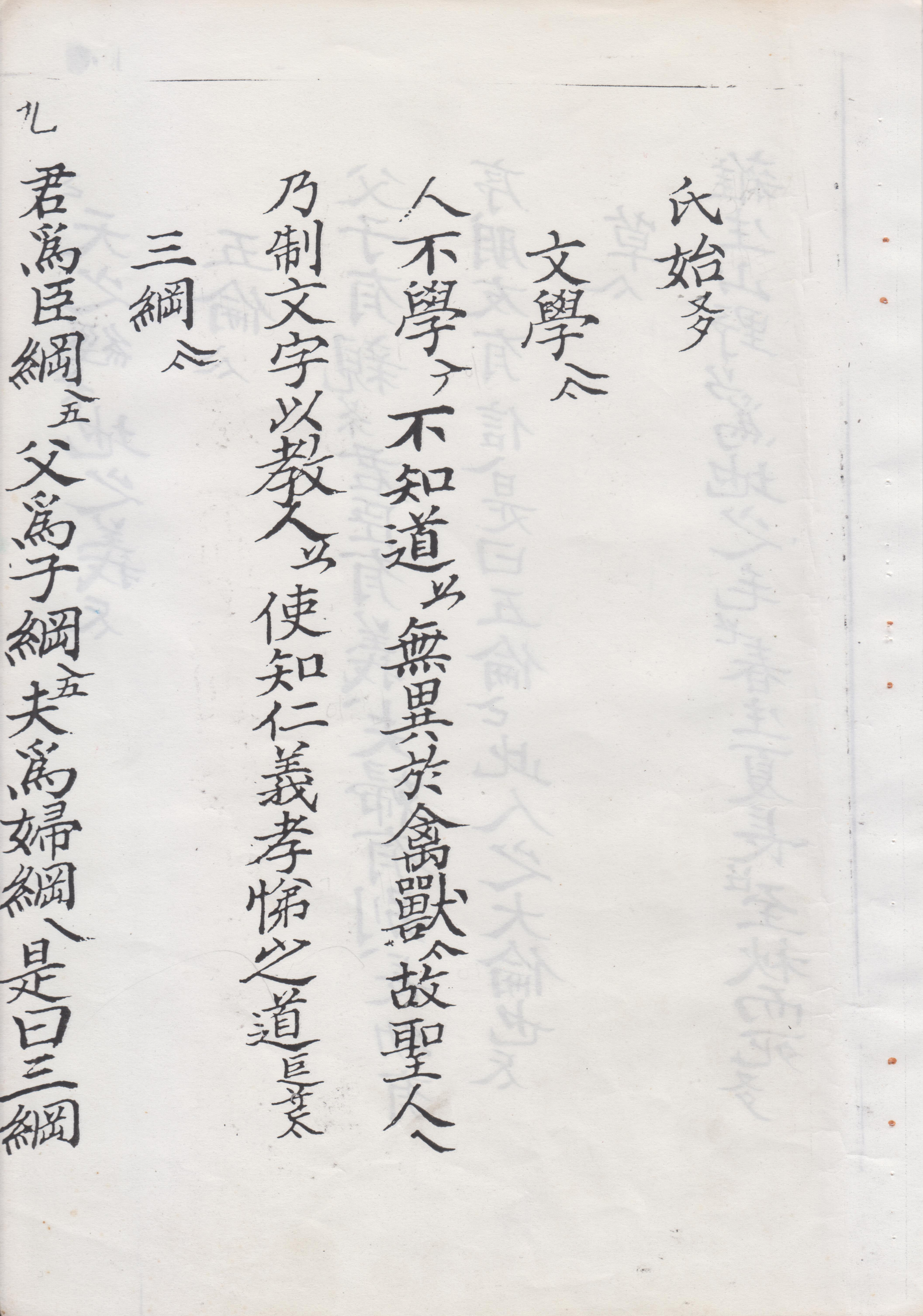 文學이라. 人而不學이면 不知道理하여 無異禽獸라. 故로 聖人이 乃制文學하여 以敎人하여 使知三綱五倫孝悌忠信禮義廉恥之道로다.