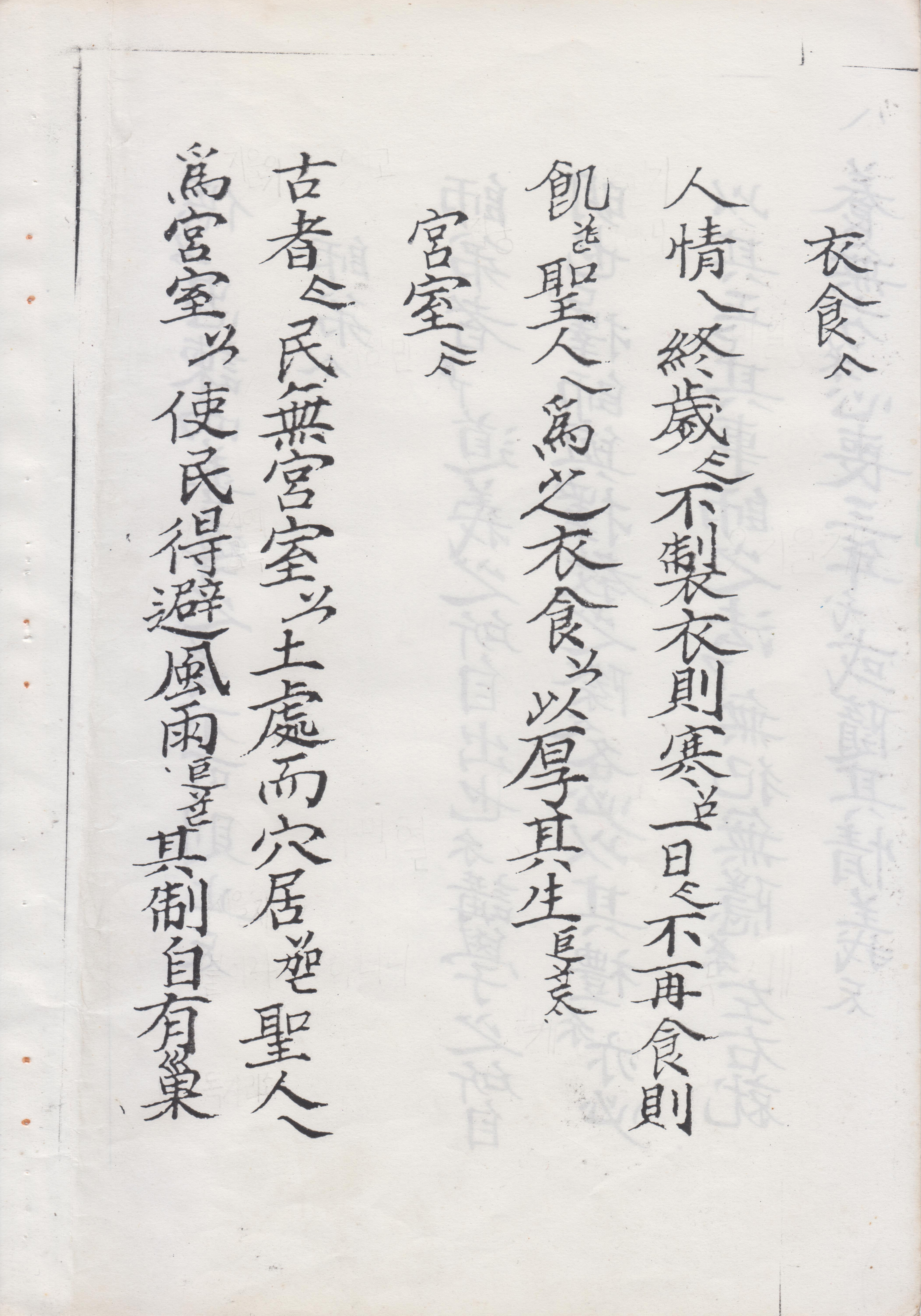 衣食이라. 人情이 終歲不製衣則寒하고 一日不再食則飢이라. 是故로 聖人이 乃制衣食以厚民生이로다.