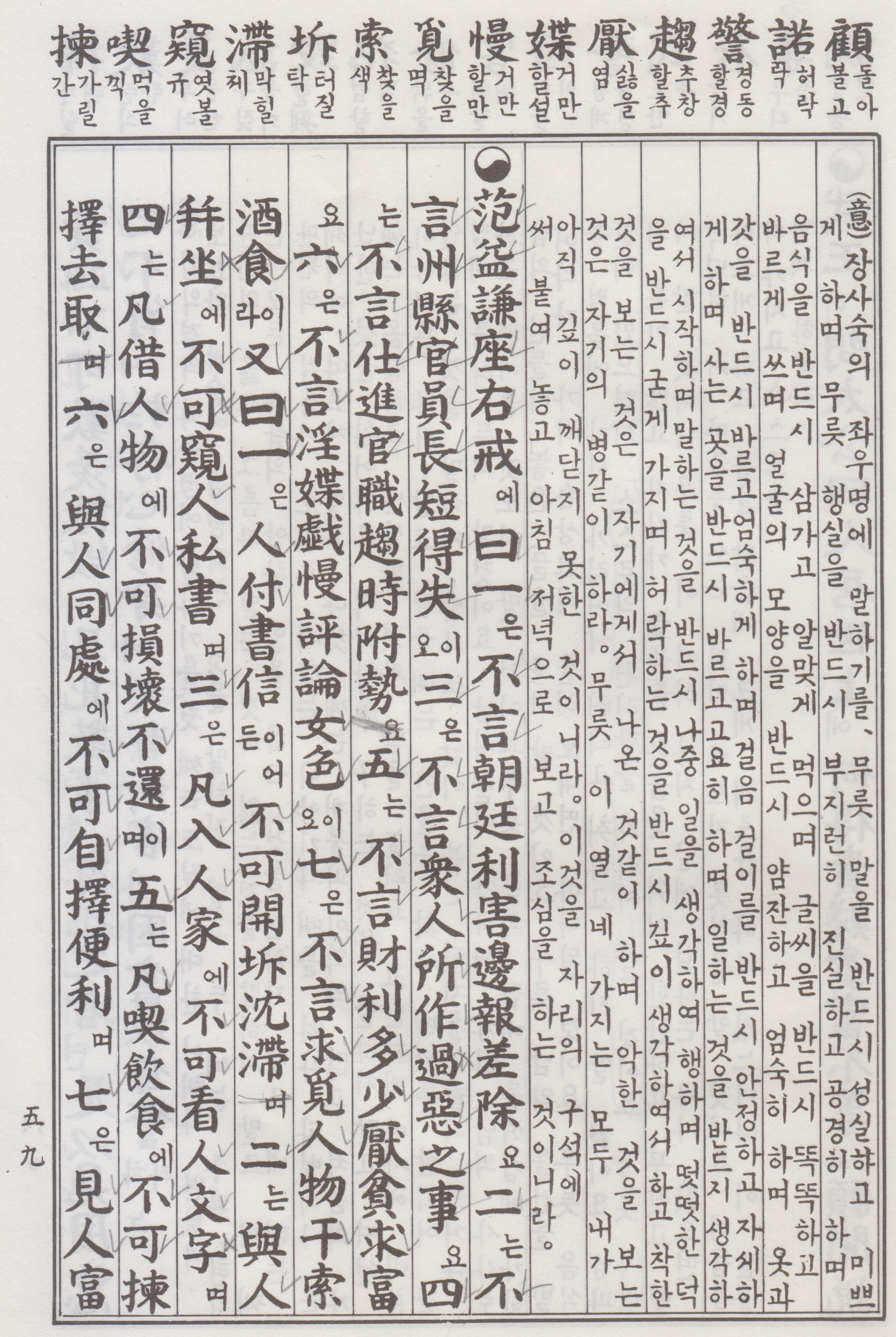 范益謙座右戒曰, 一不言朝廷利害邊報差除, 二不言州縣官員長短得失, 三不言衆人所作過惡之事, 四不言仕進官職趨時附勢, 五不言財利多少厭貧求富, 六不言淫媟戱慢評論女色, 七不言求覓人物干索酒食。