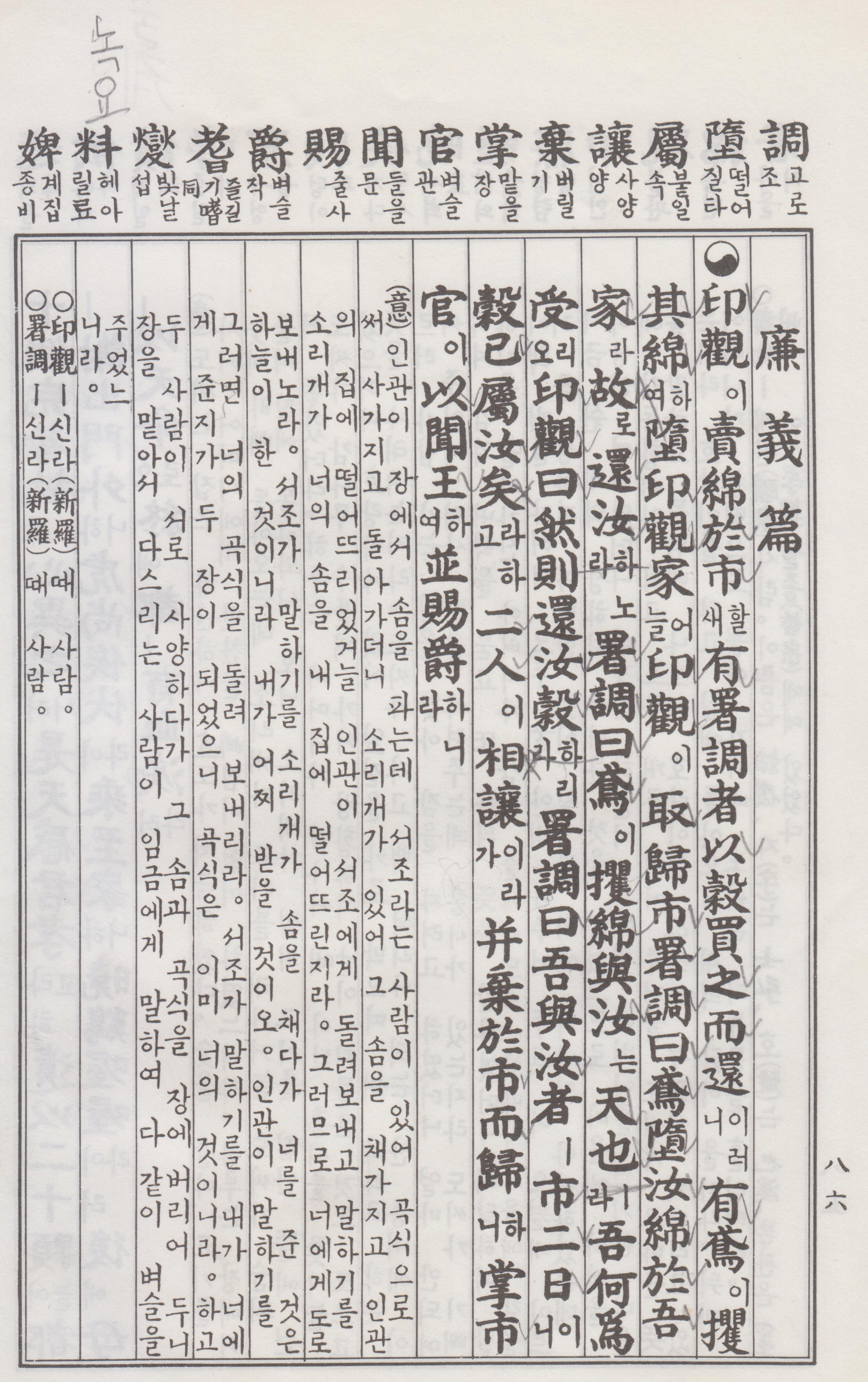 印觀賣綿於市, 有暑調者以穀買之而還, 有鳶攫其綿, 墮印觀家, 印觀, 取歸于署調曰鳶墮汝綿於吾家, 故, 還汝, 署調曰鳶攫綿與汝, 天也, 吾何爲受, 印觀曰然則還汝穀, 署調曰吾與汝者市二日, 穀已屬汝矣。 二人相讓, 幷棄於市而歸, 掌市官以聞王, 竝賜爵。