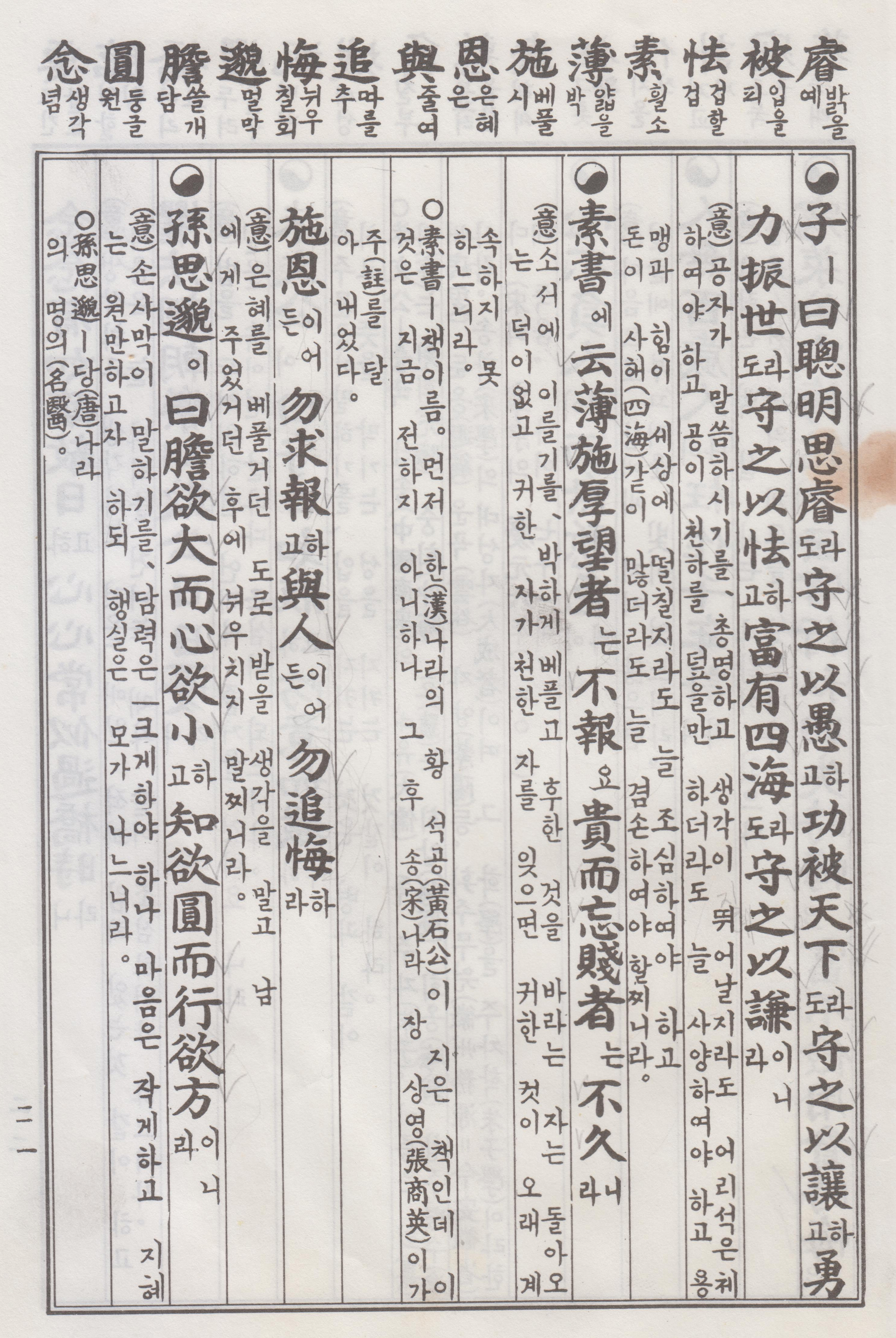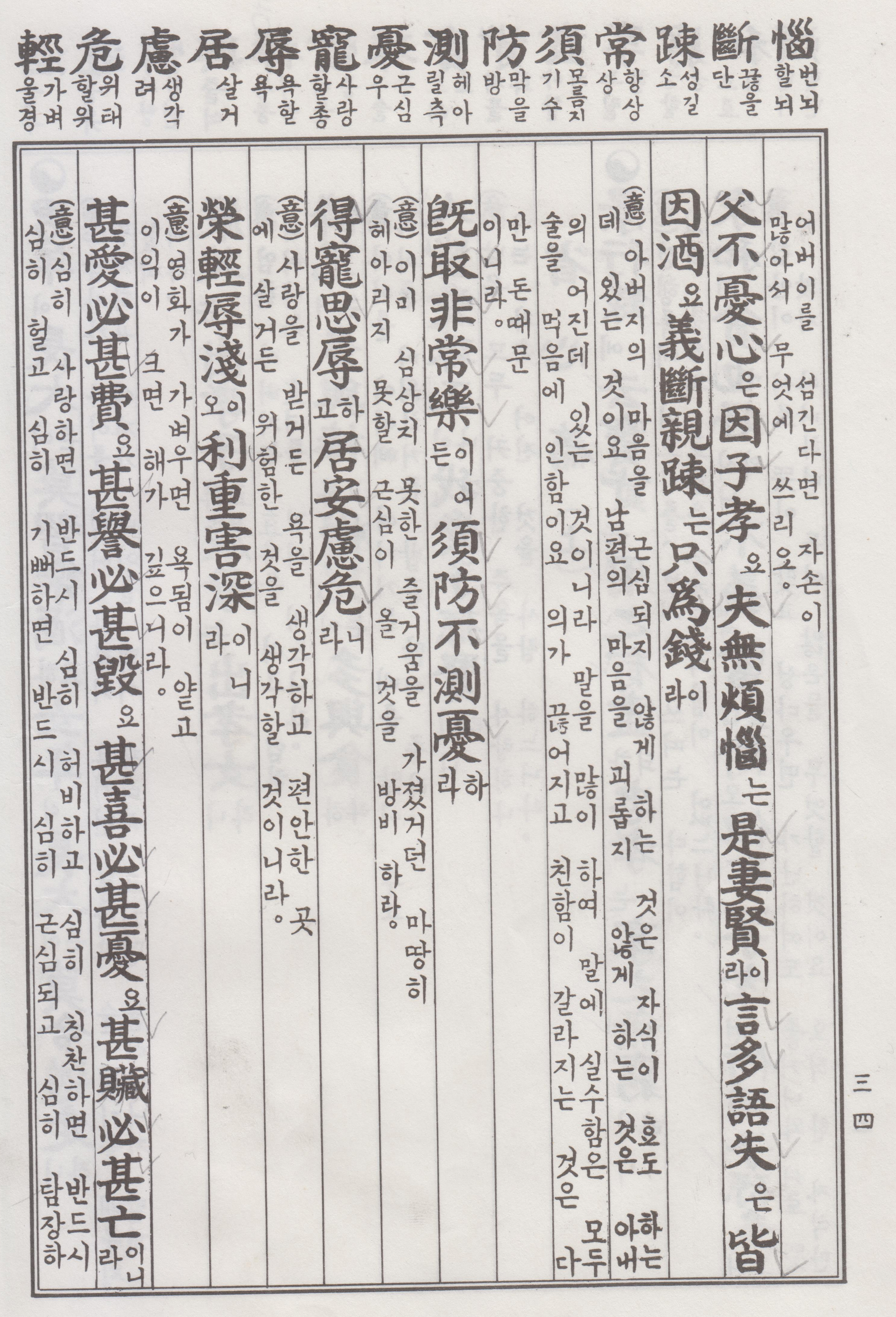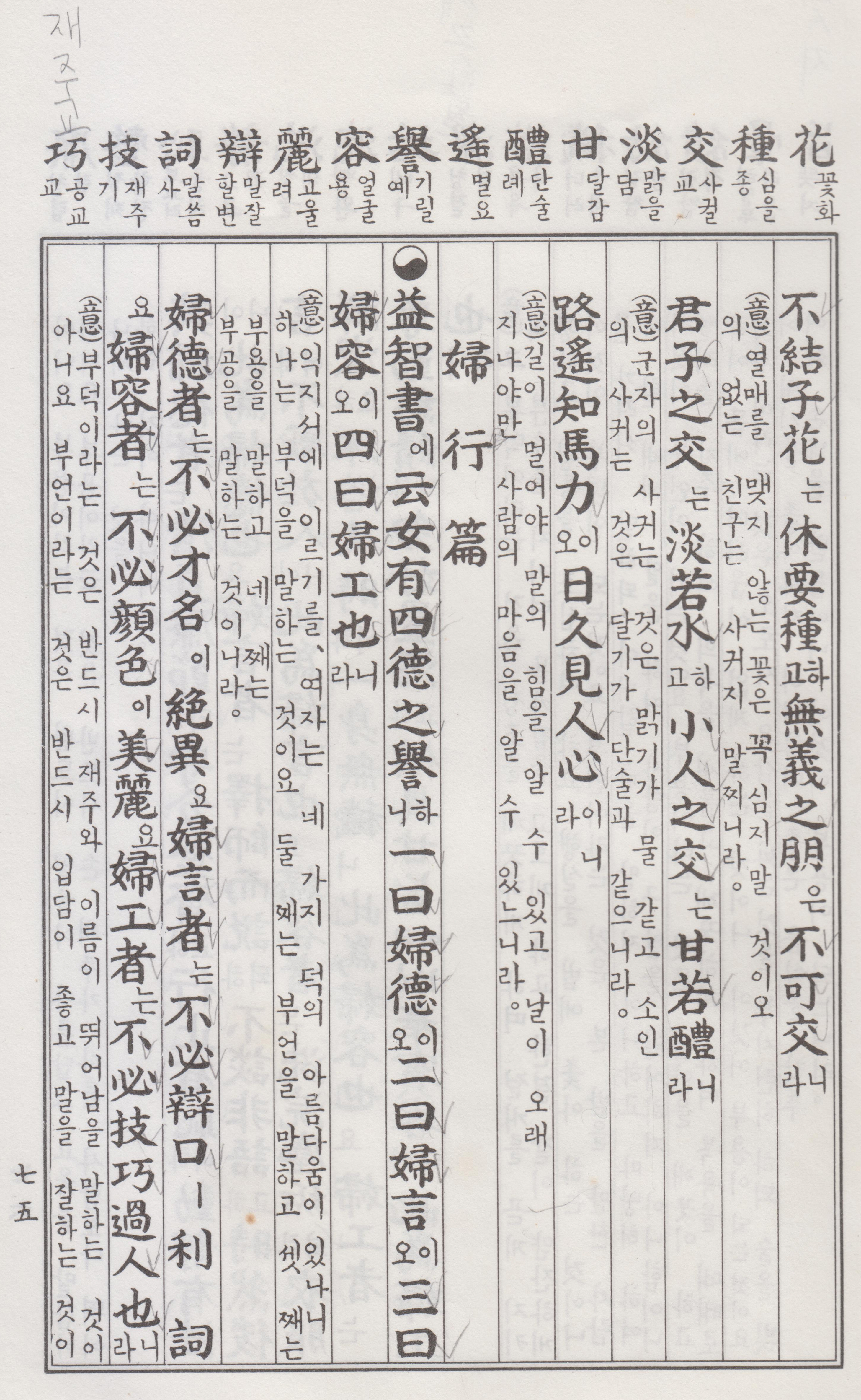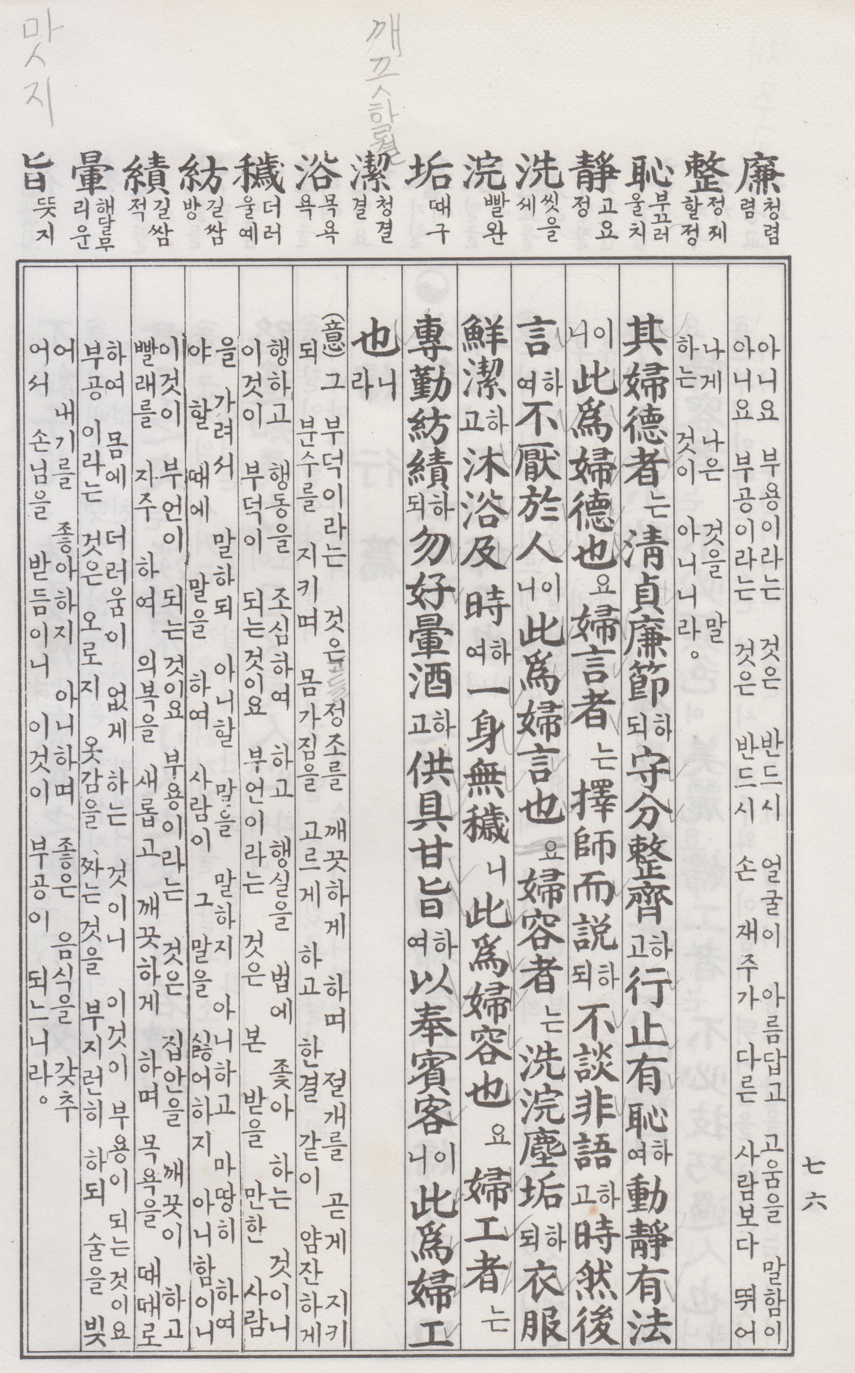 其婦德者淸貞廉節, 守分整齊, 行止有恥, 動靜有法, 此爲婦德也。婦容者洗浣塵垢, 衣服鮮潔, 沐浴及時, 一身無穢, 此爲婦容也。婦言者擇師而說, 不談非語, 時然後言, 不厭於人, 此爲婦言也。婦工者專勤紡績, 勿好暈酒, 供具甘旨, 以奉賓客, 此爲婦工也。