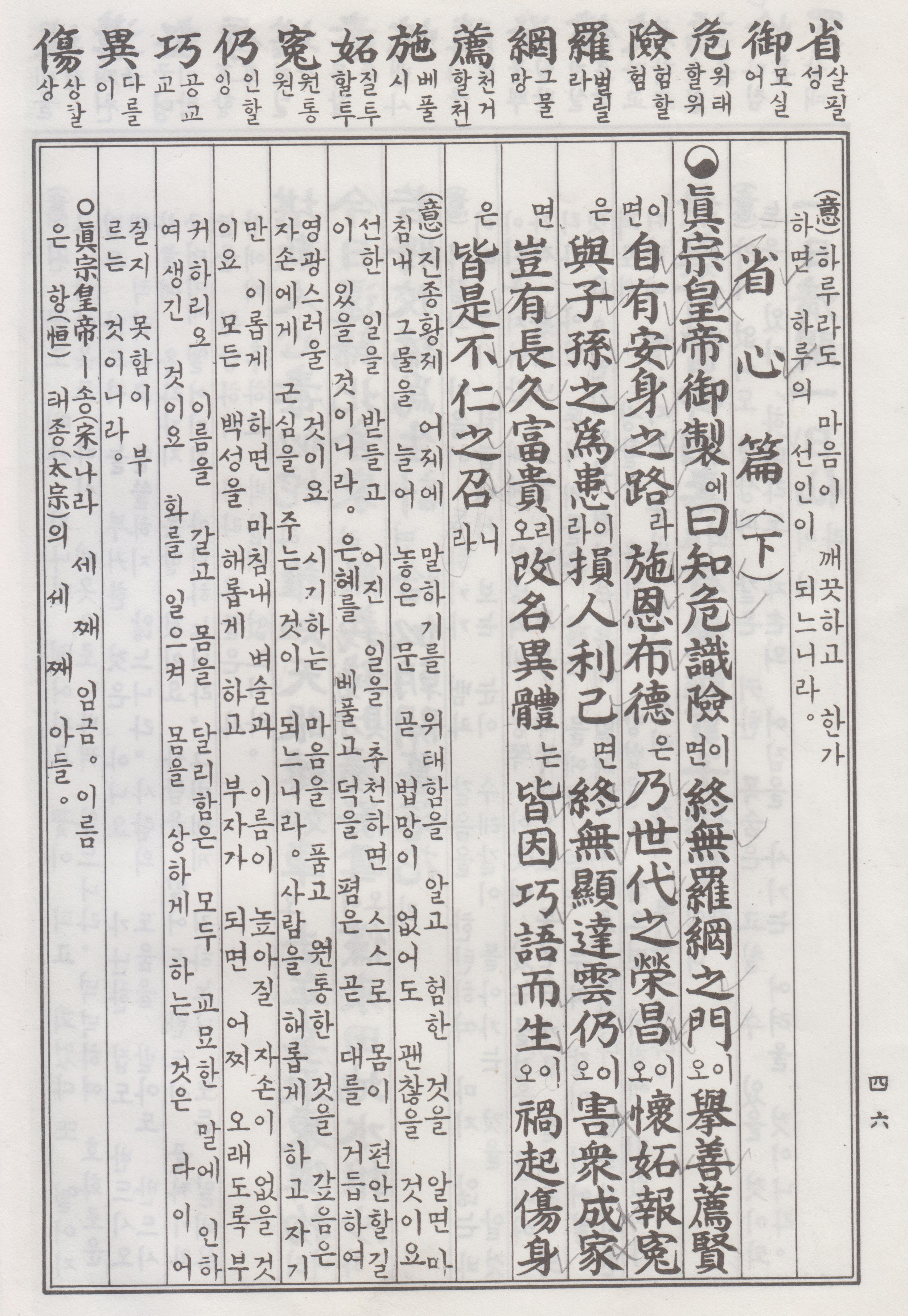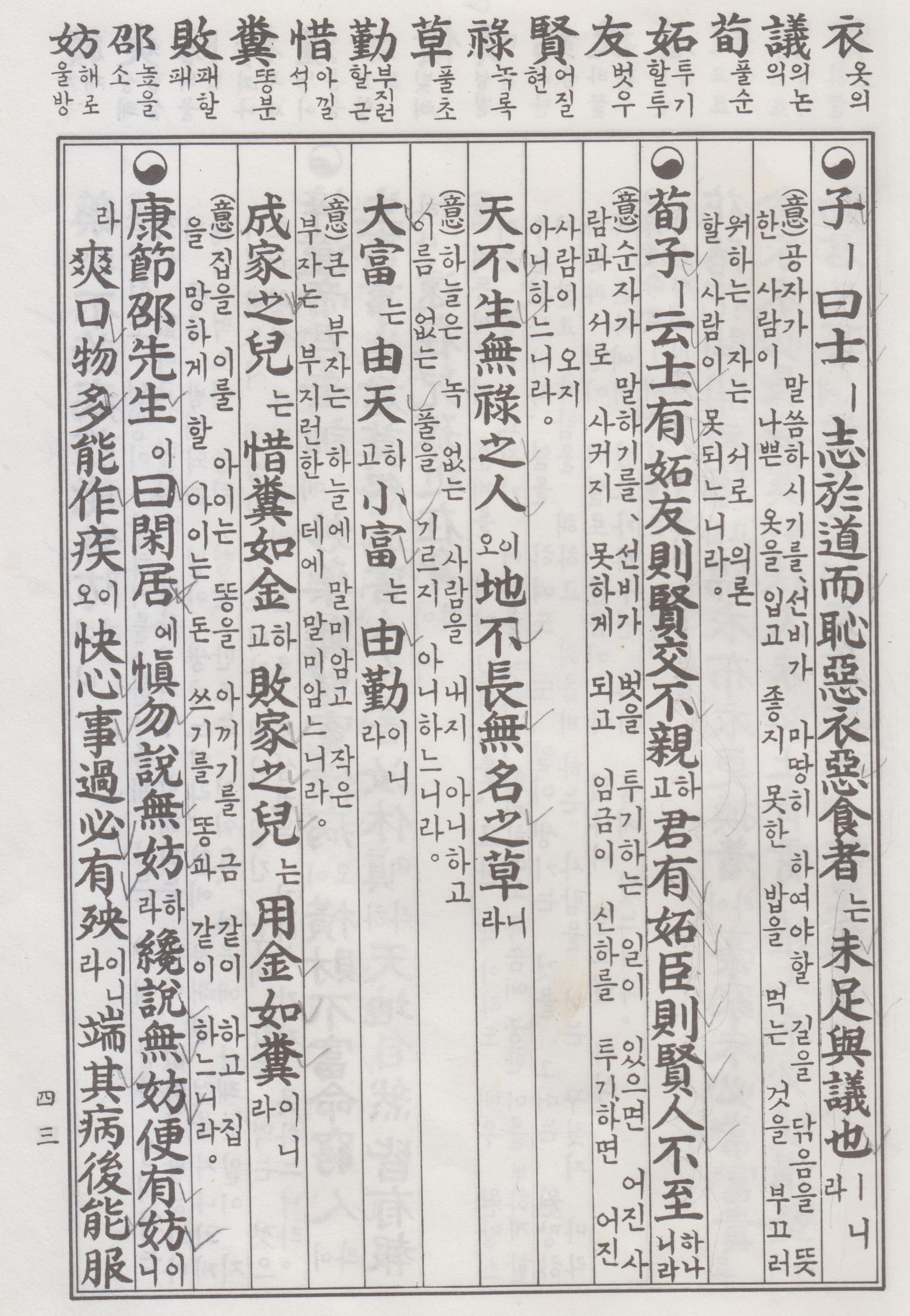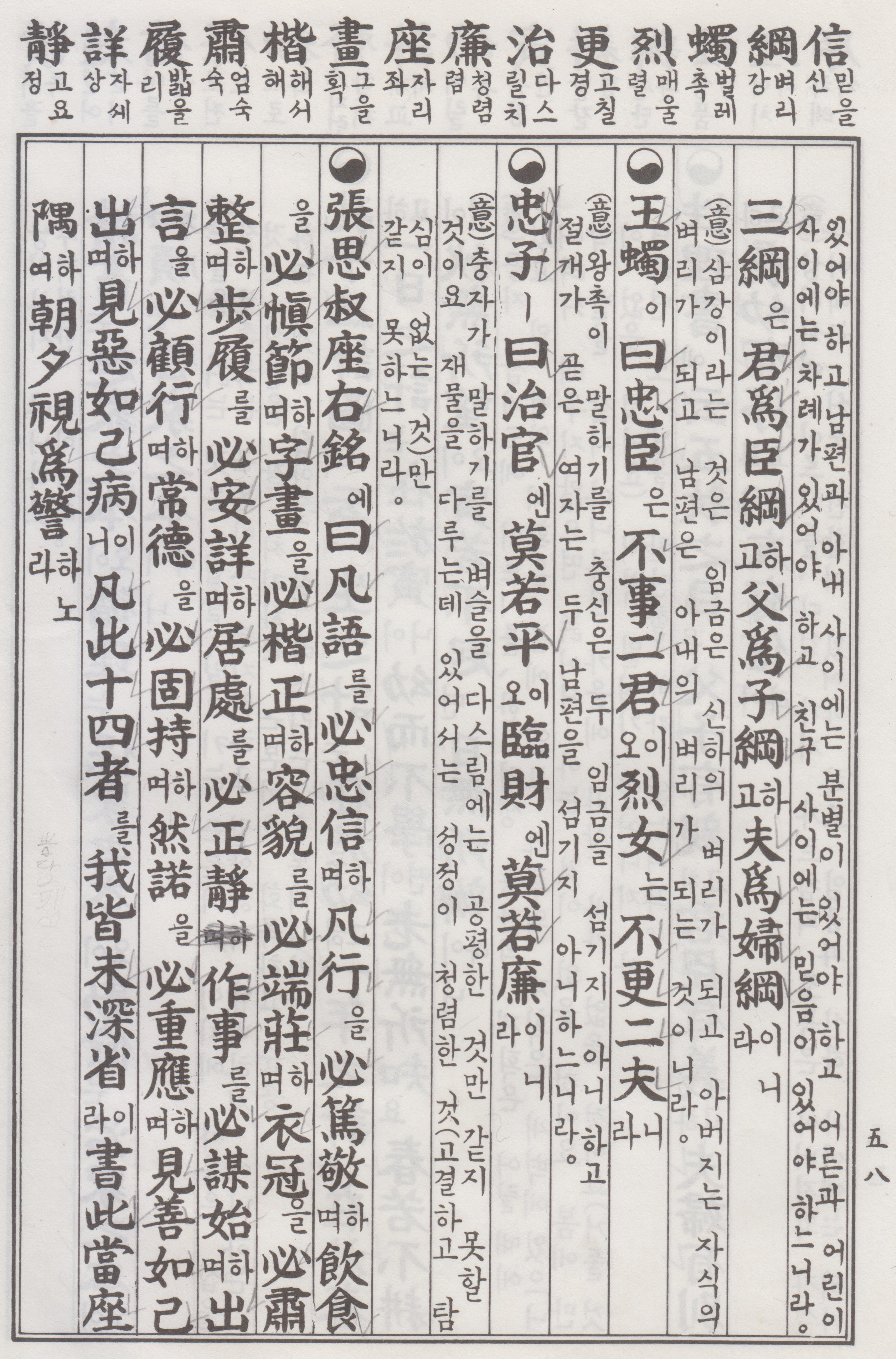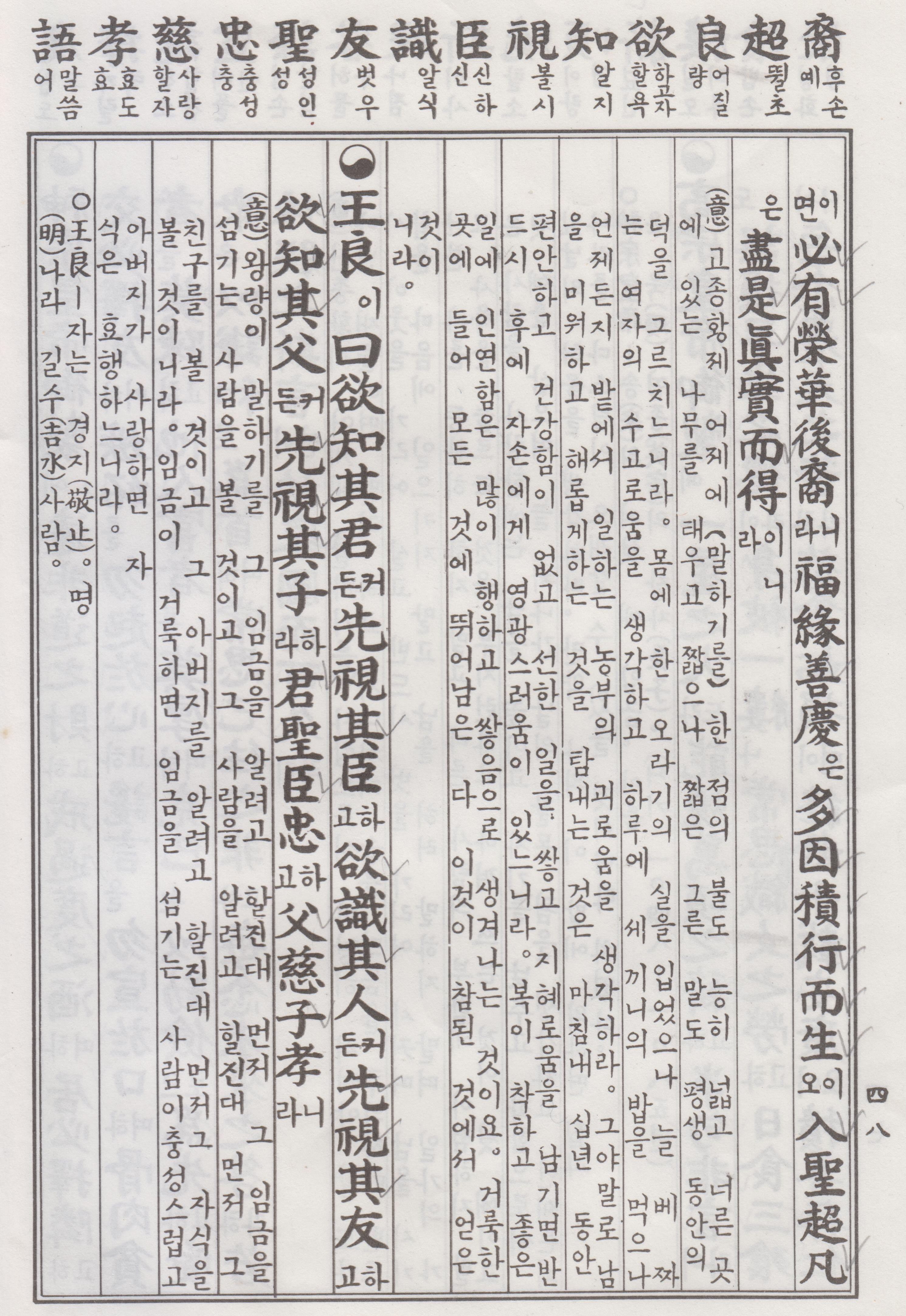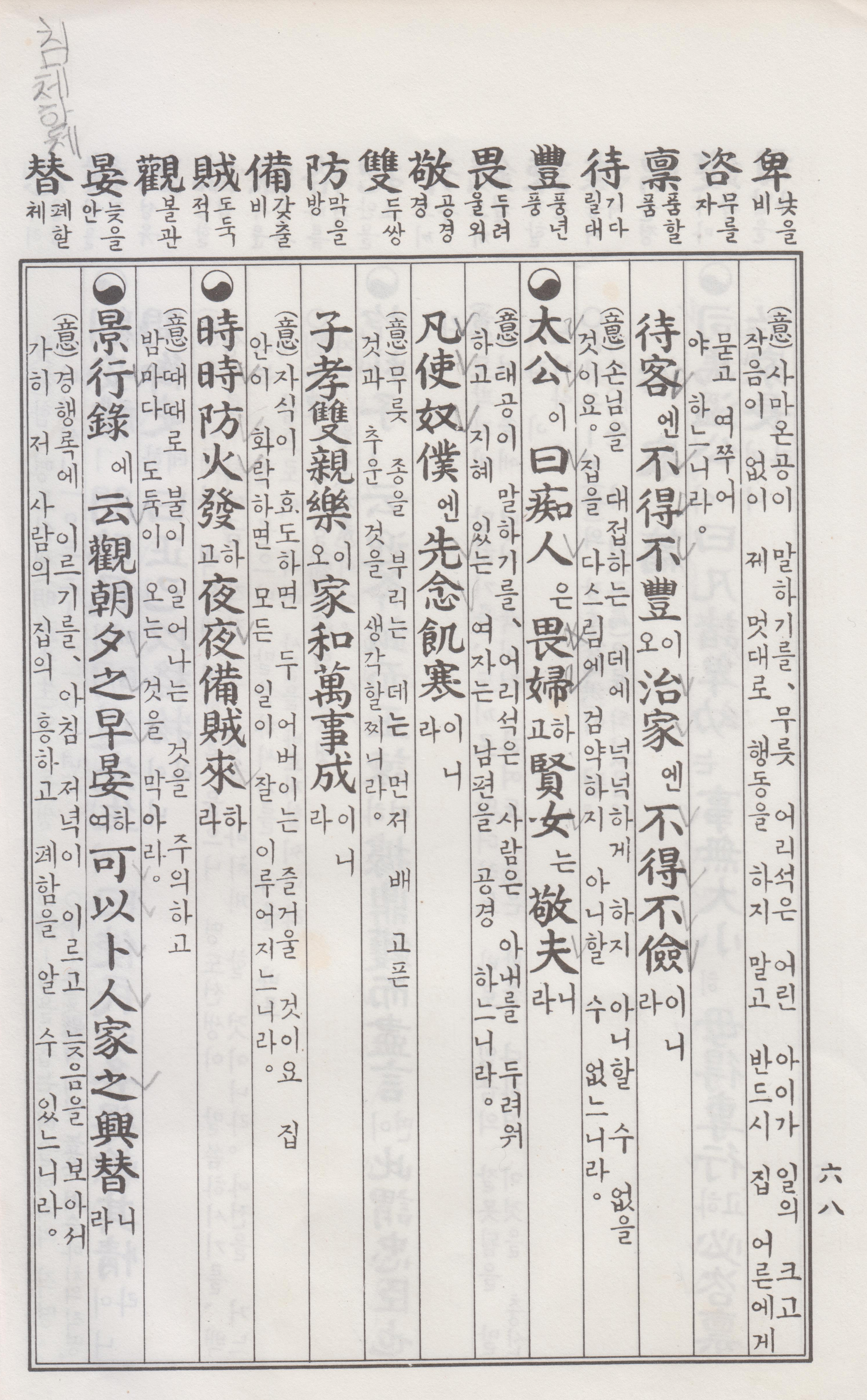 其婦德者淸貞廉節, 守分整齊, 行止有恥, 動靜有法, 此爲婦德也。婦容者洗浣塵垢, 衣服鮮潔, 沐浴及時, 一身無穢, 此爲婦容也。婦言者擇師而說, 不談非語, 時然後言, 不厭於人, 此爲婦言也。婦工者專勤紡績, 勿好暈酒, 供具甘旨, 以奉賓客, 此爲婦工也。