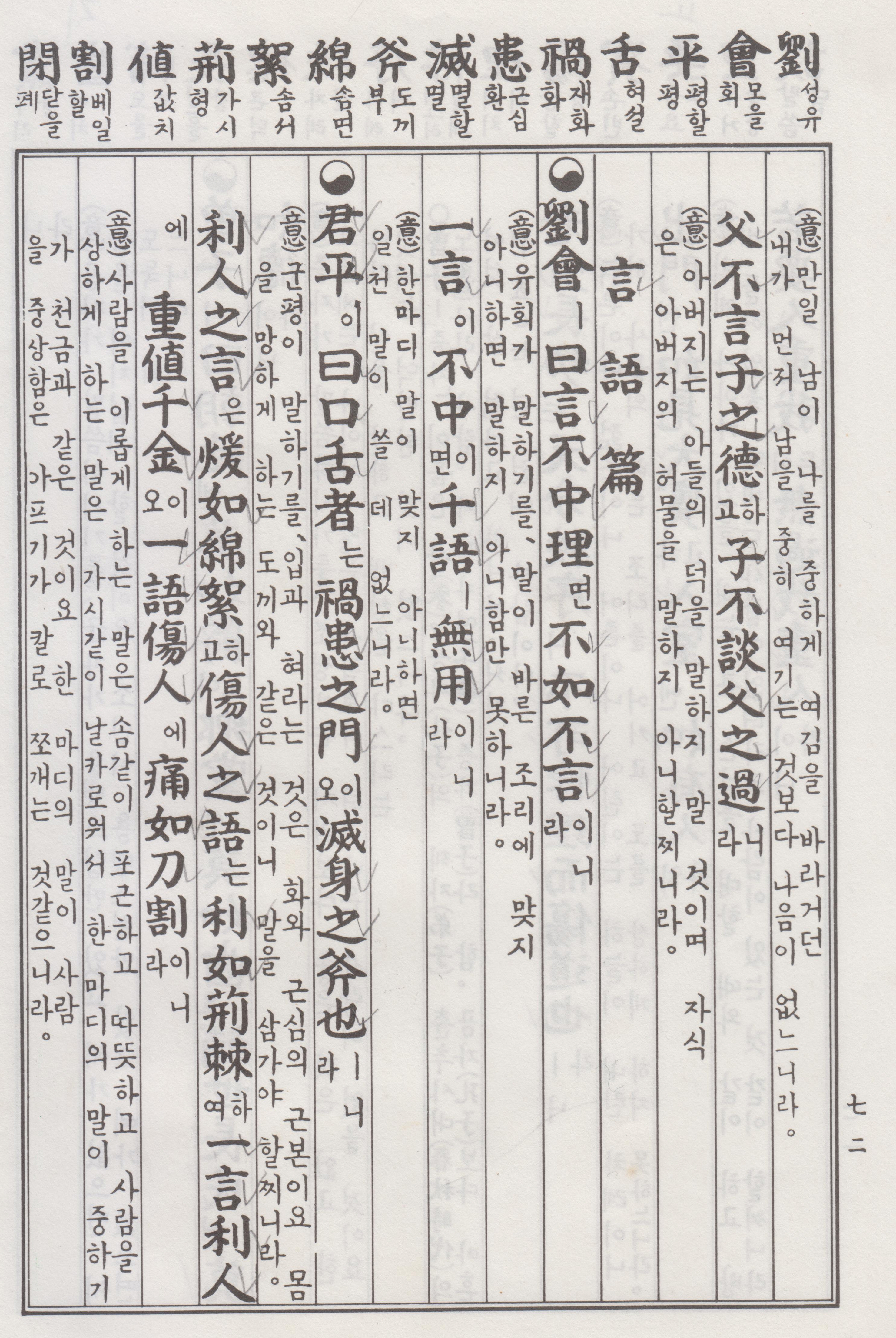 利人之言, 煖如綿絮, 傷人之語, 利如荊棘, 一言半句, 重値千金, 一語傷人, 痛如刀割。