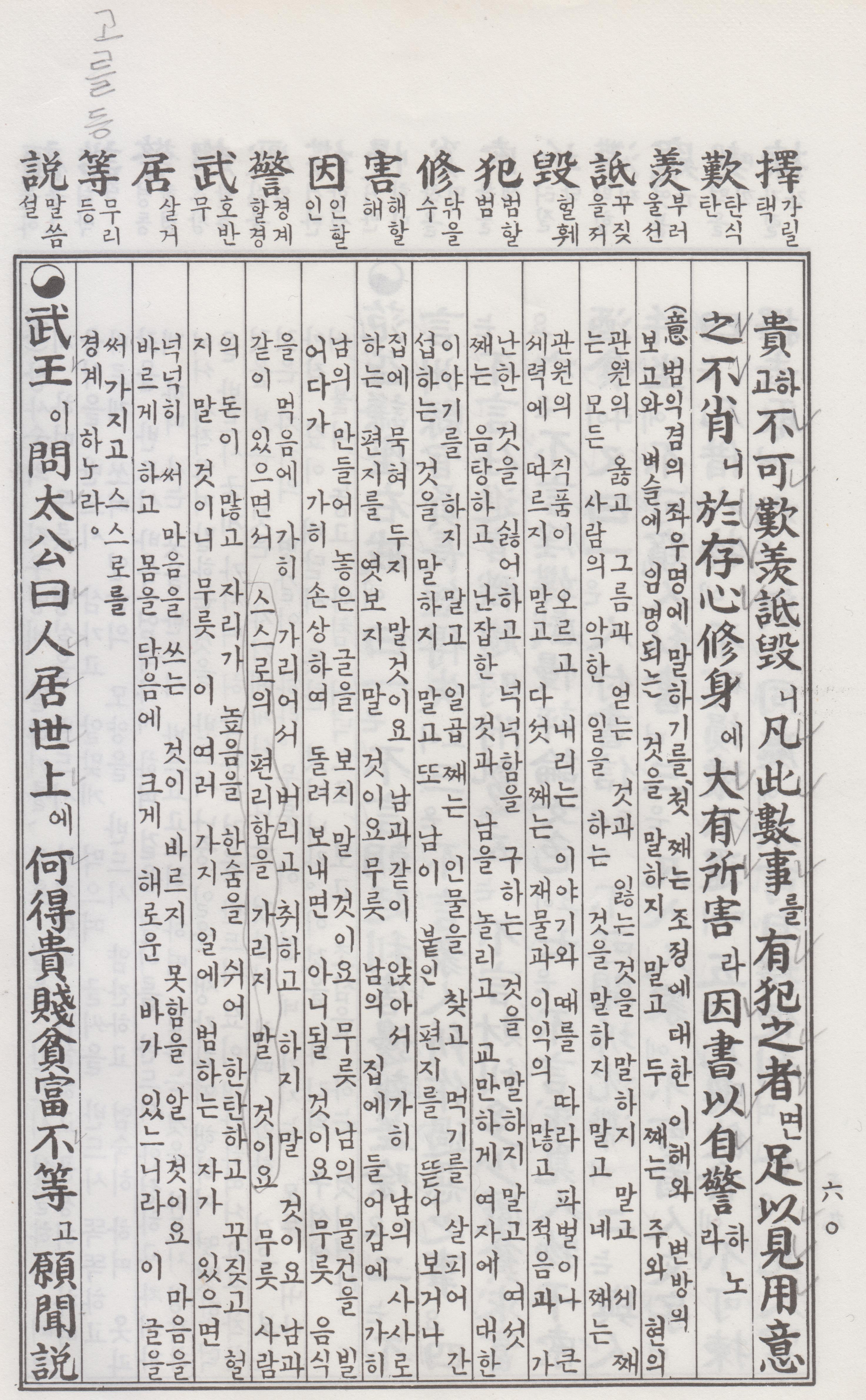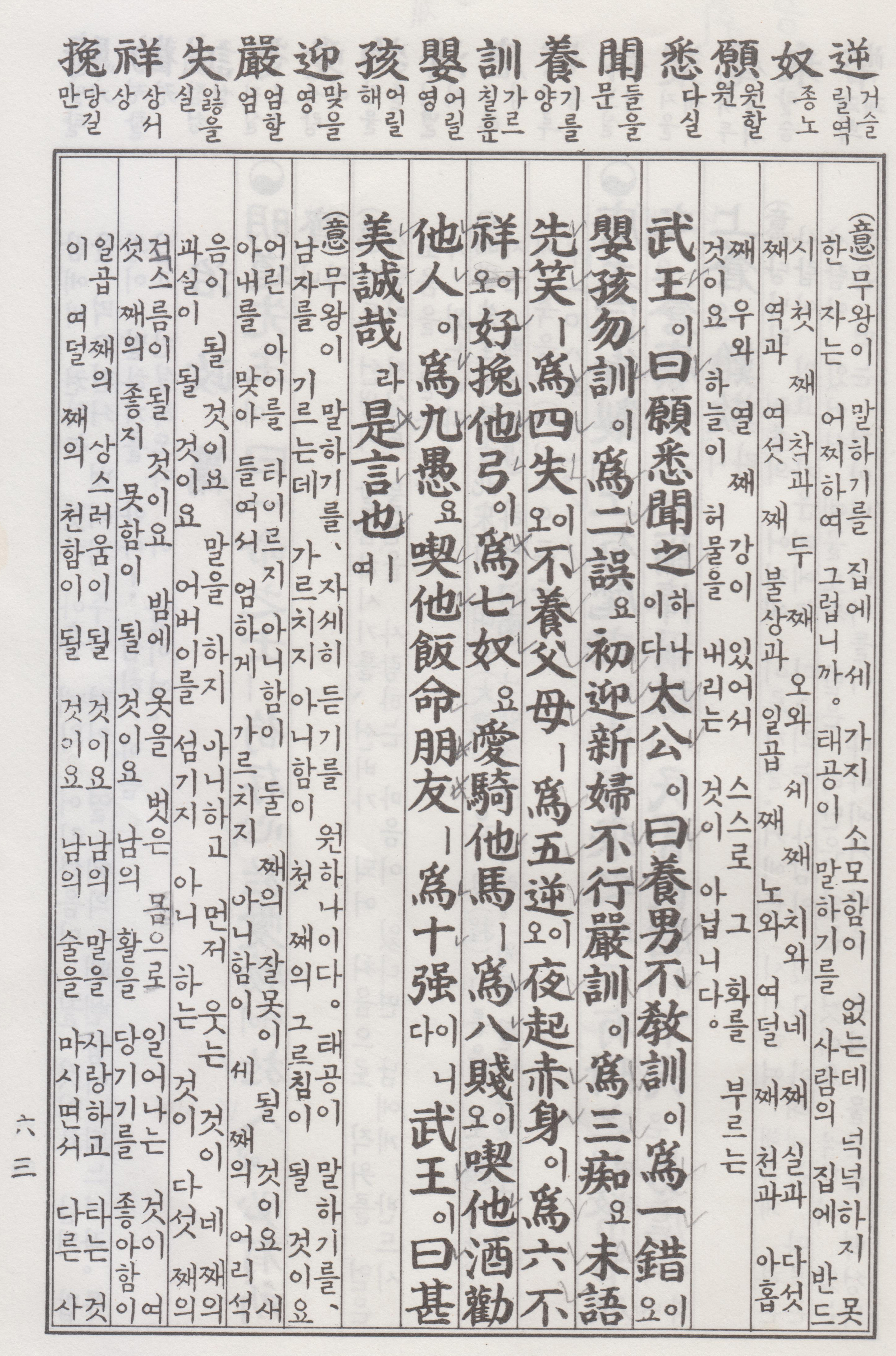 武王曰, 願悉聞之。太公曰, 養男不敎訓爲一錯, 嬰孩勿訓爲二誤, 初迎新婦不行嚴訓爲三痴, 未語先笑爲四失, 不養父母爲五逆, 夜起赤身爲六不祥, 好挽他弓爲七奴, 愛騎他馬爲八賤, 喫他酒勸他人爲九愚, 喫他飯命朋友爲十强。武王曰, 甚美誠哉, 是言也。