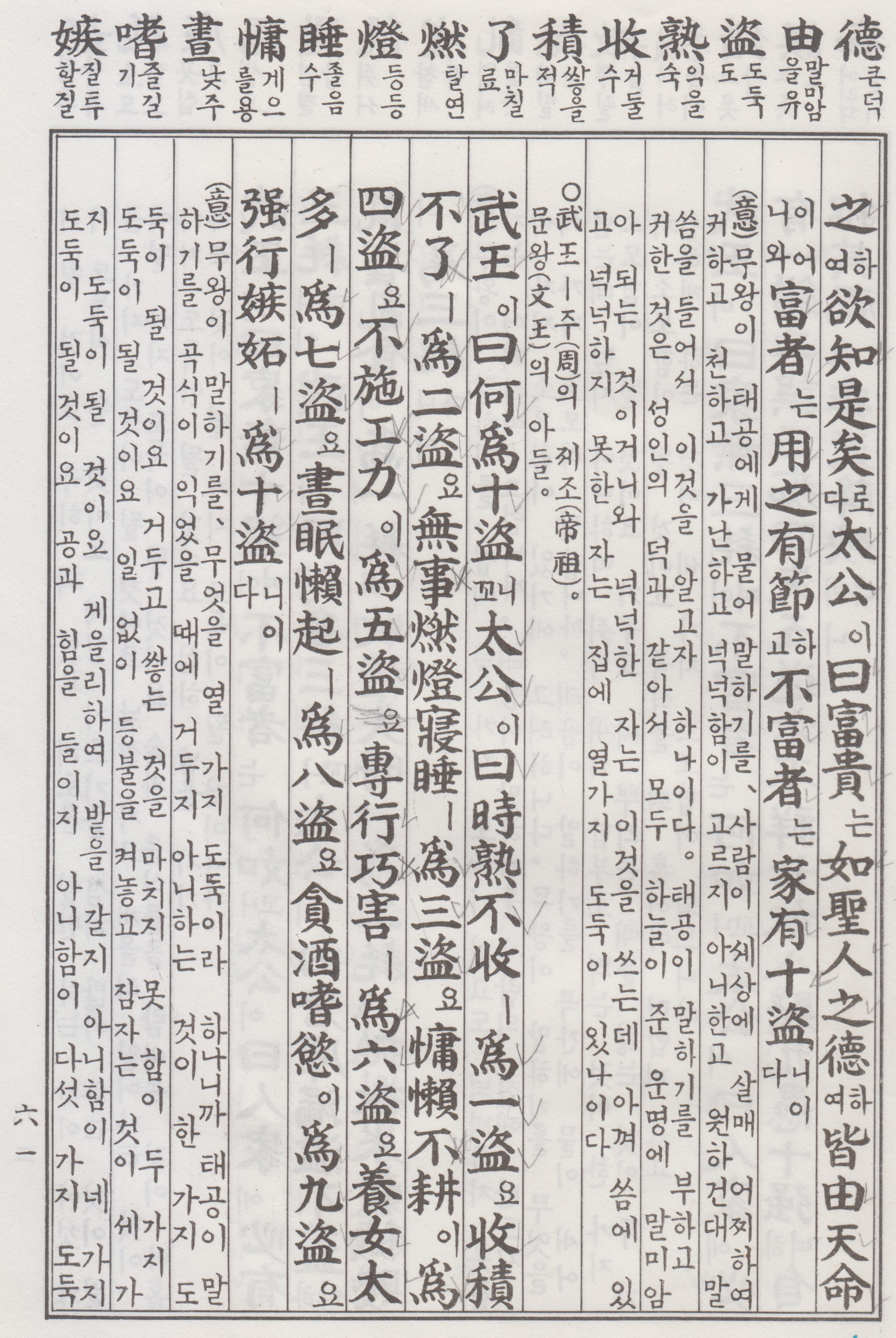 武王曰, 何爲十盜。太公曰, 時熟不收爲一盜, 收積不了爲二盜, 無事燃燈寢睡爲三盜, 慵懶不耕爲四盜, 不施工力爲五盜, 專行巧害爲六盜, 養女太多爲七盜, 晝眠懶起爲八盜, 貪酒嗜慾爲九盜, 强行嫉妬爲十盜。