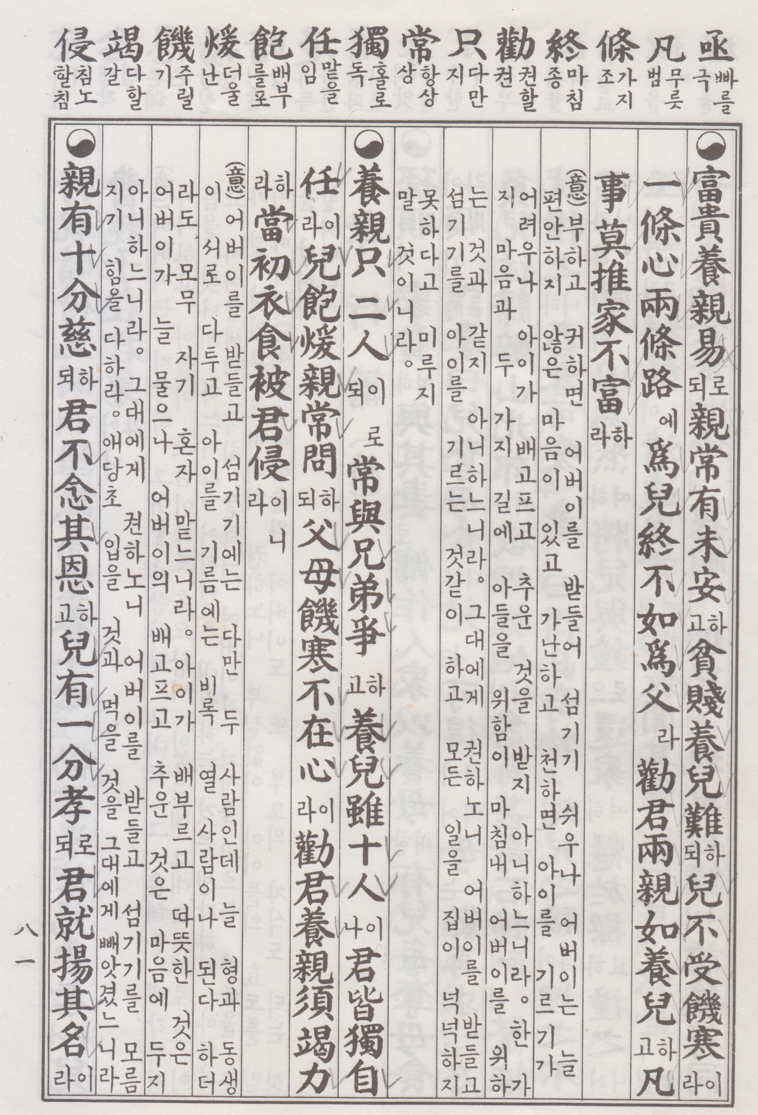 親有十分慈, 君不念其恩, 兒有一分孝, 君就揚其名, 待親暗待子明, 誰識高堂養子心, 勸君漫信兒曹孝, 兒曹親子在君身。