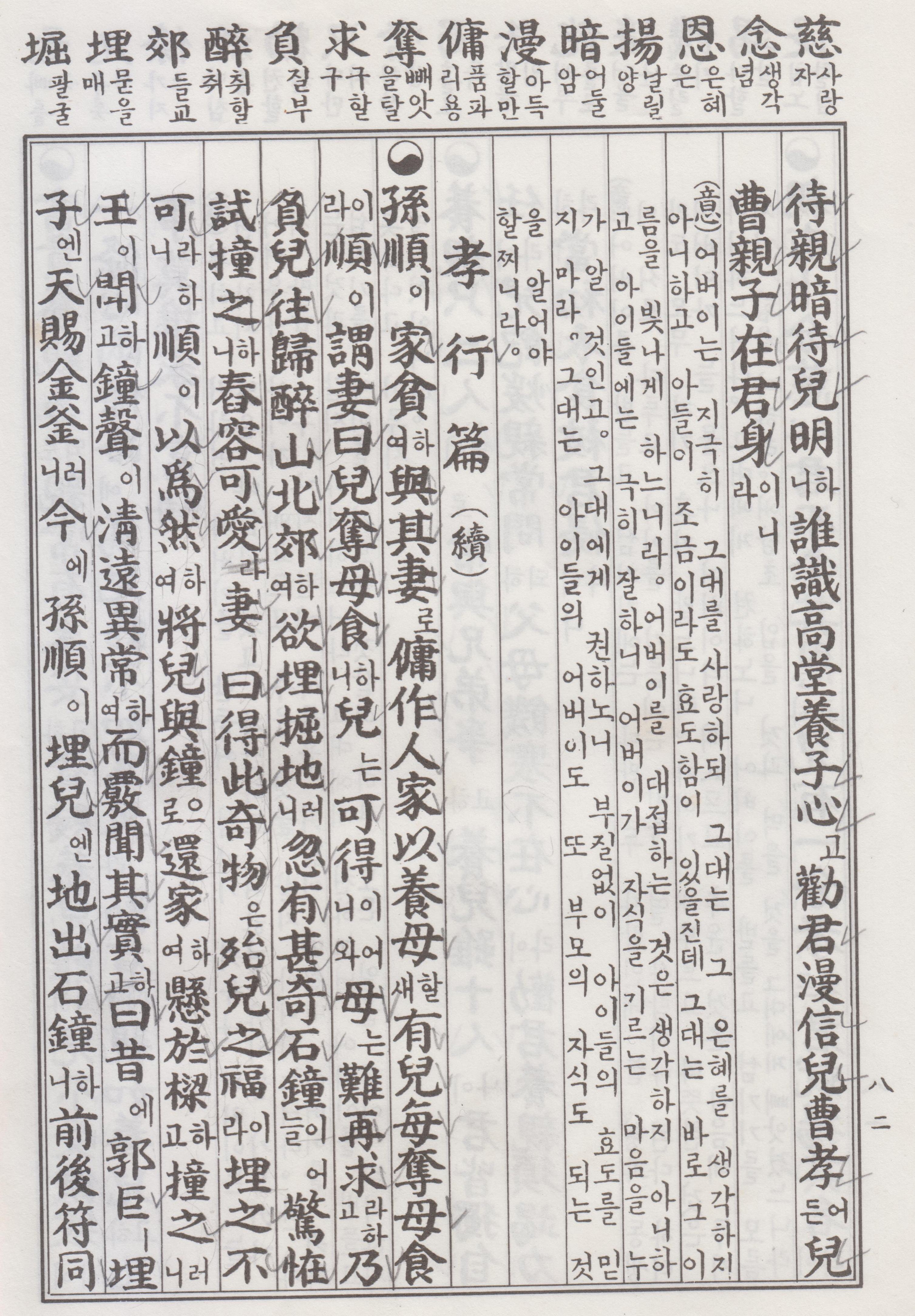 孫順, 家貧, 與其妻傭作人家以養母, 有兒每奪母食。 順謂妻曰兒奪母食, 兒可得, 母難再求。 乃負兒往歸醉山北郊, 欲埋堀地, 忽有甚寄石鐘, 驚怪試撞之, 舂容可愛。 妻曰得此寄物, 殆兒之福, 埋之不可。 順以爲然, 將兒與鐘還家, 懸於樑撞之。 王聞鐘聲淸遠異常而覈聞其實, 曰昔郭巨埋子, 天賜金釜, 今孫順埋兒, 地出石種, 前後符同。 賜家一區, 歲給米五十石。