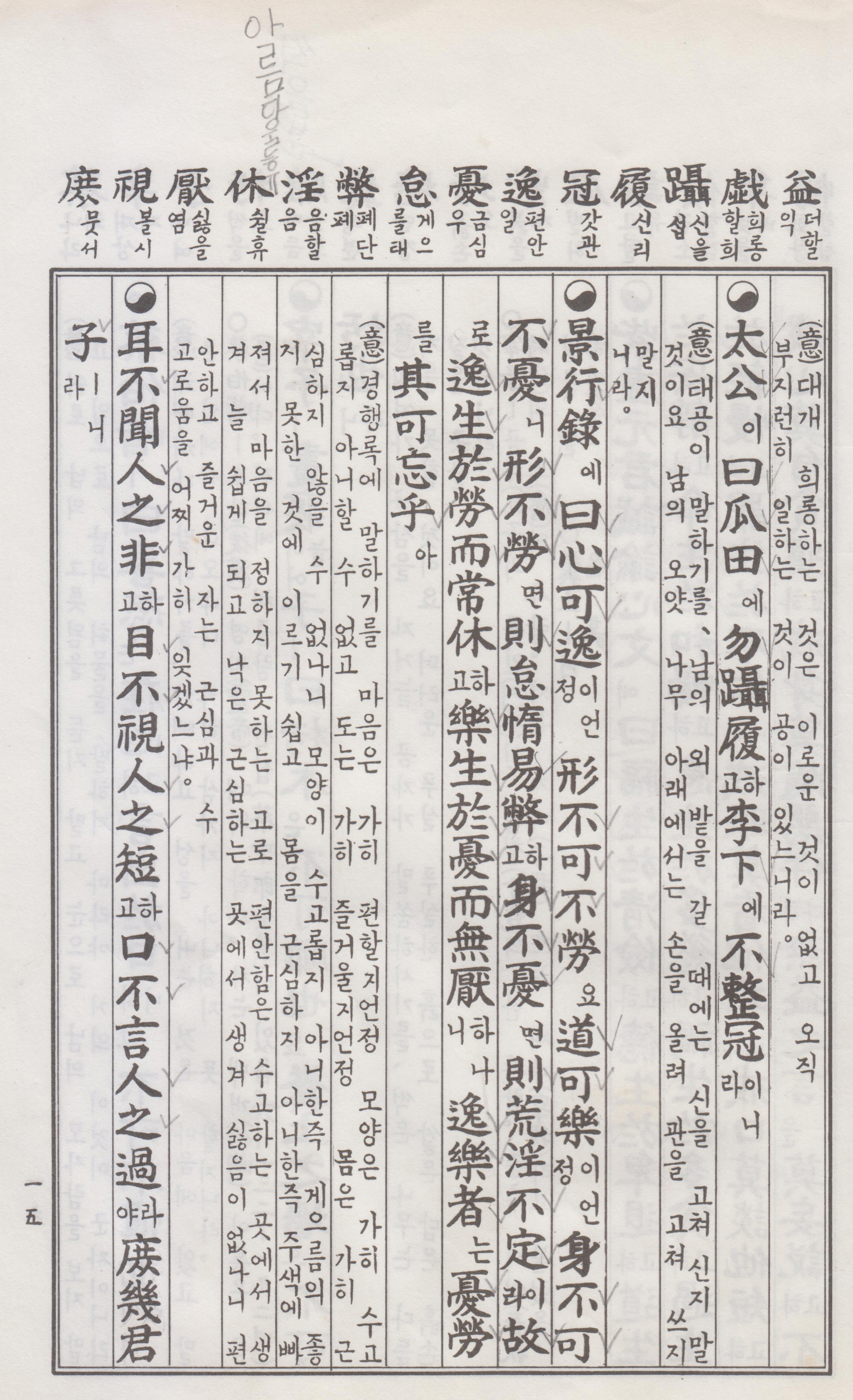 景行錄曰, 心可逸, 形不可不勞。道可樂, 身不可不憂。形不勞, 則怠惰易弊。身不憂, 則荒淫不定。故, 逸生於勞而常休, 樂生於憂而無厭, 逸樂者憂勞其可忘乎。