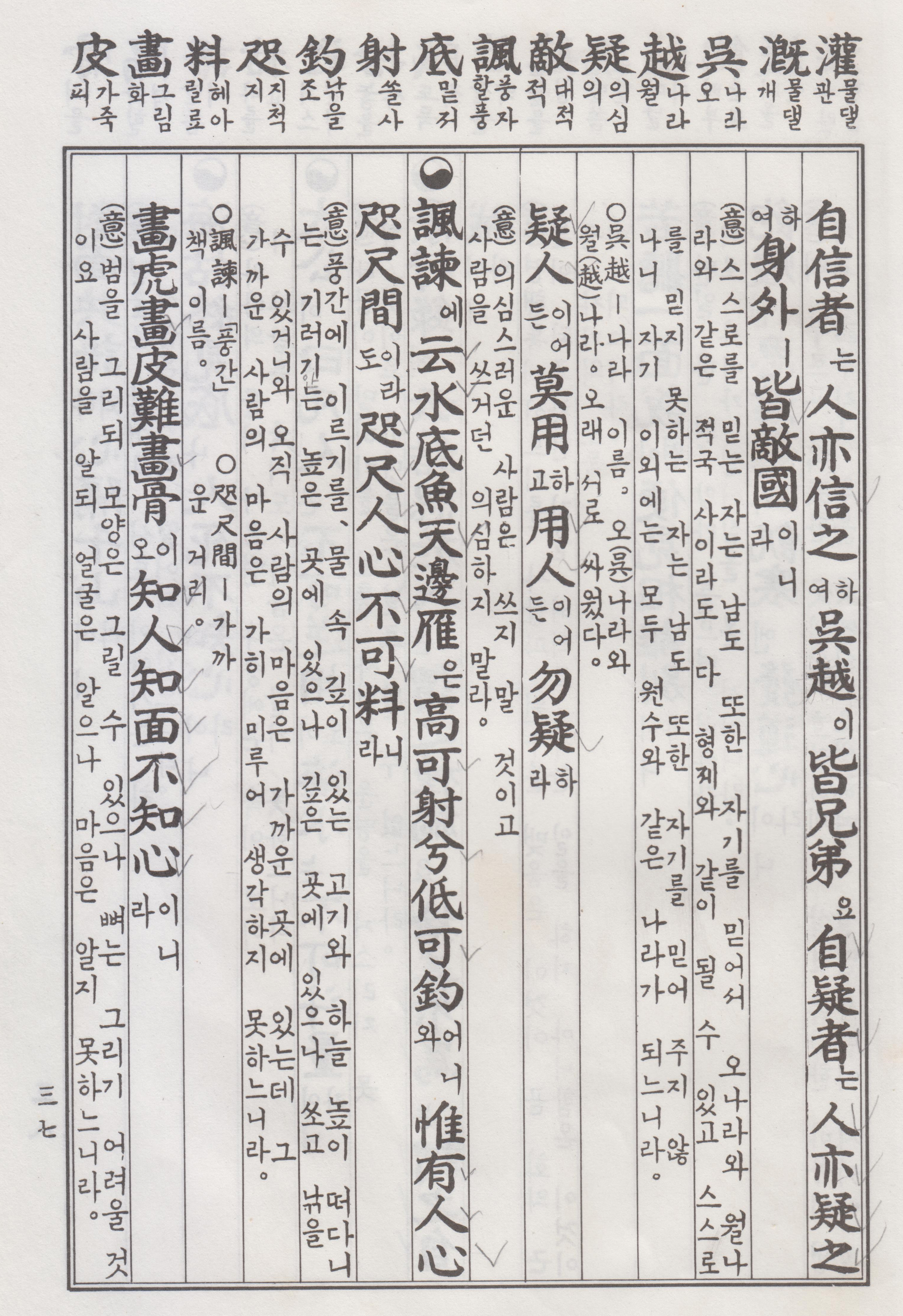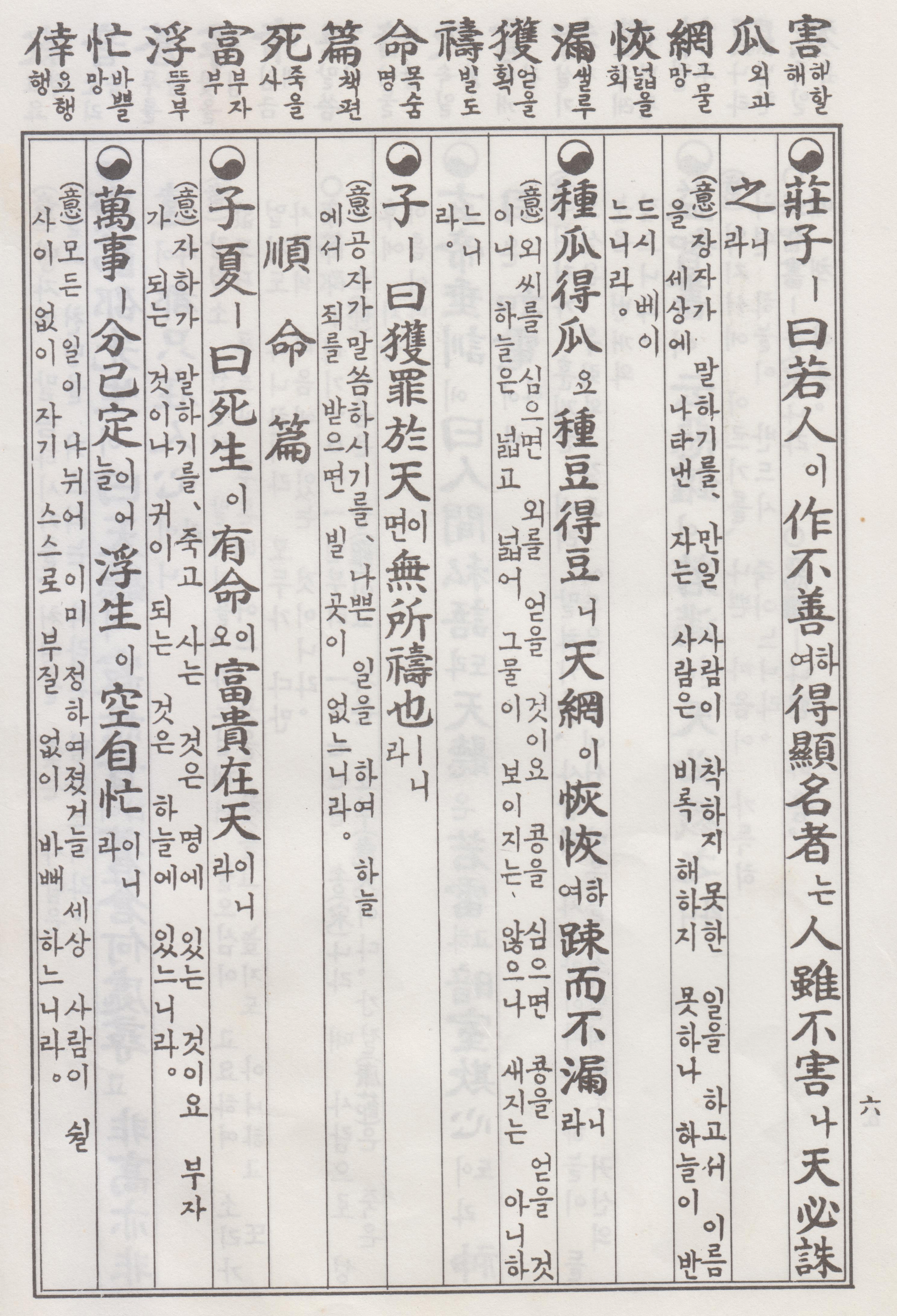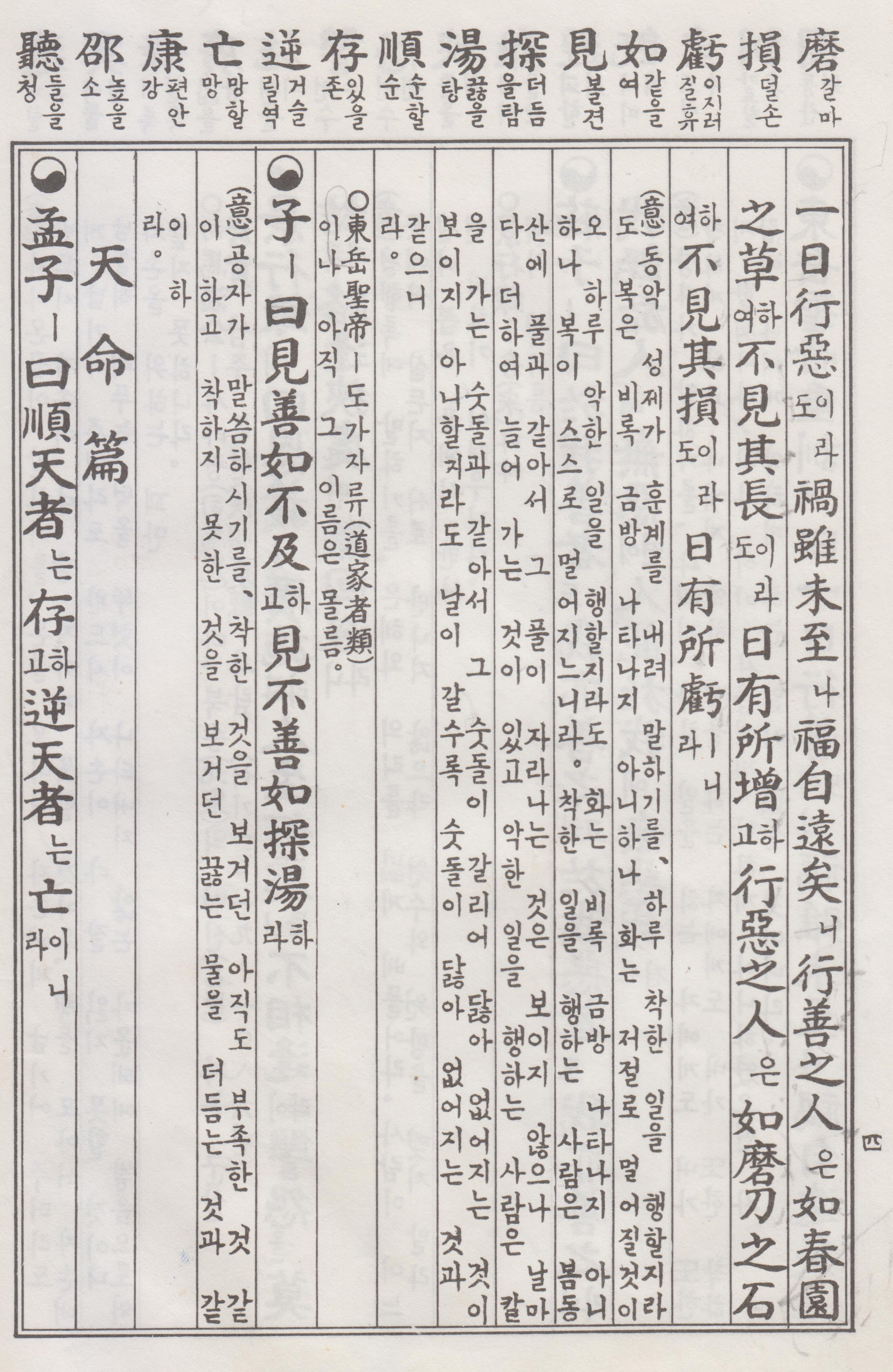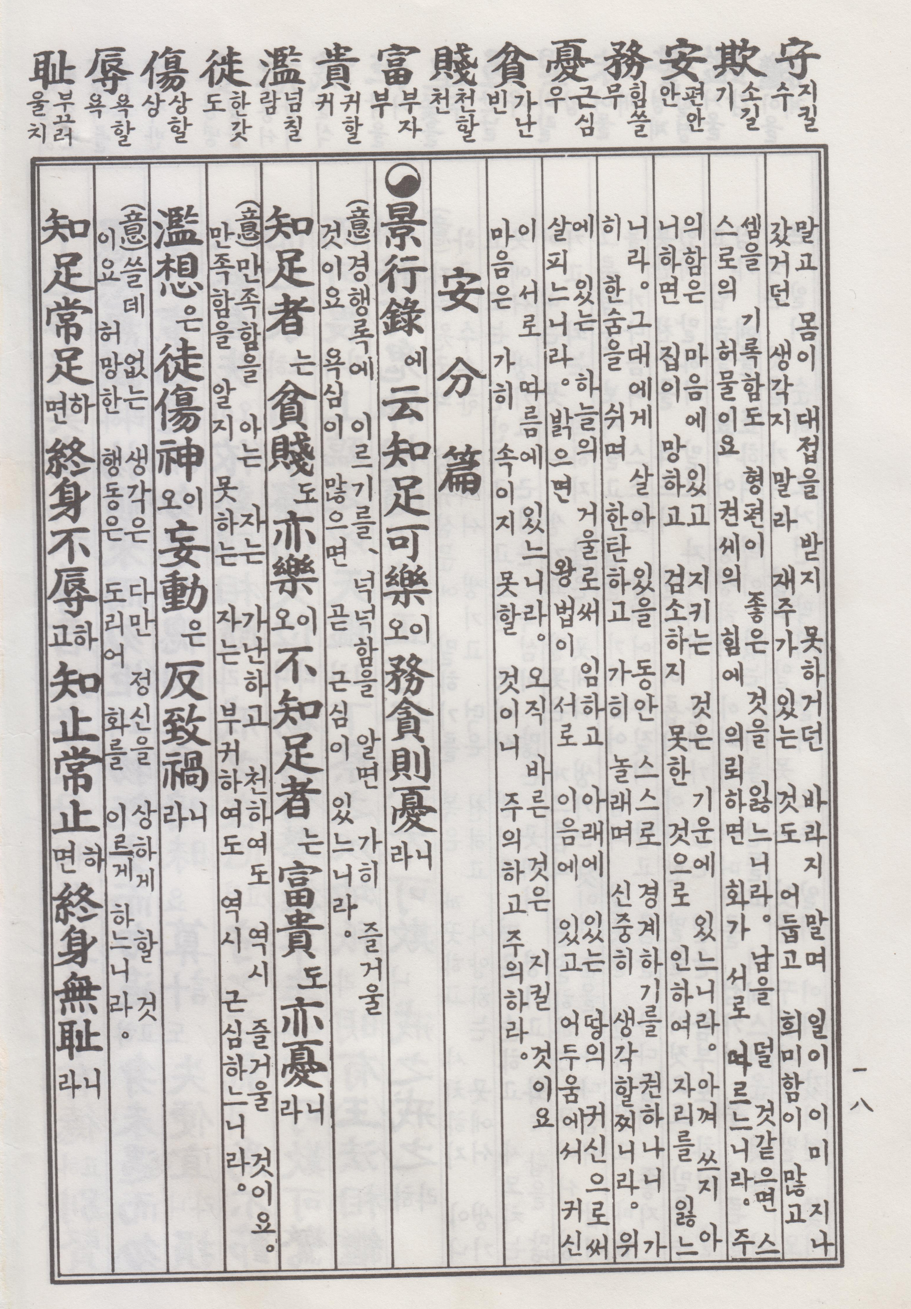 子張欲行, 辭於夫子, 願賜一言, 爲修身之美。子曰, 百行之本, 忍之爲上。子張曰, 何爲忍之。子曰, 天子忍之, 國無害, 諸侯忍之, 成其大, 官吏忍之, 進其位, 兄弟忍之, 家富貴, 夫妻忍之, 終其世, 朋友忍之, 名不廢, 自身忍之, 無禍害。