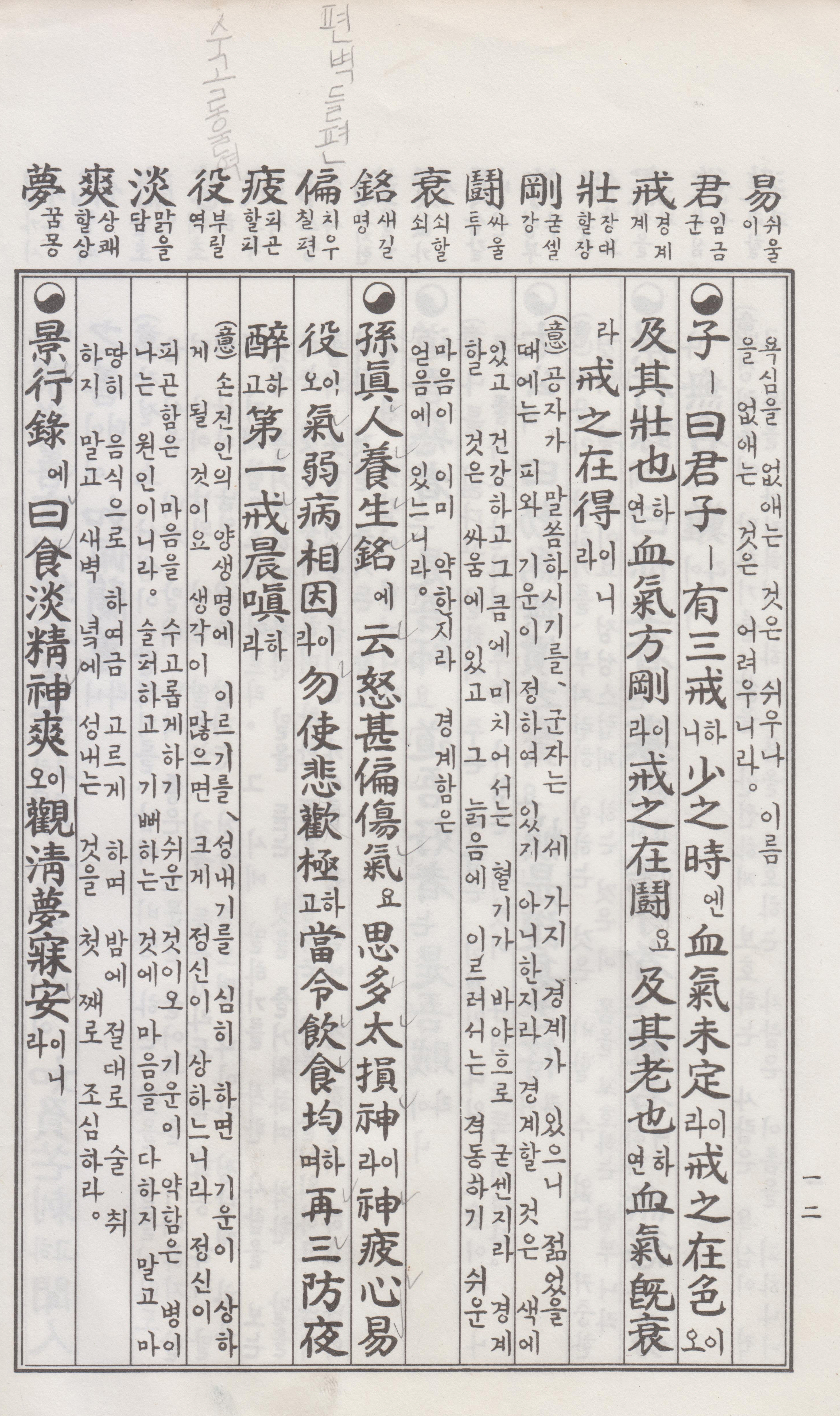 子曰, 君子有三戒, 少之時, 血氣未定, 戒之在色。及其壯也, 血氣方剛, 戒之在鬪。及其老也, 血氣旣衰, 戒之在得。