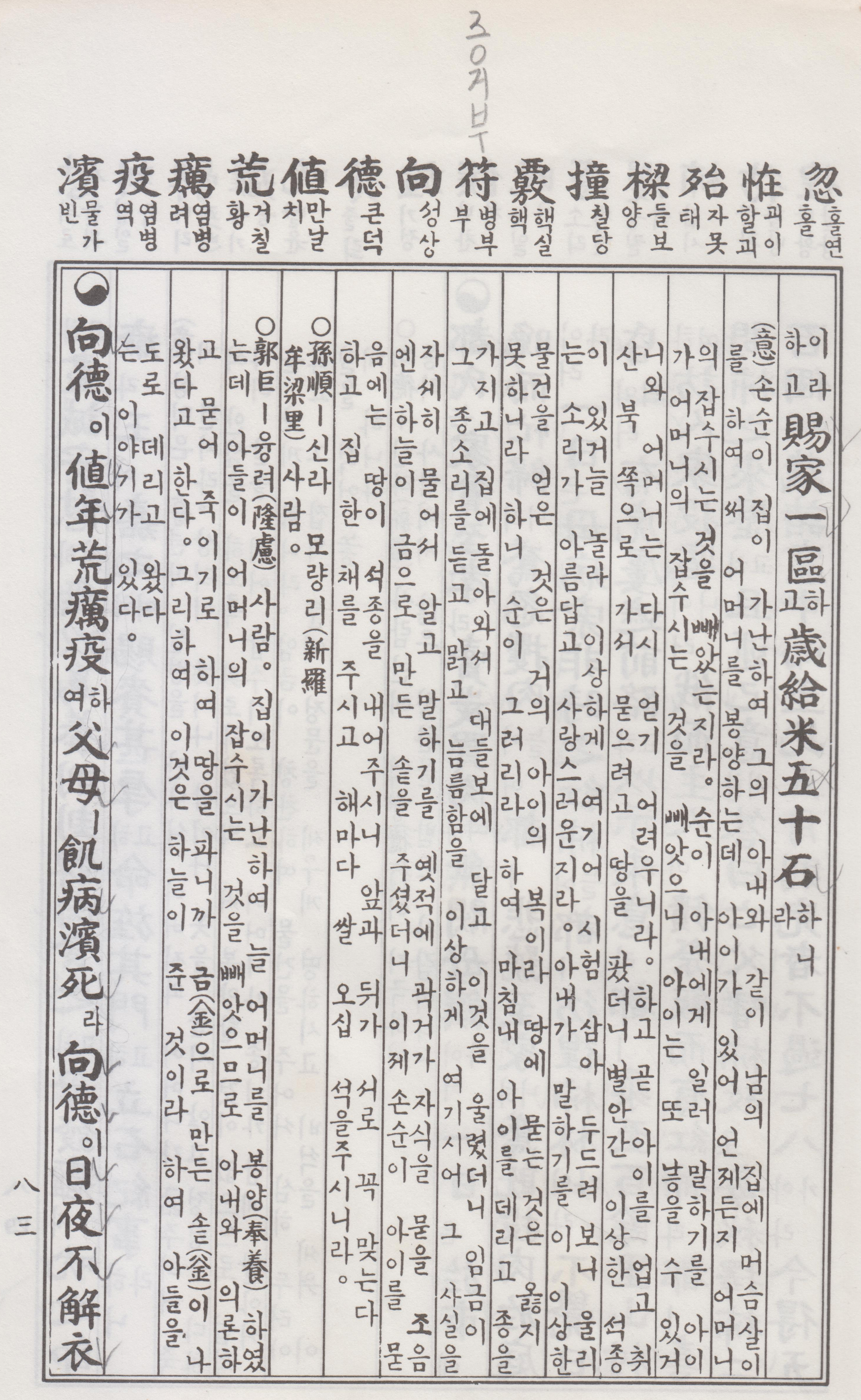 向德, 値年荒癘疫, 父母飢病濱死, 向德日夜不解衣, 盡誠安慰, 無以爲養, 則刲髀肉食之。 母發癰, 吮之卽癒。 王嘉之, 賜賚甚厚, 命旌其門, 立石紀事。