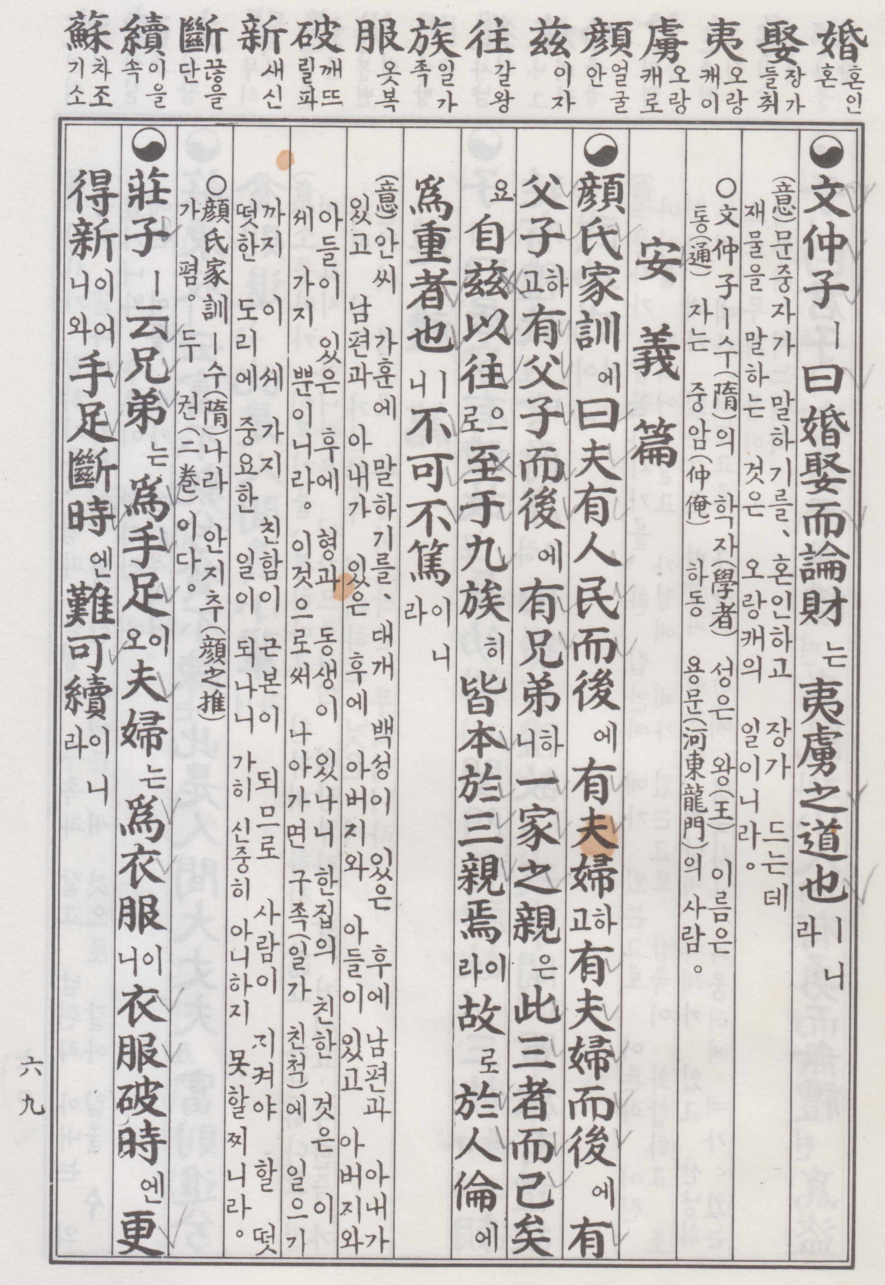 顔氏家訓曰, 夫有人民而後有夫婦, 有夫婦而後有父子, 有父子而後有兄弟, 一家之親, 此三者而已矣。自玆以往, 至于九族, 皆本於三親焉。故, 於人倫, 爲重也, 不可無篤。