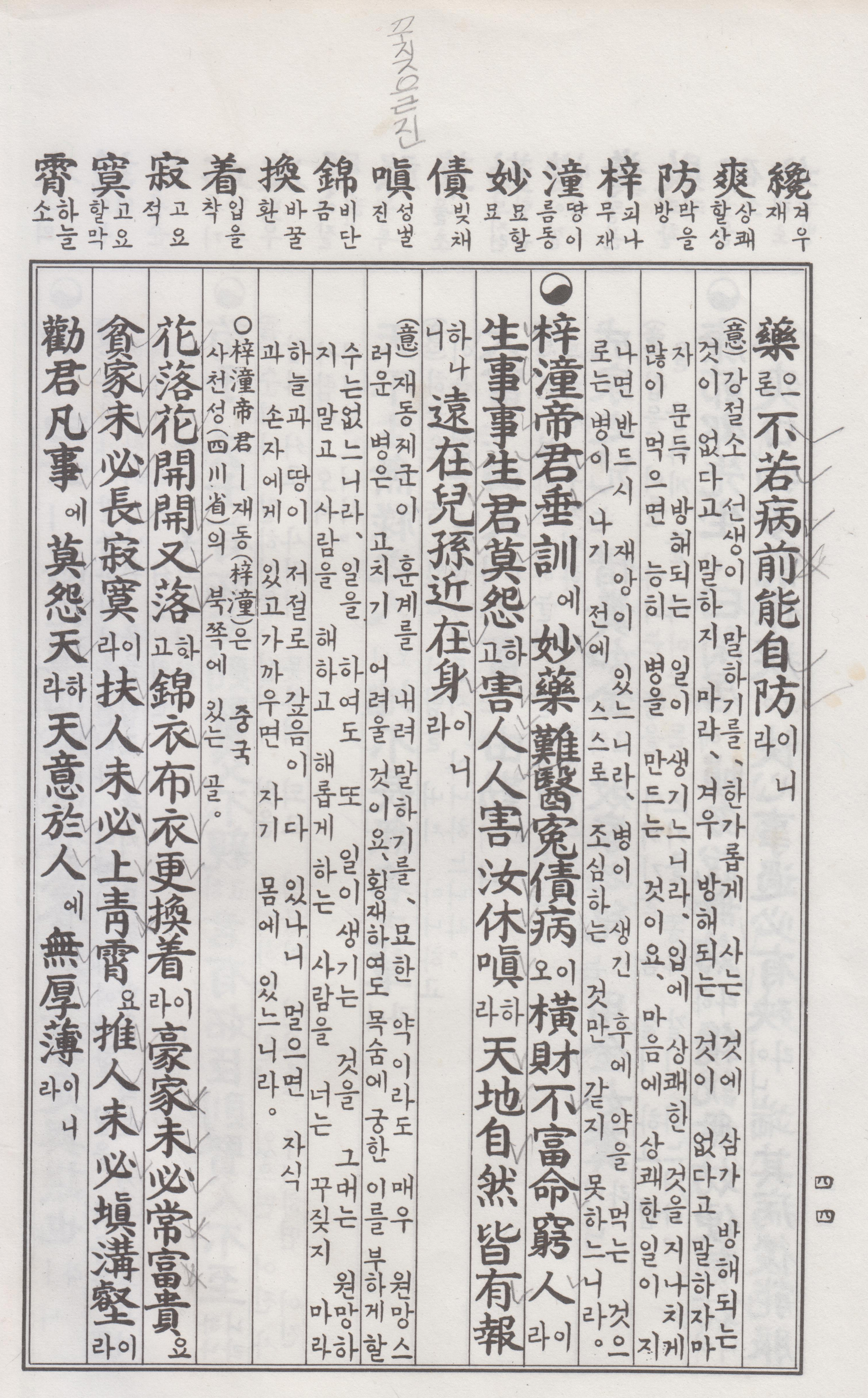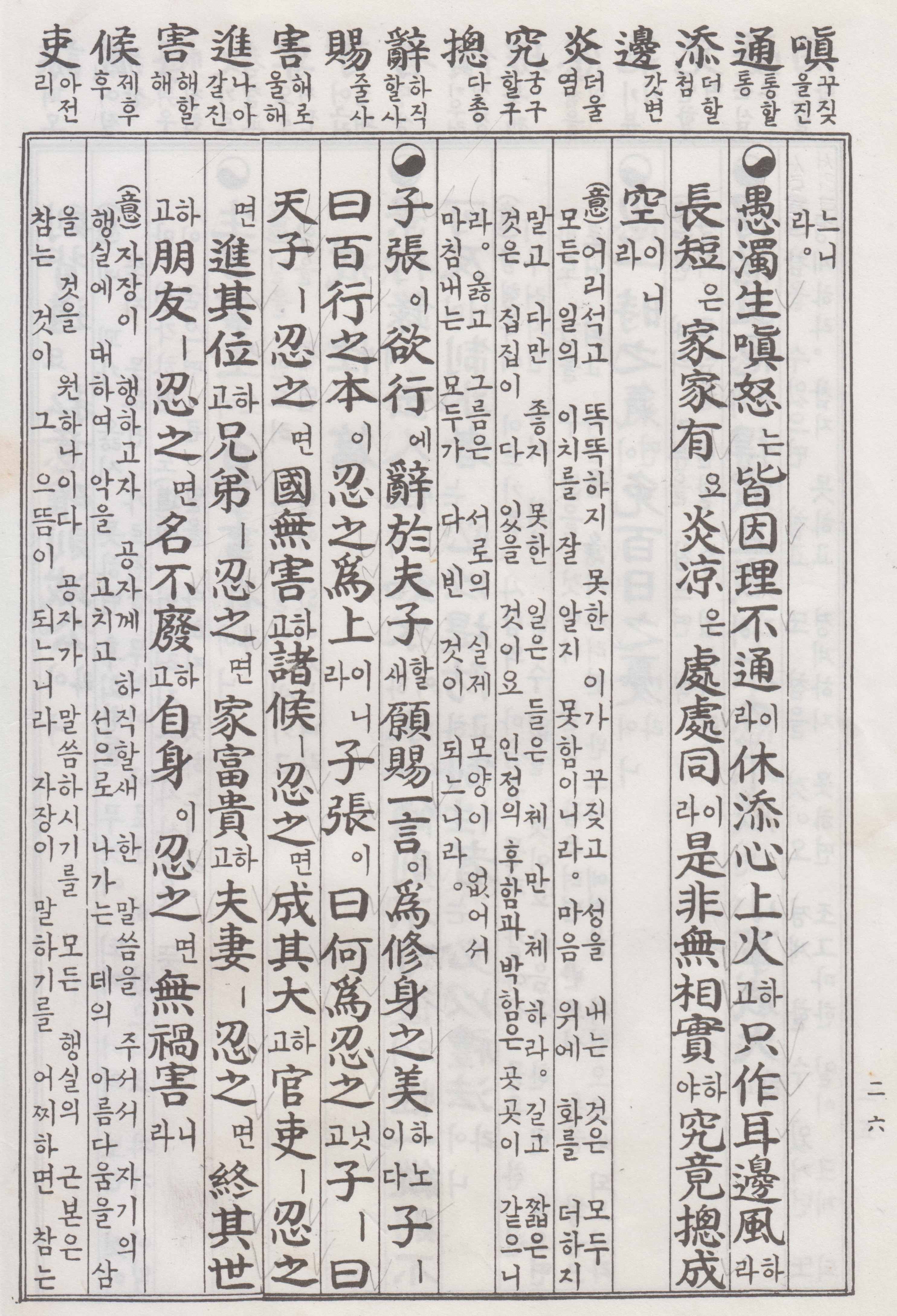 愚濁生嗔怒, 皆因理不通, 休添心上火, 只作耳邊風, 長短家家有, 炎凉處處同, 是非無相實, 究竟摠成空。