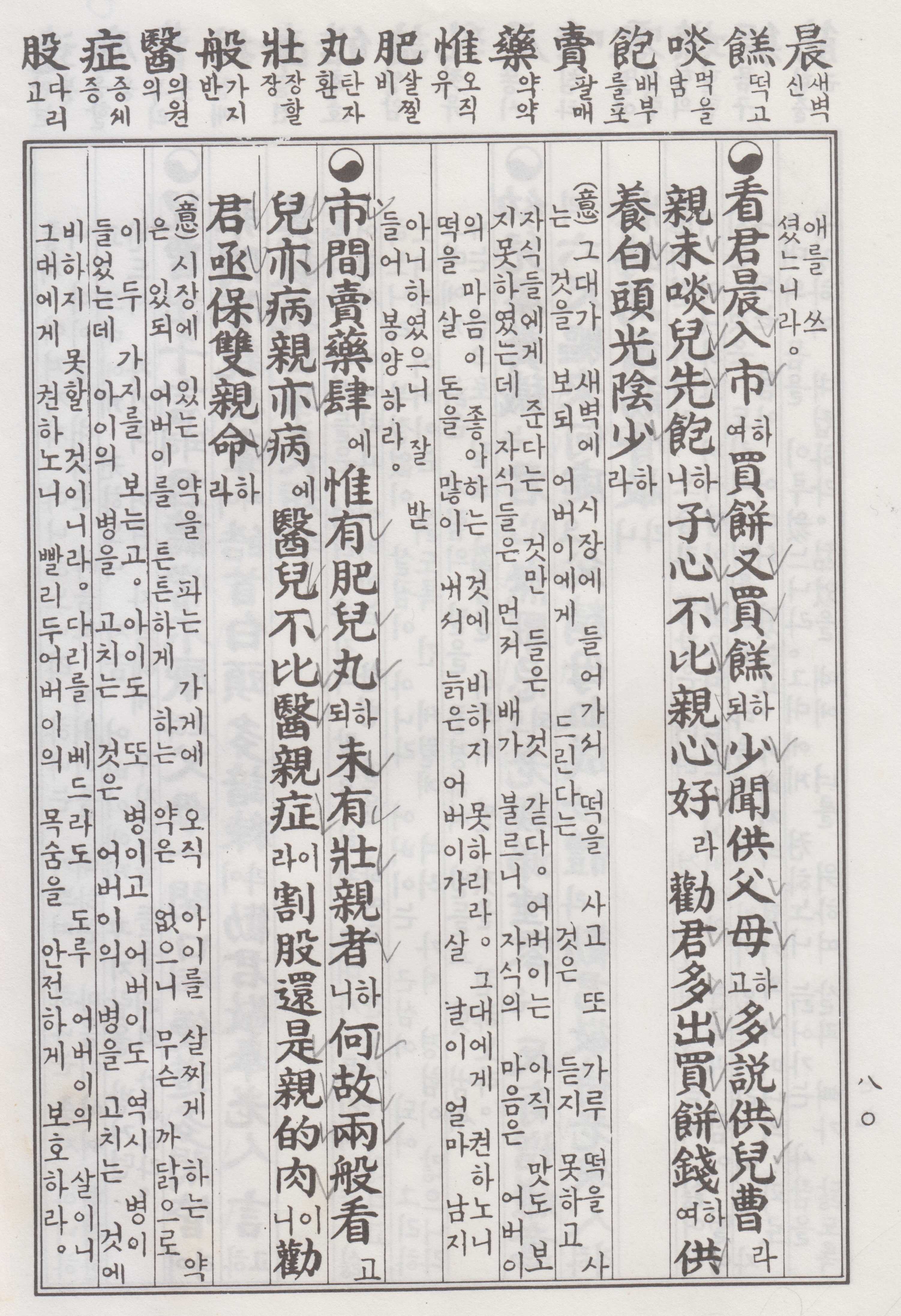 市間賣藥肆, 惟有肥兒丸, 未有壯親者, 何故兩般看, 兒亦病親亦病, 醫兒不比醫親症, 割股還是親的肉, 勸君亟保雙親命。