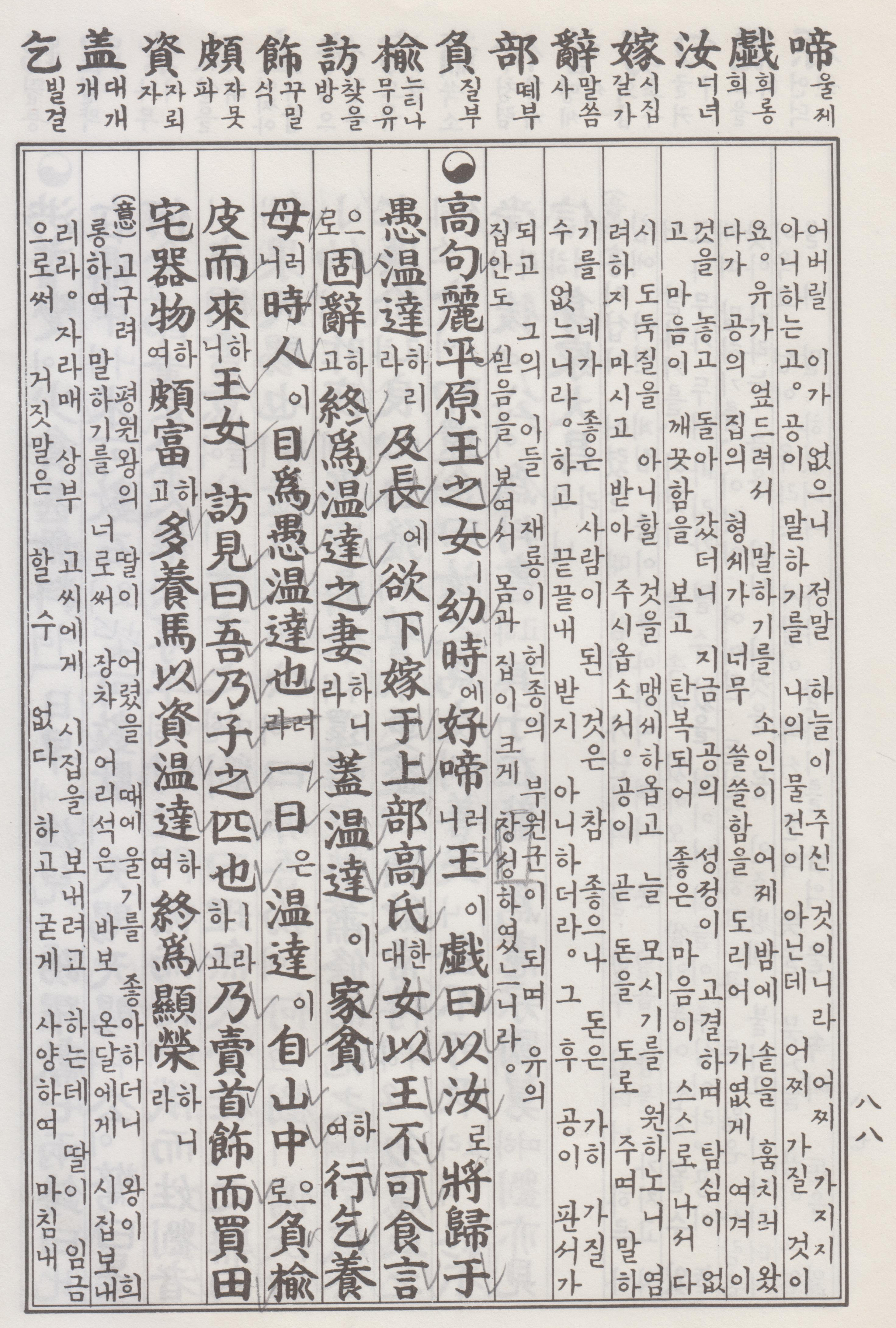 高句麗平原王之女, 幼時好啼。 王戱曰以汝將歸于溫達。 及長, 欲下嫁于上部高氏, 女以王不可食言, 固辭, 終爲溫達之妻。 蓋溫達家貧, 行乞養母, 時人目爲愚溫達也。 一日, 溫達自山中, 負楡皮而來。 王女訪見曰吾乃子之匹也。 乃賣首飾而買田宅器物, 頗富, 多養馬以資溫達, 終爲顯榮。