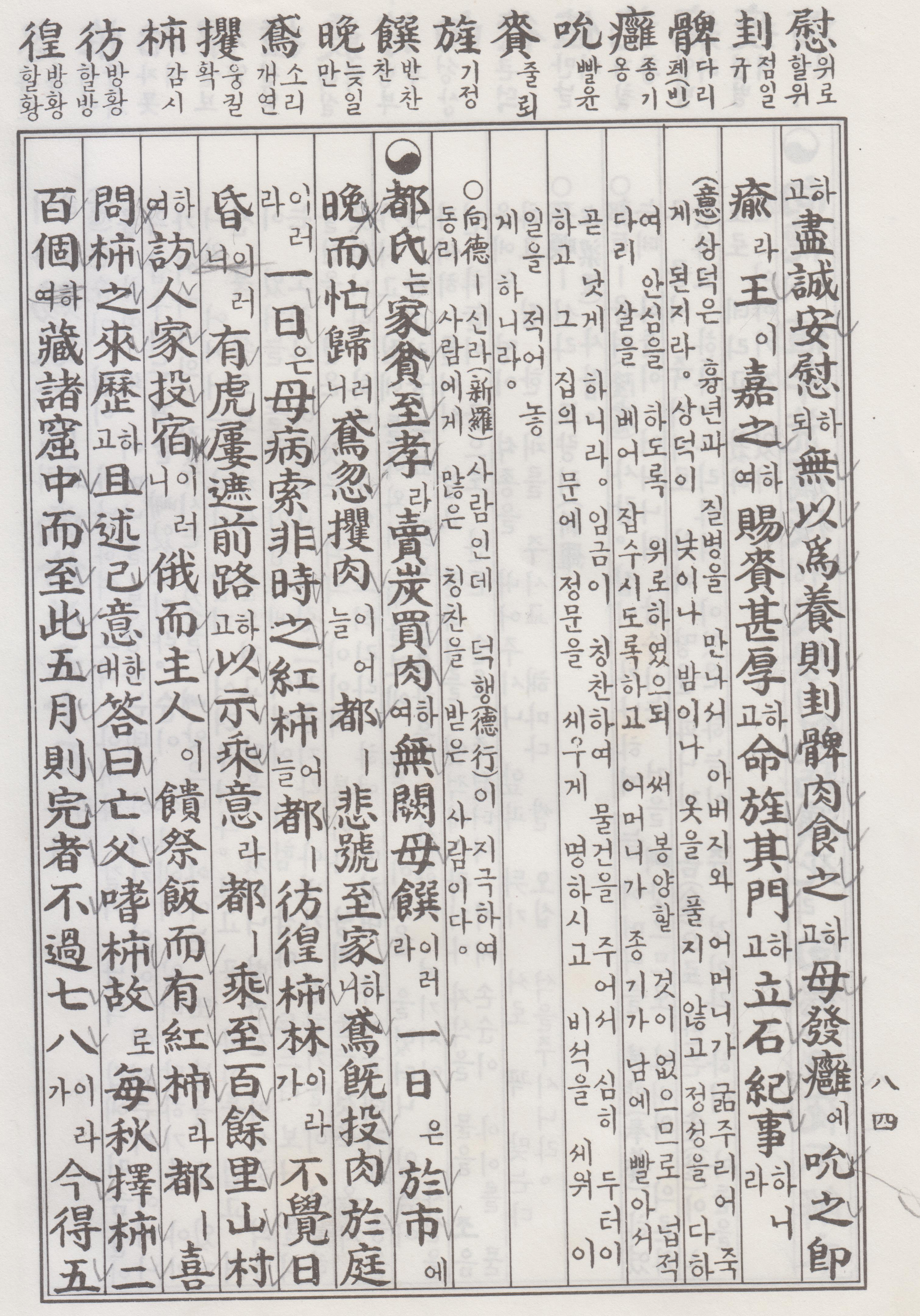 都氏家貧至孝, 賣炭買肉, 無闕母饌。 一日於市, 晩而忙歸, 鳶忽攫肉, 都悲號至家, 鳶旣投肉於庭。 一日母病索非時之紅柿, 都, 彷徨柿林, 不覺日昏, 有虎屢遮前路, 以示乘意, 都, 乘至百餘里山村, 訪人家投宿, 俄而主人, 饋祭飯而有紅柿, 都, 喜問柿之來歷, 且述己意, 答曰亡父嗜柿故, 每秋擇柿二百個, 藏諸窟中而至此五月則完者不過七八, 今得五十個完者故, 心異之, 是天感君孝, 遺以二十顆, 都謝出門外, 虎尙俟伏, 乘至家, 曉鷄喔喔。 後 ,母以天命終, 都有血淚。