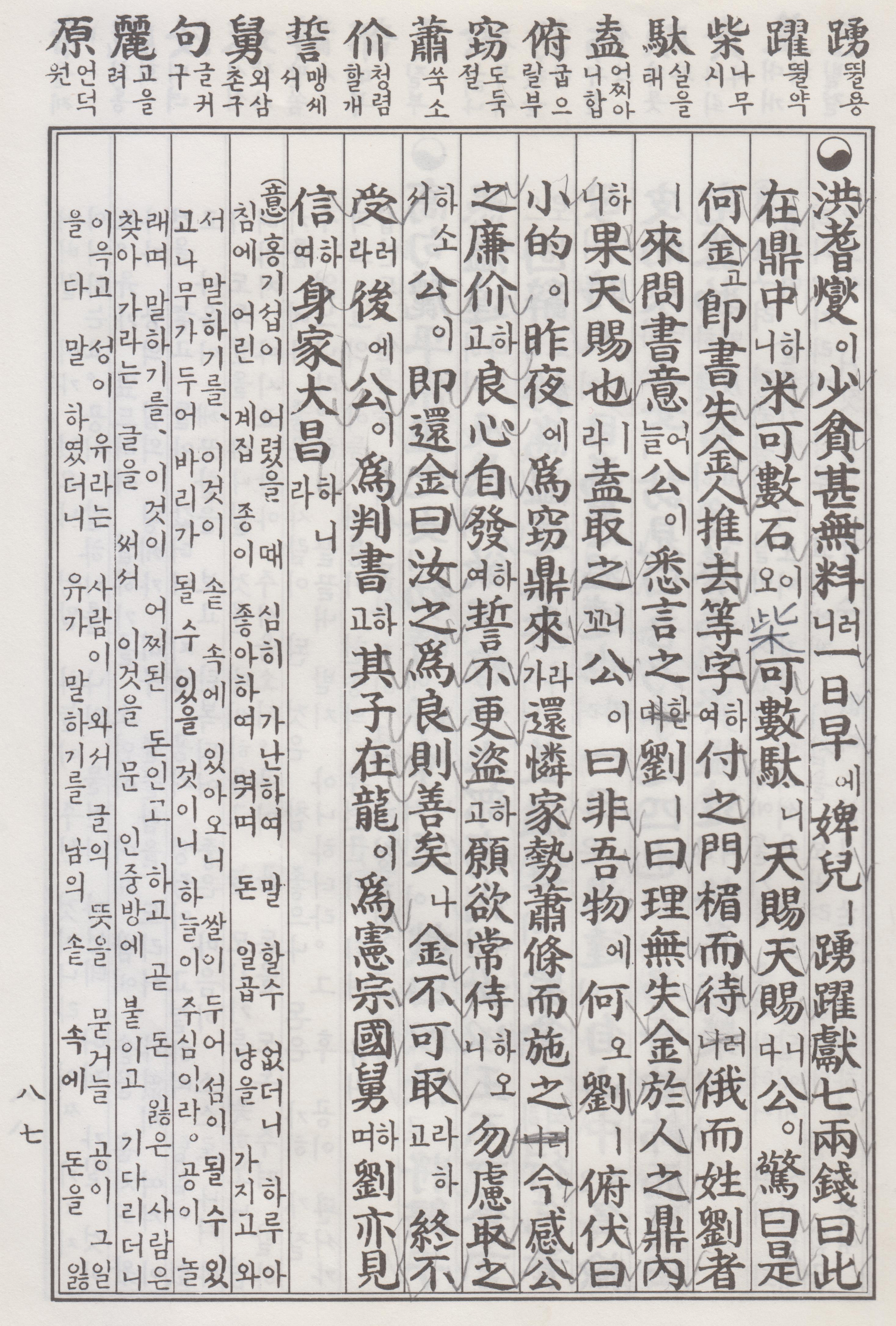 洪基燮, 少貧甚無料。 一日早, 婢兒踊躍獻七兩錢曰此在鼎中, 米可數石, 柴可數駄, 天賜天賜。 公驚曰是何金。 卽書失金人推去等字, 付之門楣而待。 俄而姓劉者, 來問書意, 公悉言之。 劉曰理無失金於人之鼎內, 果天賜也, 盍取之。 公曰非吾物, 何。 劉俯伏曰小的, 昨夜, 爲竊鼎來, 還燐家勢蕭條而施之, 今感公之廉价, 良心自發, 誓不更盜, 願欲常侍, 勿慮取之。 公卽還金曰, 汝之爲良則善矣, 金不可取, 終不受。 後, 公爲判書, 其子在龍爲憲宗國舅, 劉亦見信, 身家大昌。