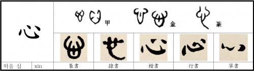 바로 뒤에 나오는 얘기지만, 이 도심(道心)과 인심(人心) 양자는 사방 일촌(一寸)의 공간[方寸之間]에 마구 섞여 있다고 합니다[二者雜於方寸之間]. 여기서 방촌(方寸)이라는 것은 구체적으로 하트(heart)라는 신체기관(organ)을 지칭합니다. 심(心)이란 글자를 갑골문에서 찾아보면 심장의 2심방 2심실을 나타내는 상형자로서 4획은 4공간을 표시하고 있어요. 주자는 바로 이 심(心)을 하트라는 오르간으로 명백히 이해했던 겁니다. 주자 당대의 일상적(popular) 세계관에 이런 기본적인 의학적 사실이 깔려 있다는 데 대한 이해는 주자학 전체의 참 뜻을 밝히는데 필수적입니다. 현대 의학에서는 심장을 혈액순환계(blood circulation system)의 펌프로 설명하지요. 그 원동력은 심근의 박동이구요. 그런데 이 심(心)이란 것은 또한 인간의 정신기능(mental function)을 의미하지 않습니까? 그렇게 된 경위는 명백하게 알 수 있는 것입니다.