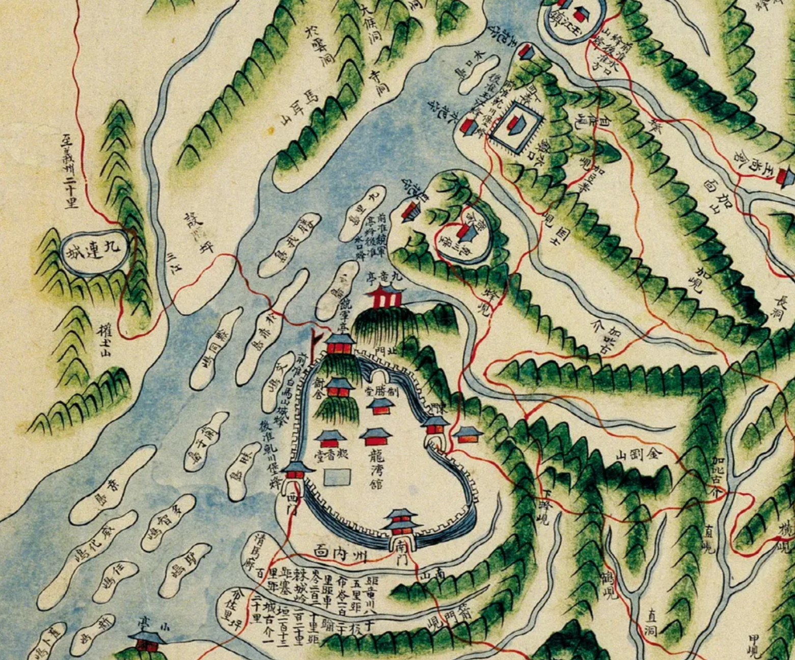 詔使華察「鴨綠江」詩: ‘春江三月送浮槎, 日落潮平兩岸沙. 天地本來分異域, 風塵此去愧皇華. 波飜鴨綠初經雨, 柳帶鵝黃未着花. 四海車書今一統, 東溟文物自商家.’