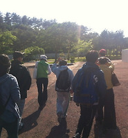 ▲ 무거운 가방을 메고 걸어 다니며 해설사님의 이야기를 듣는 아이들.