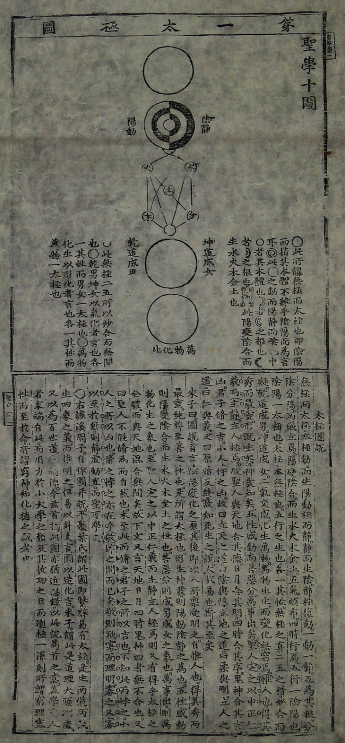 이황과 이이도 물론 예외가 아니었다. 특히 이황은 주희의 가르침을 열 장의 그림으로 형상화하고 그것을 설명하는 글을 지어 임금에게 바쳤다. 그것이 바로 유명한 『성학십도(聖學十圖)』라는 책이다. 아래의 사진은 그중 첫 번째 그림에 해당된다.