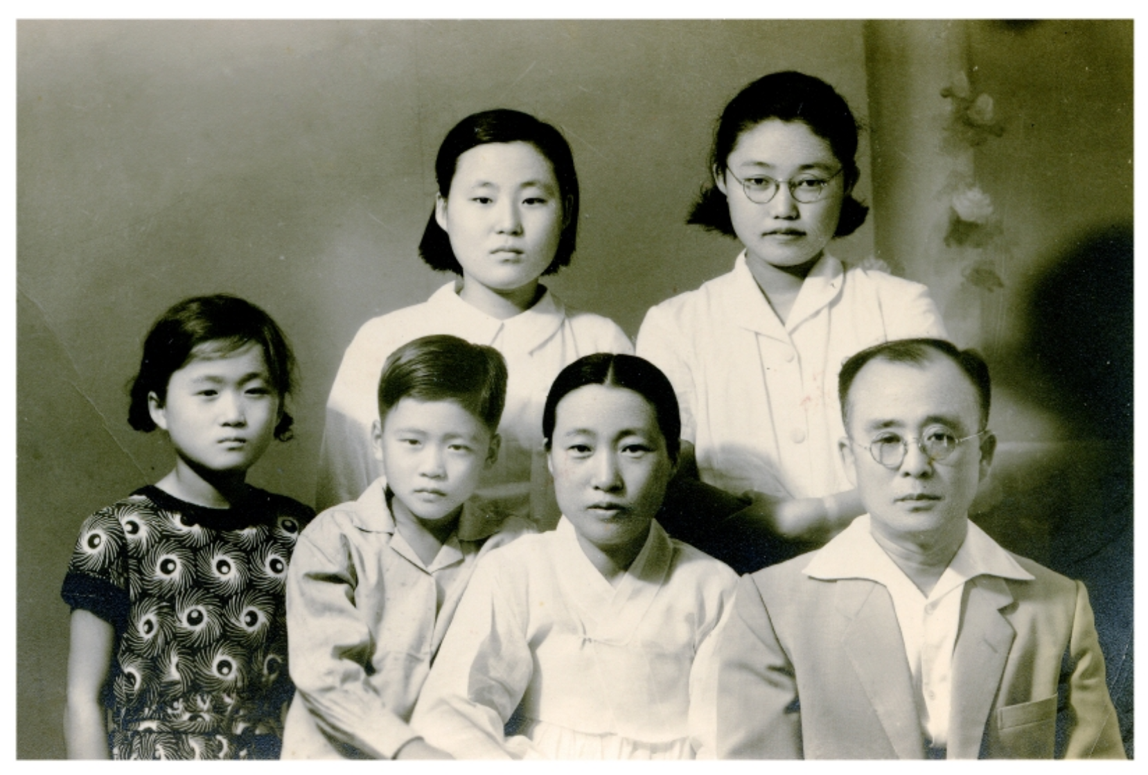 ▲ 1954년 도올 선생 가족사진, 뒷줄에서 시계방향 큰누나 숙희(전 교육부장관), 광주홍안과 사촌누나 영자, 아버지 김치수, 어머니 홍희남, 도올 선생(초등 2학년), 누나 용주 / 사진 출처 : 해남우리신문(http://www.hnwoori.com)