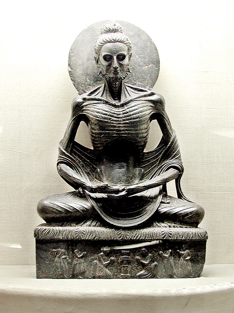 저 광막한 니련선하 건너로 희미하게 하늘을 가리운 산이 전정각산(前正覺山)이다. 그 전정각산 아래로 시타림(屍陀林)이라는 수풀이 있다. 고타마 싯달타는 바로 그 시타림에서 6년동안 뼈를 깎는 고행을 하였다. 지금은 파키스탄의 영토가 되어 있는 라호르(Lahore)라는 곳의 박물관에 소장되어 있는, 기원후 2세기 경에 제작된 간다라풍의 사실적 조각은 고타마 싯달타의 고행이 과연 어떠한 경지의 육체적 학대였는지를 잘 말해 줄 것이다. 싯달타는 하루에 쌀 한 톨과 깨 한 알로만 연명하며 오로지 정진에만 몰두하였다. 이를 악물고 혀를 입천장에 댄 채 마음을 비우고 숨을 죽였다. 온 몸에서는 삐질삐질 땀이 솟으며 뜨거운 열기가 피어올랐다. 안나반나(安那般那)라고 불리우는 지식선(止息禪)의 고행으로 어언 6년간, 그의 몸은 여위어만 갔다. 피골이 상접한 그의 가슴에는 갈비뼈가 앙상하게 드러났고 혈관이 거미줄처럼 뻗어갔다. 배를 만지면 등뼈가 만져지고 움푹 파인 동공 밑으로는 광대뼈가 치솟았다. 이 간다라 예술 걸작품의 작가는 당대의 고행자들의 모습을 실제로 예리하게 관찰하였을 것이다. 갈비뼈나 깡마른 팔뚝의 모습은 해부학적으로도 정확한 형태를 그리고 있다. 그러나 이 걸작품의 위대성은 그러한 사실성에 있는 것은 아니다.