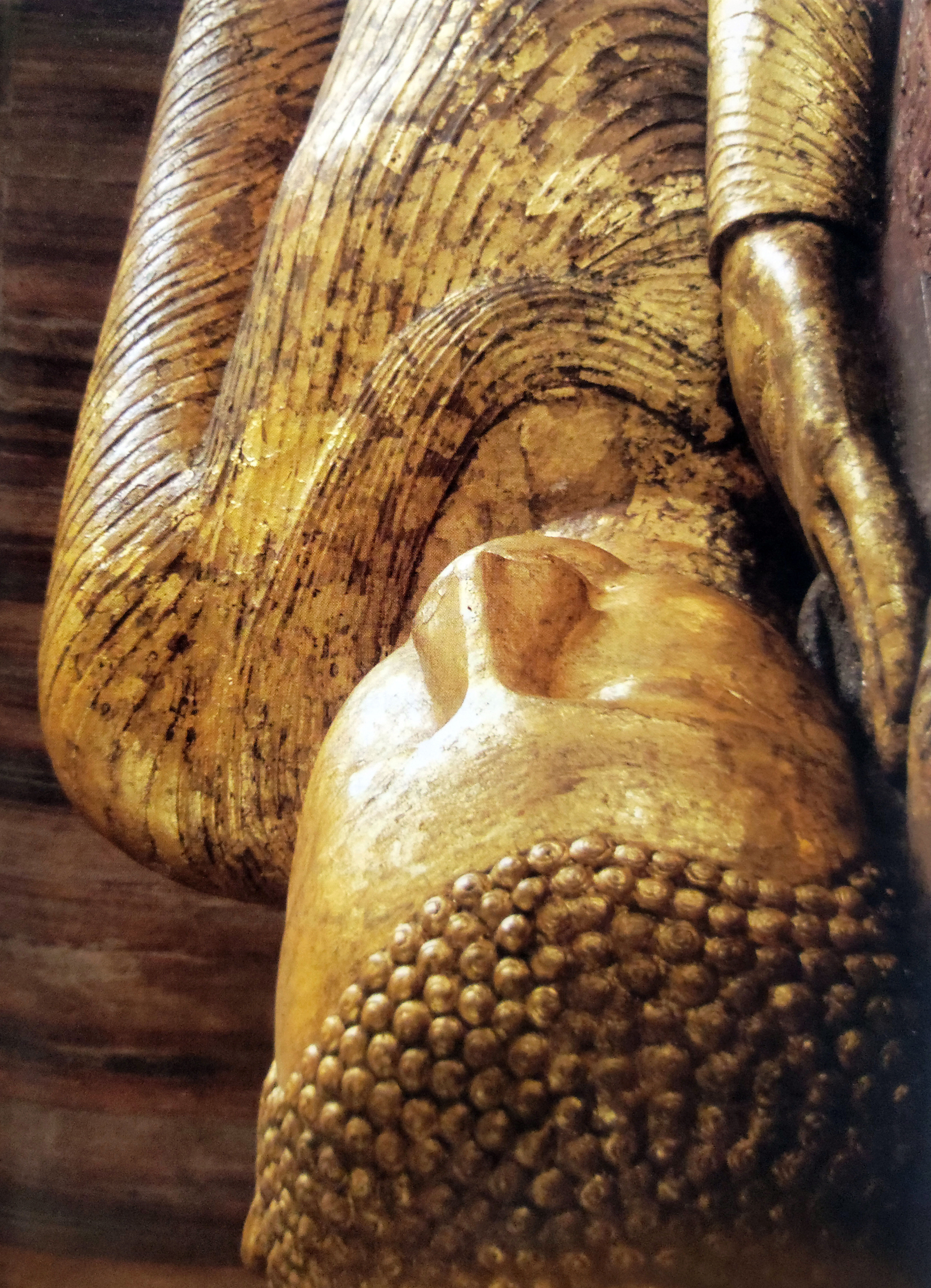 ▲ 와불(臥佛)이라는 말은 있을 수 없다. 모로 누운 부처는 반드시 열반에 드는 싯달타의 죽음의 모습을 그리고 있다. 우리말에 와불은 드러누워 잠자는 부처로 오해될 수가 있다. 모든 와불은 열반상일 뿐이다. 붓다의 열반지인 쿠시나가르에는 AD 417년 꾸마라굽타 1세 (Kumaragupta I) 때 조성된 열반상이 장중한 모습을 드리우고 있다. 내가 목격한 와불중에서는 가장 아름답고 리얼한 걸품이었다. 보통 옷을 입혀 놓았는데 옷을 벗기고 사진 찍느라고 100루피를 주어야 했다.