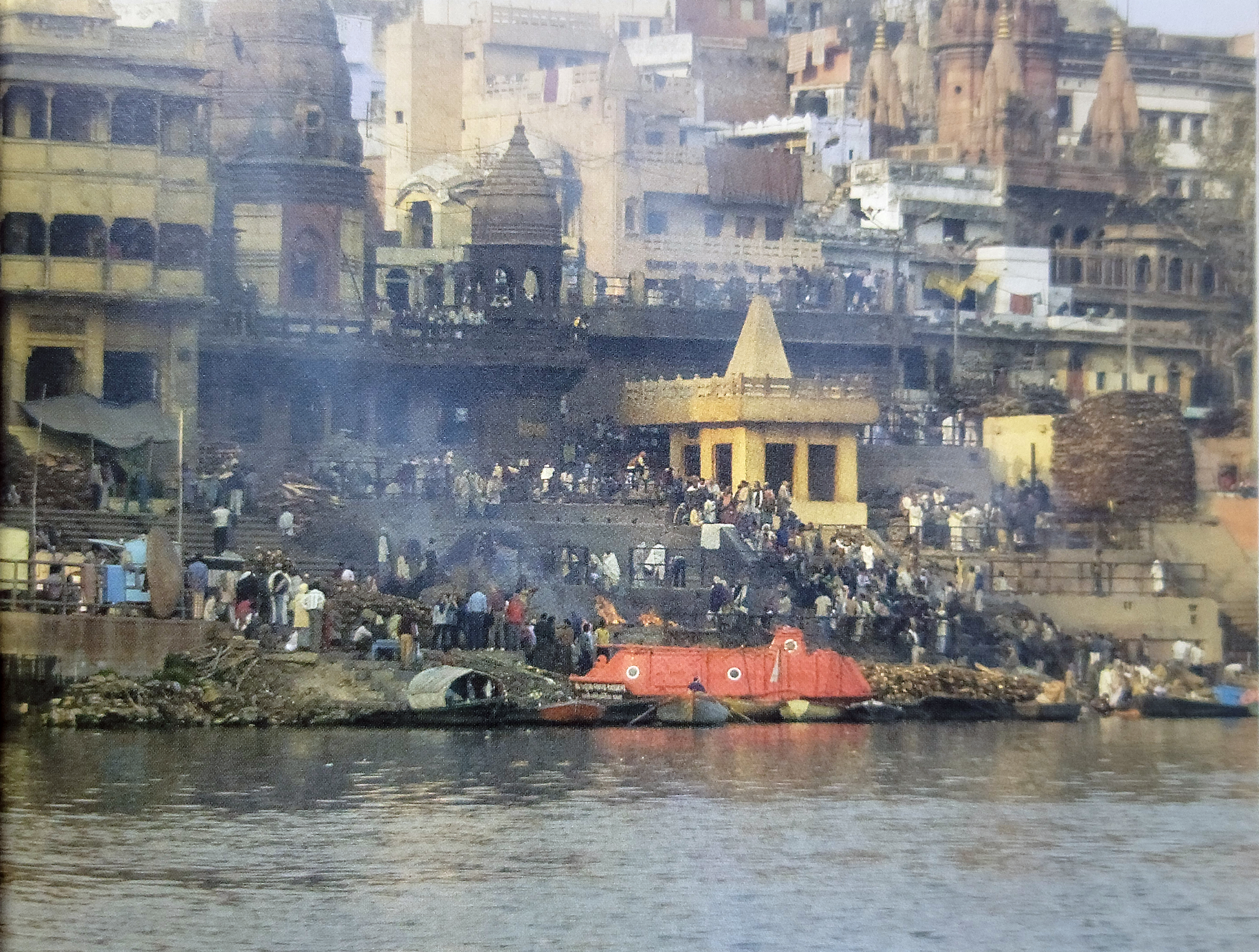 ▲ 바나라시 간지스 강의 화장터로서 가장 오래되고 가장 성스러운 곳으로 여겨지고 있는 마니카르니카 가트(Manikarnika Ghat). 시체들이 불타고 있다. 죽음과 삶이 항시 공존하고 있다. 접근촬영이 허용되질 않았다.