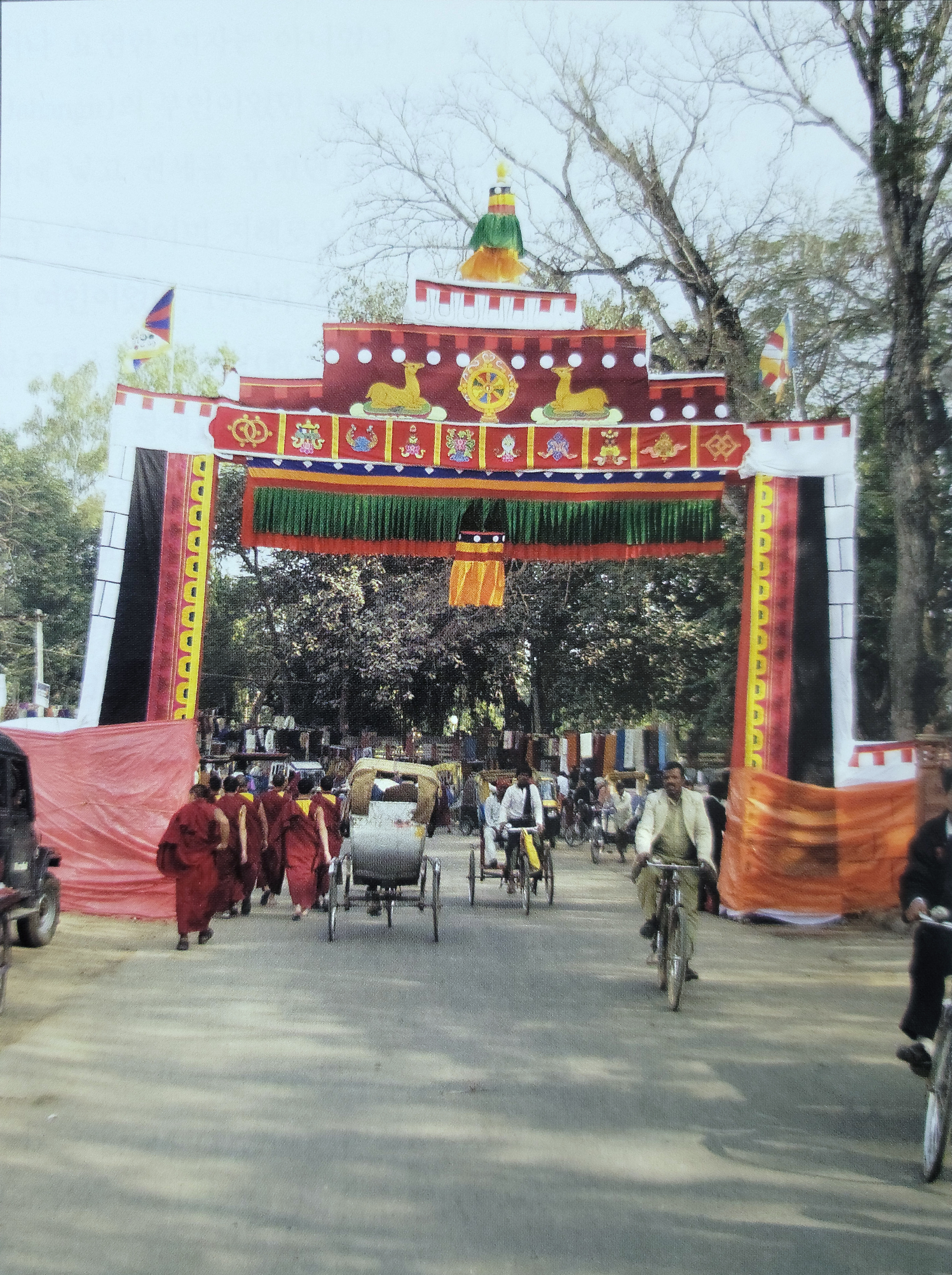 ▲ 보드가야시내의 정경. 티벹승려의 복장에서 치마같은 아랫도리가 샴탑이고 그 위에 걸친 것이 샌이다. 문안 오른쪽으로 티벹 노점상들이 보인다.