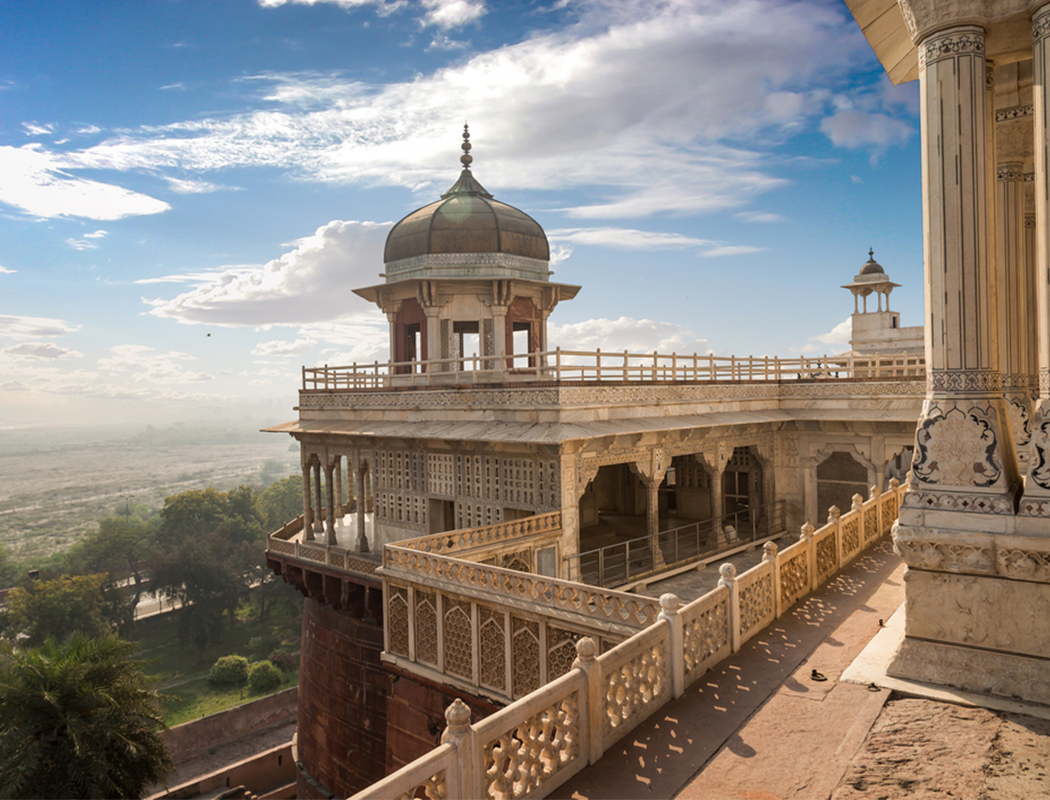 ▲ 아그라성의 8각형 옥탑, 무삼만 부르즈(Musamman Burj). 매우 정교한 삐에트라 듀라 기법으로 장식되었다. 이 탑에서 내다 보이는 강이 야무나 강이다. 이 야무나 강의 안개속에 웅장한 따즈 마할이 보인다. 큰 딸 자하나라(Jahanara)가 그의 눈물겨운 8년의 세월을 지켰다.